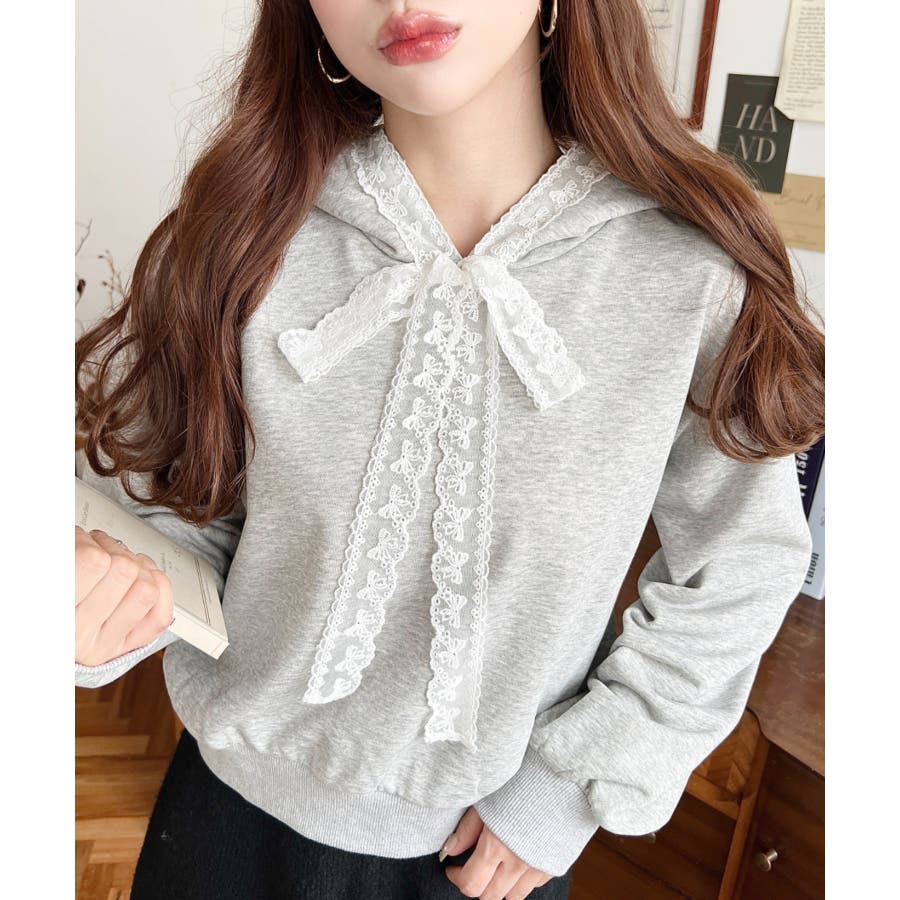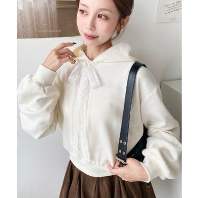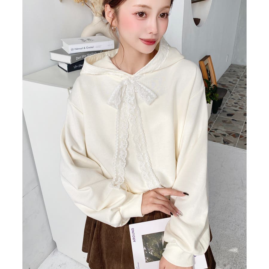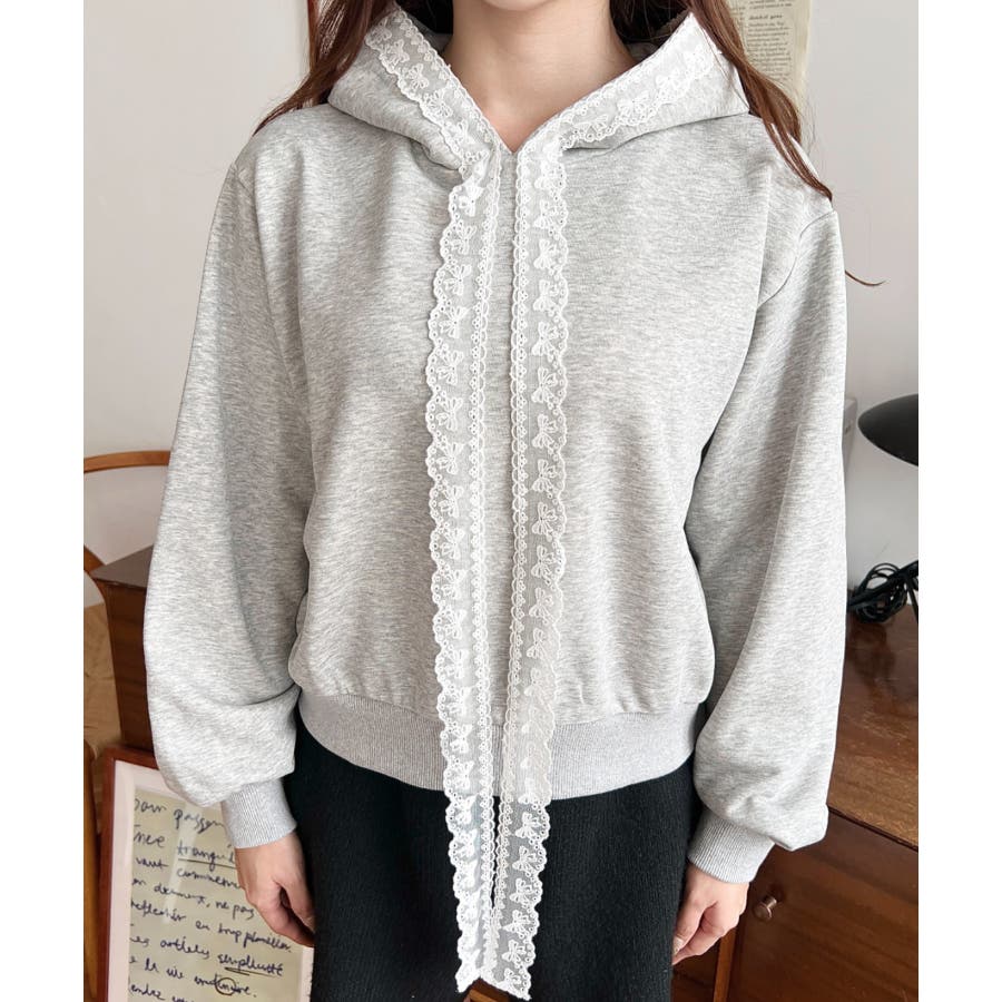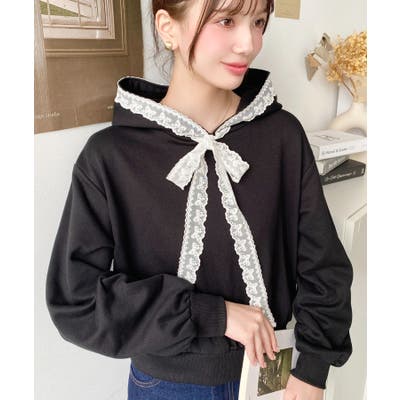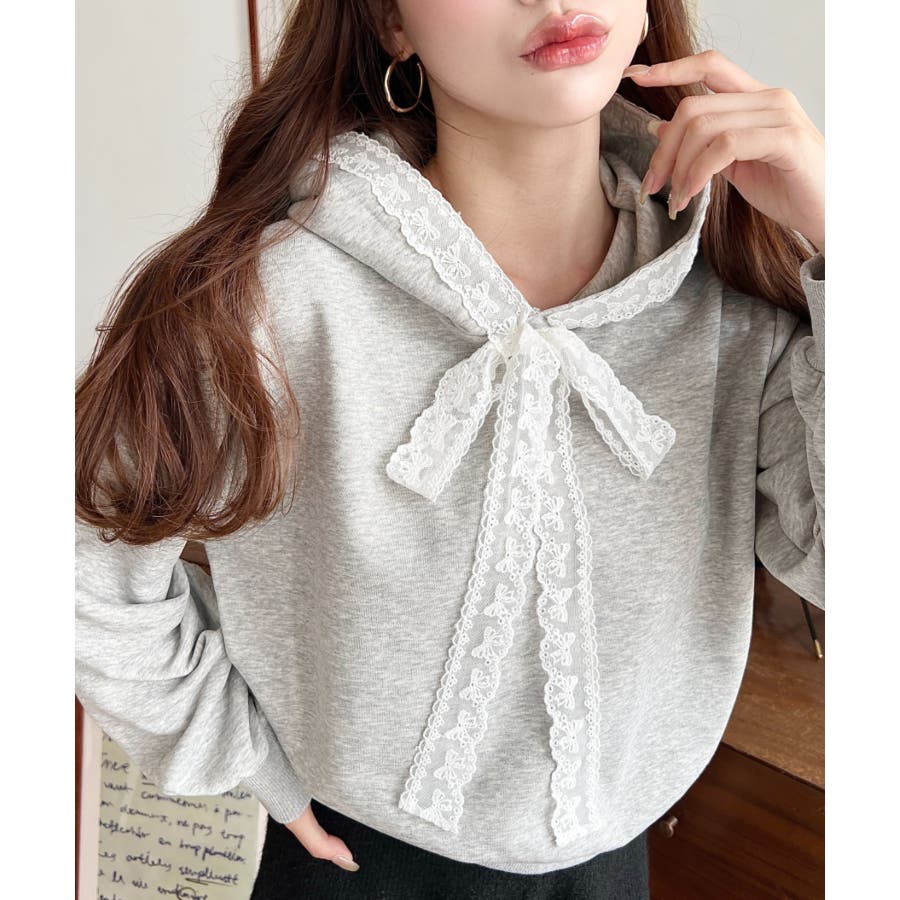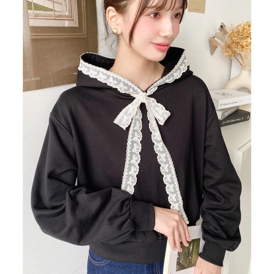 ・シンプルなボディにレースリボンが映えて、ラフなパーカーを華やかに格上げしてくれます。