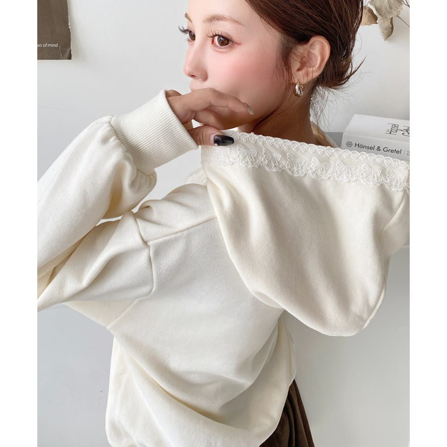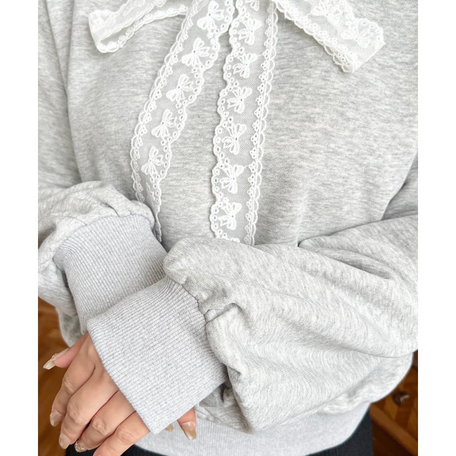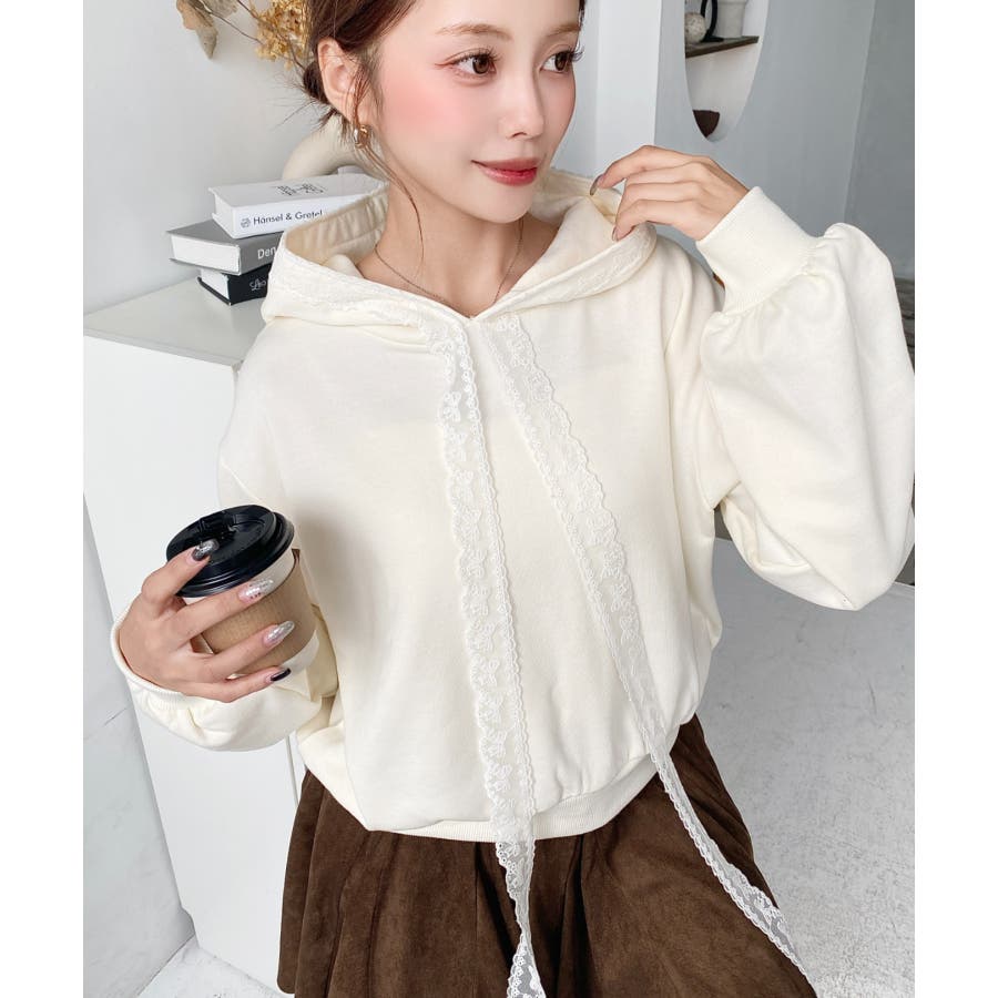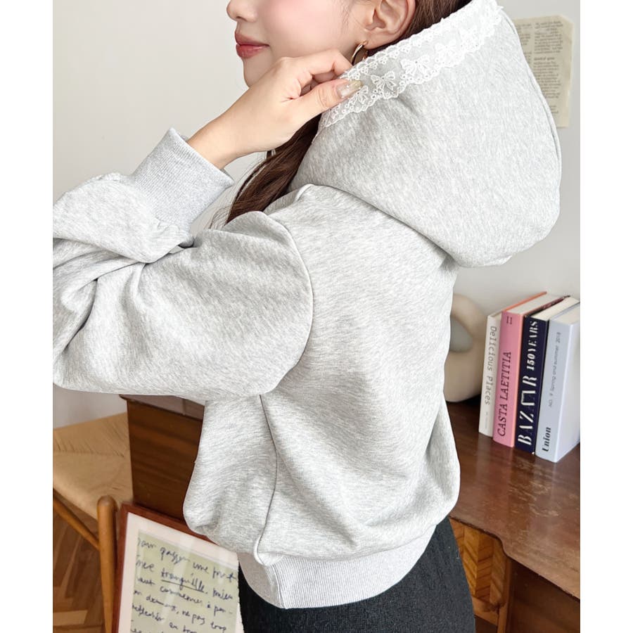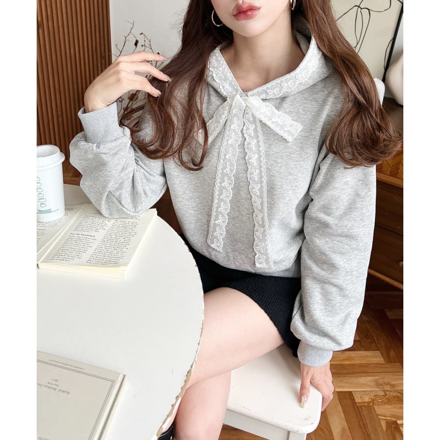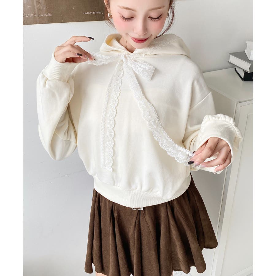 ・シンプルなボディにレースリボンが映えて、ラフなパーカーを華やかに格上げしてくれます。