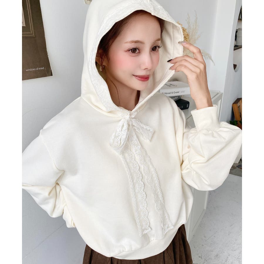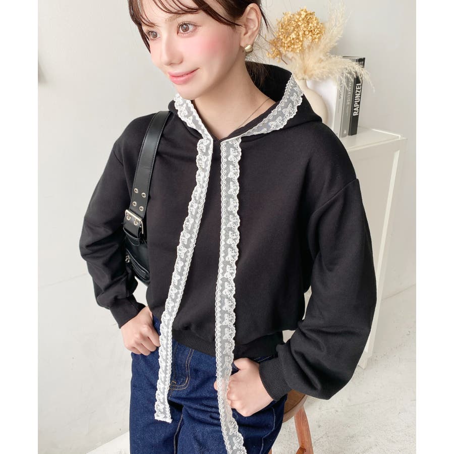 【レースリボンで魅せる、甘辛バランスの大人可愛いショートフーディー◎】