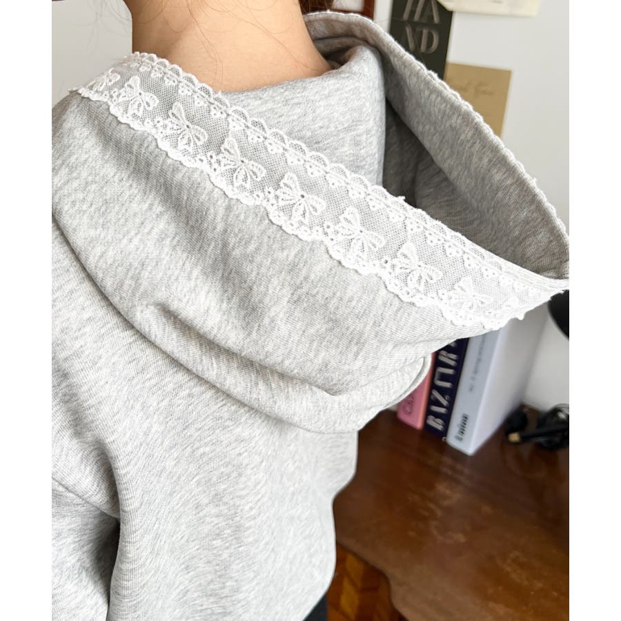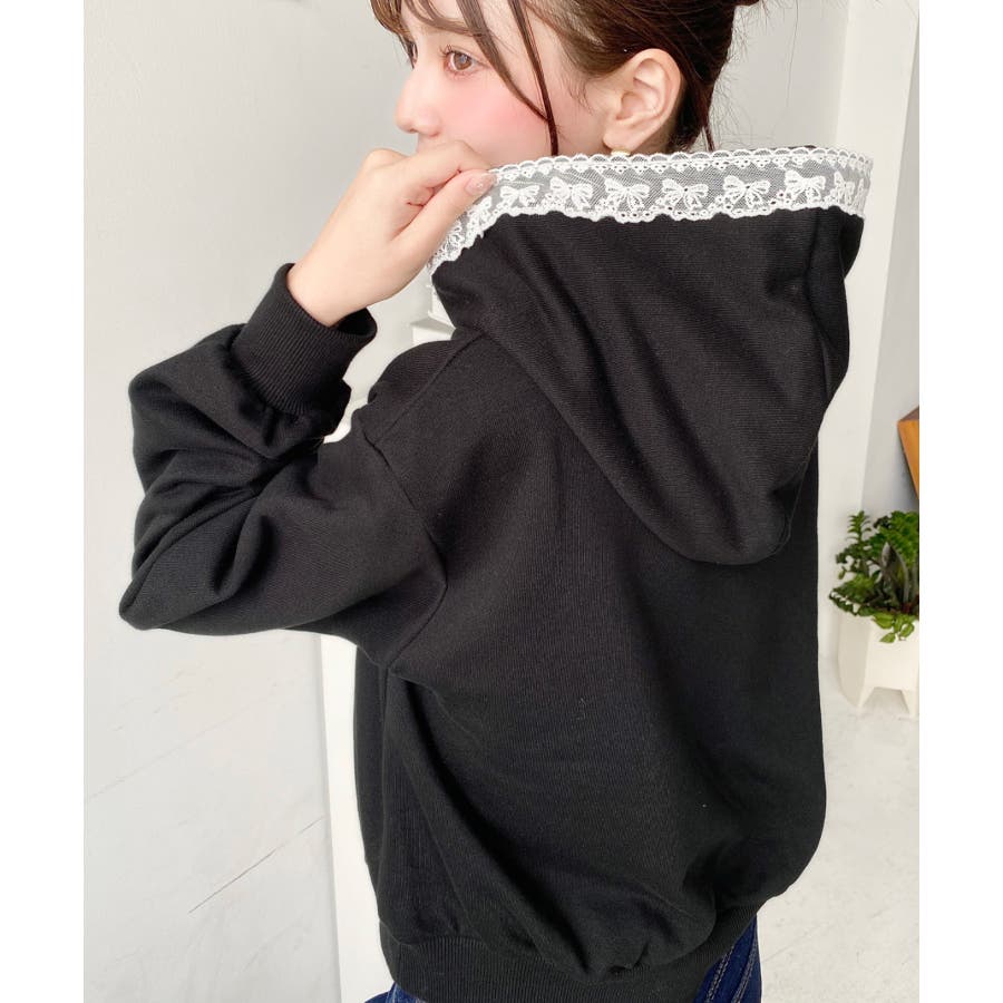 ・フードのドロスト部分にレースリボンをあしらった、フェミニンなアクセントが魅力。