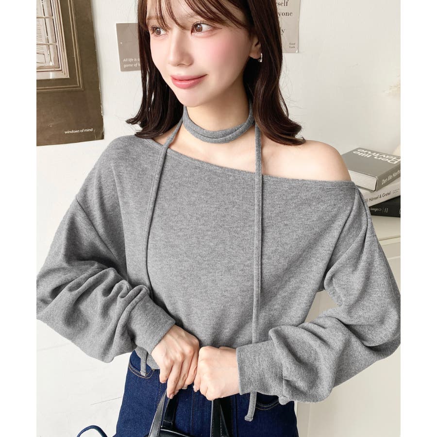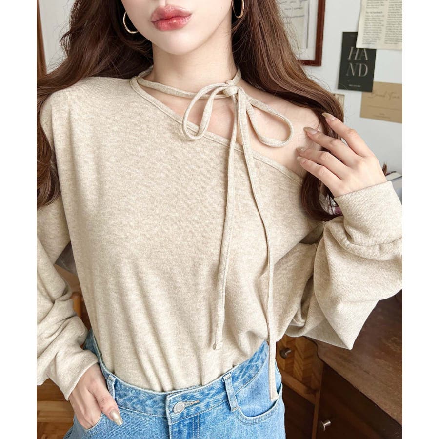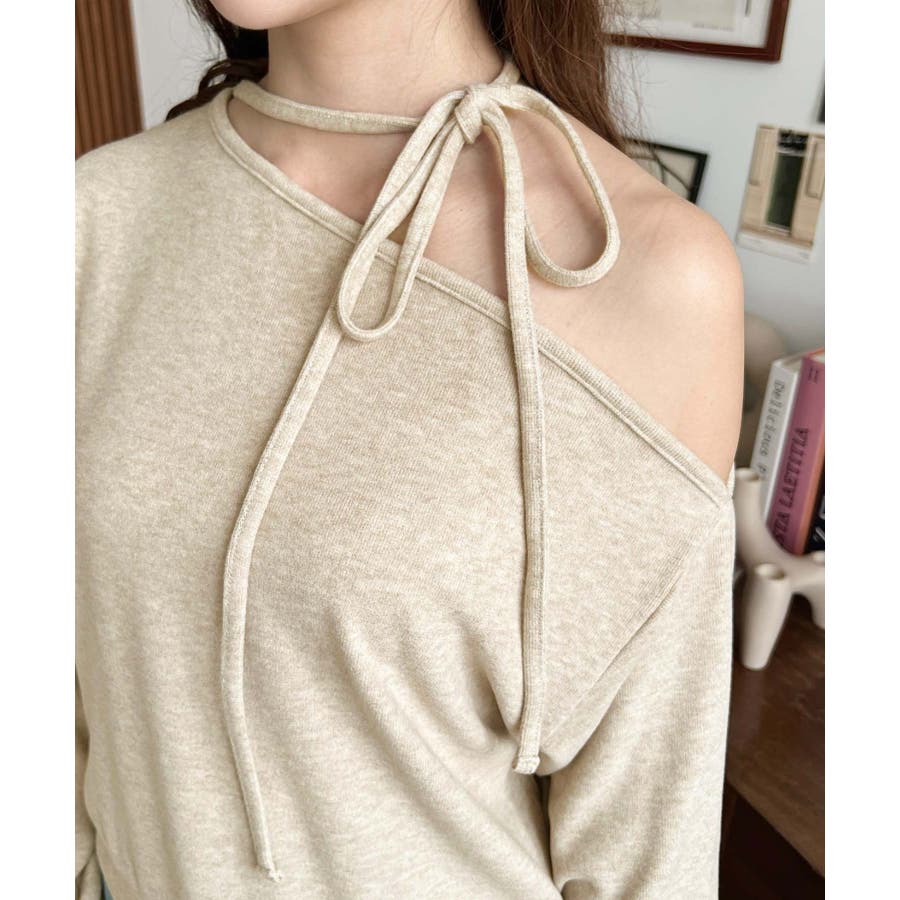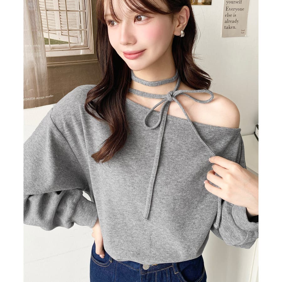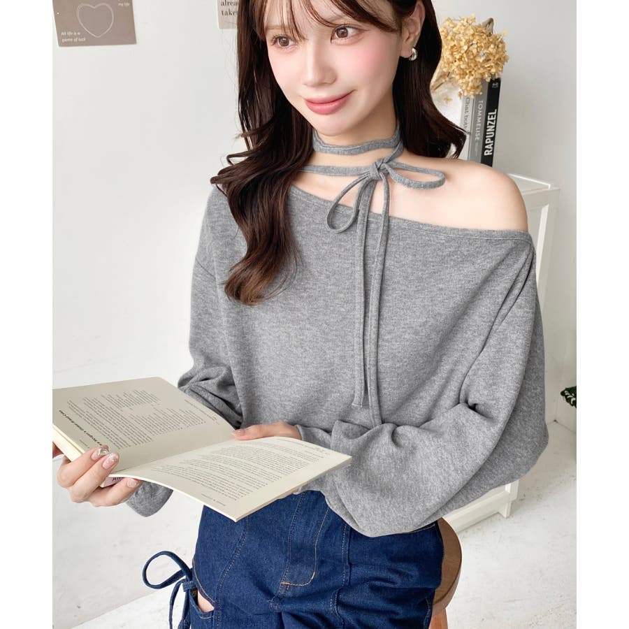 ・ワンショルダーとチョーカーネックにリボンをあしらった個性派ニットプルオーバー。