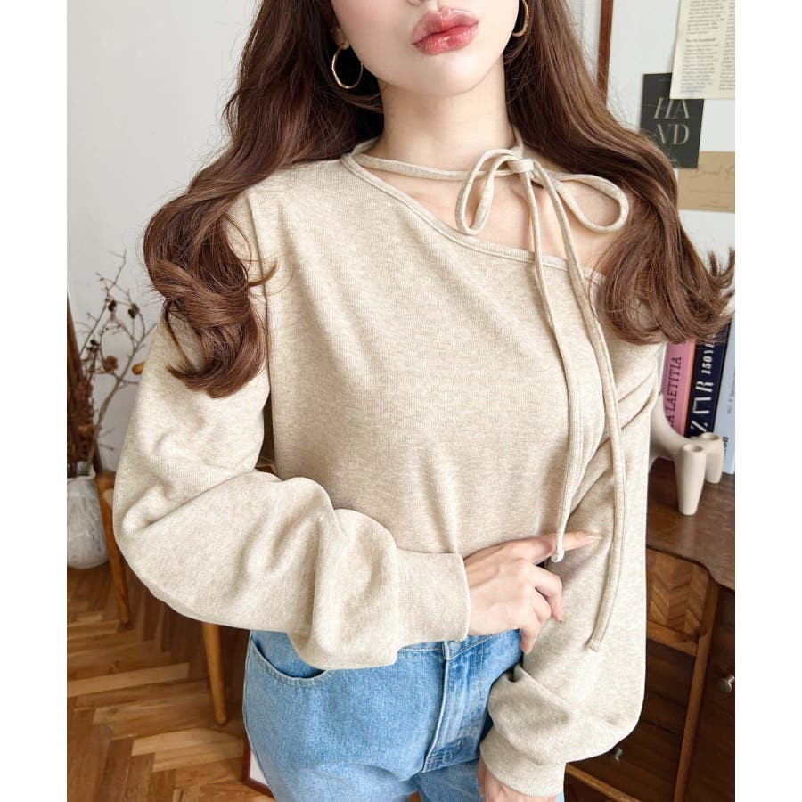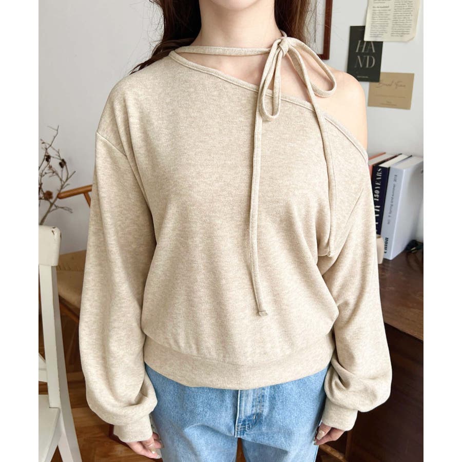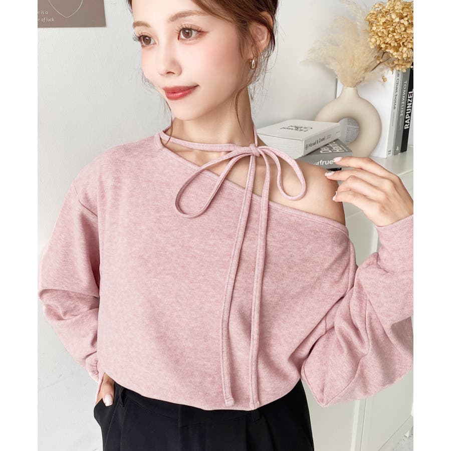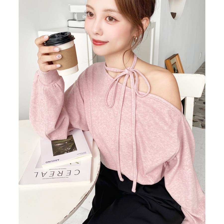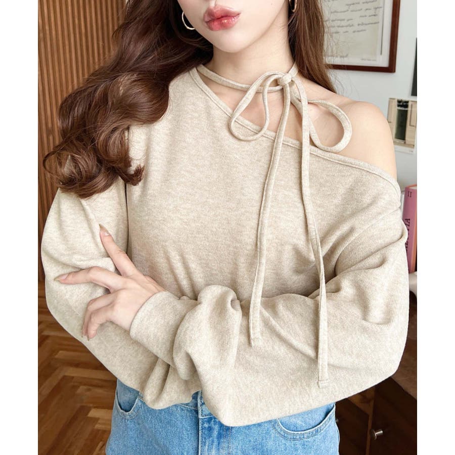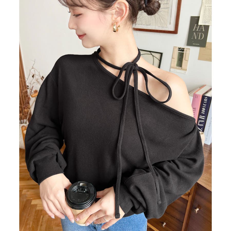 ・ワンショルダーとチョーカーネックにリボンをあしらった個性派ニットプルオーバー。