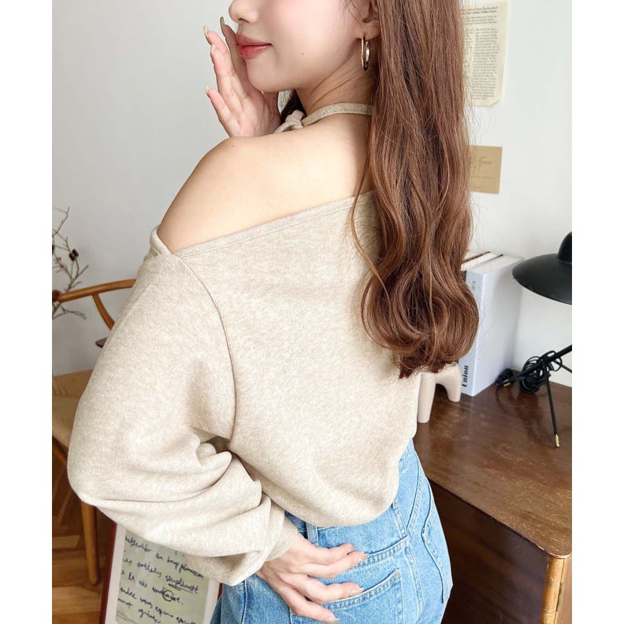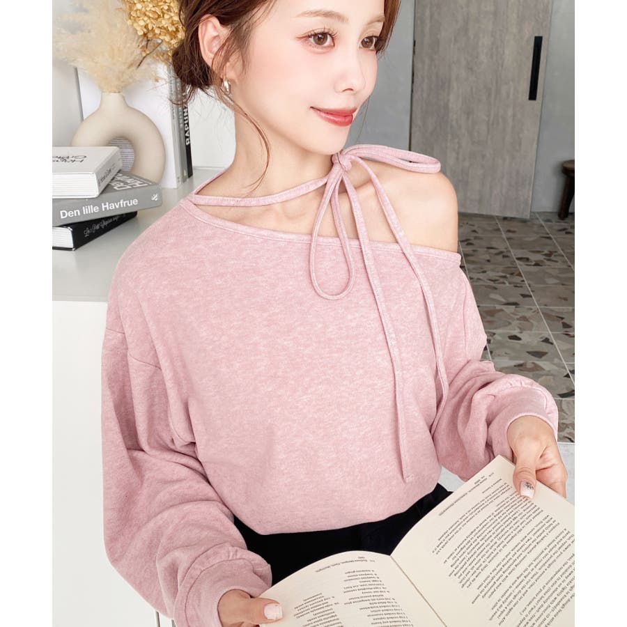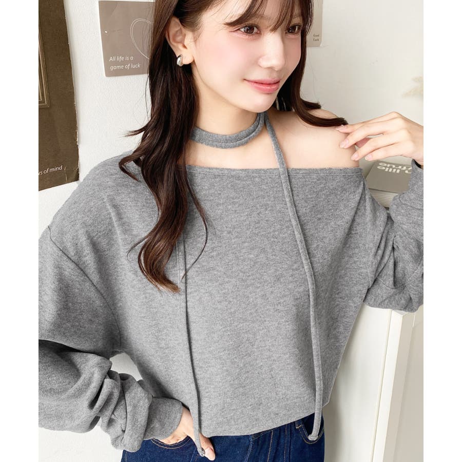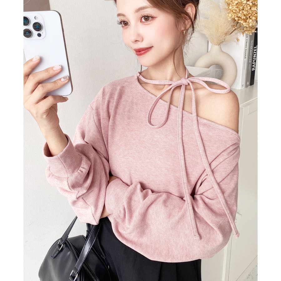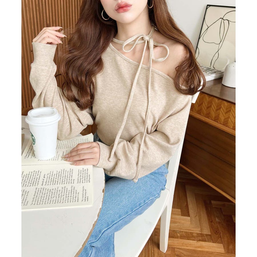 ・ワンショルダーとチョーカーネックにリボンをあしらった個性派ニットプルオーバー。