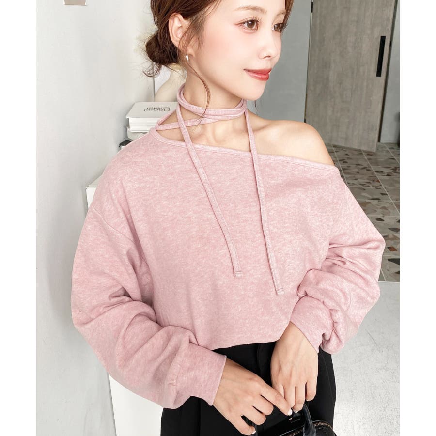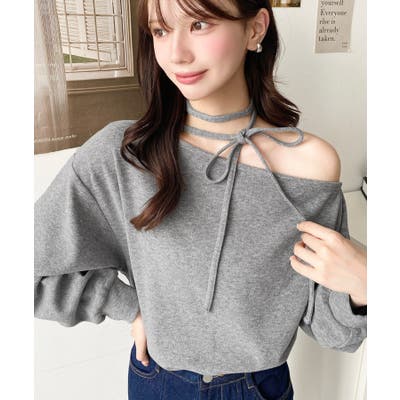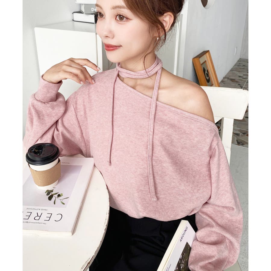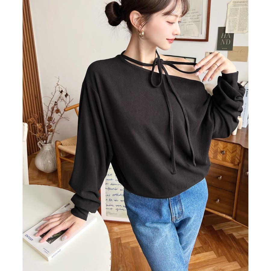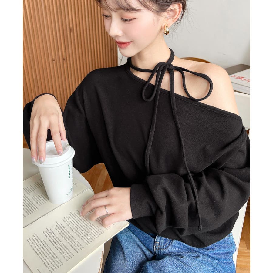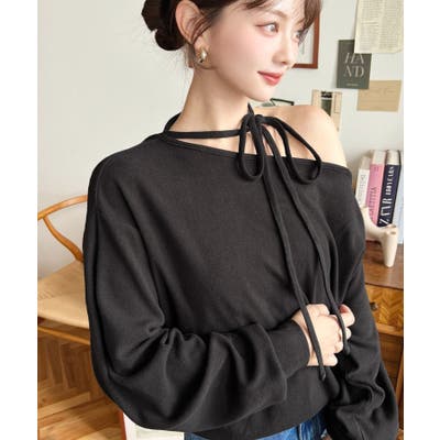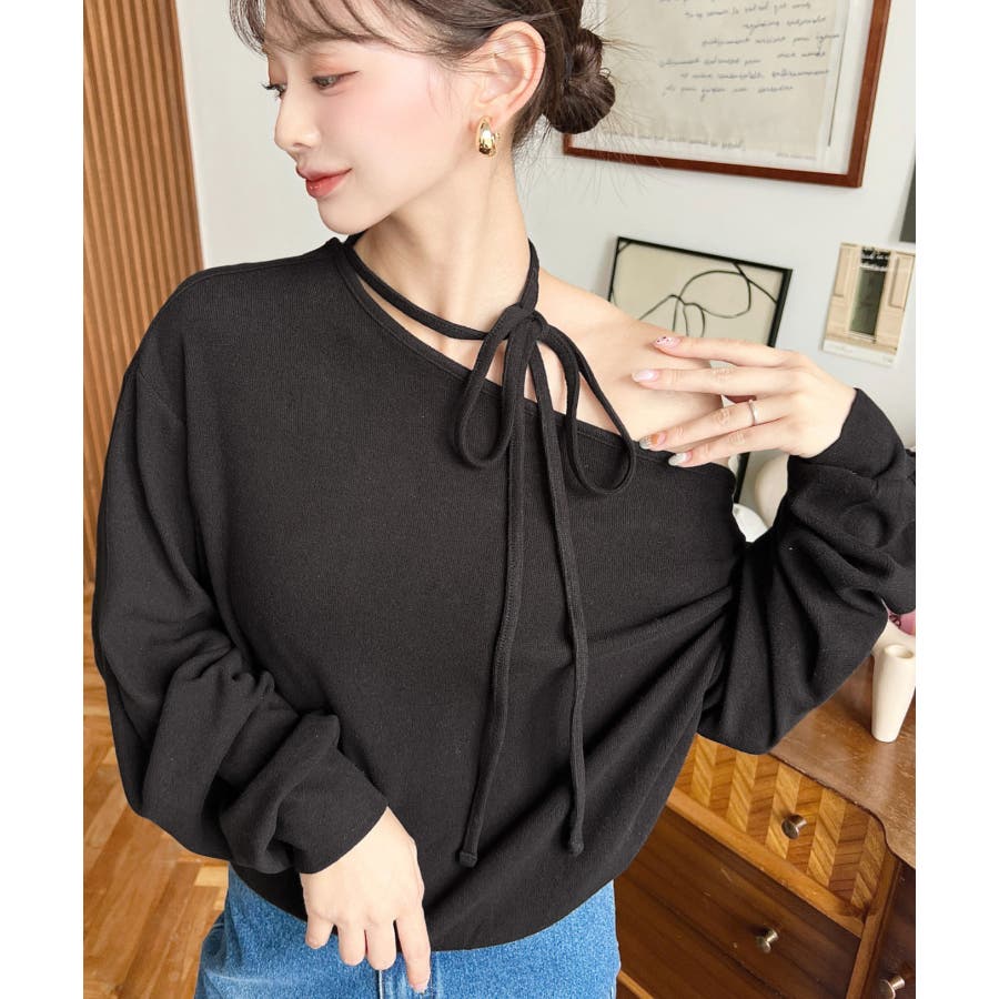 ストラップチョーカーネックリボンアシメワンショルダーニットプルオーバー