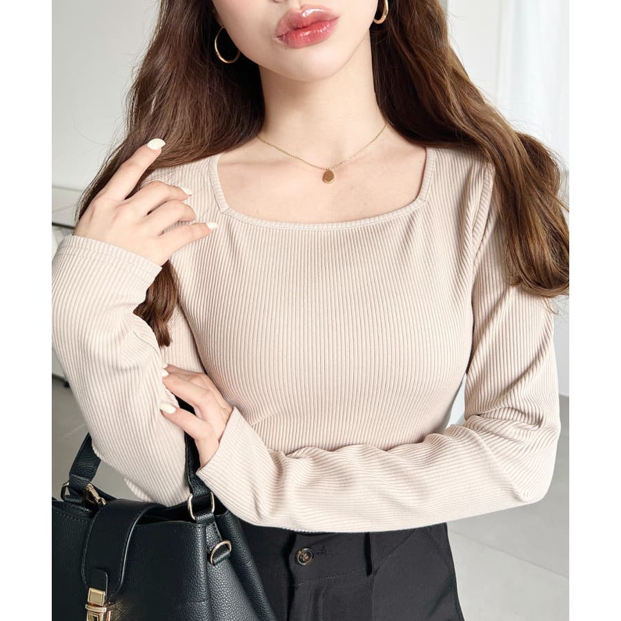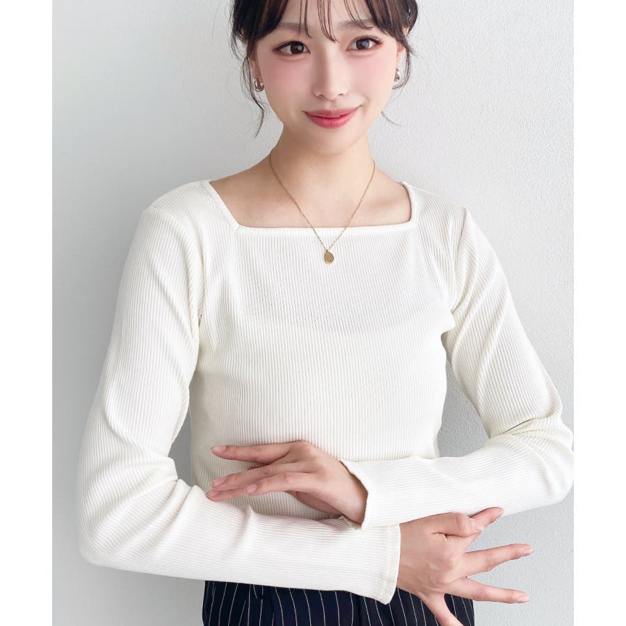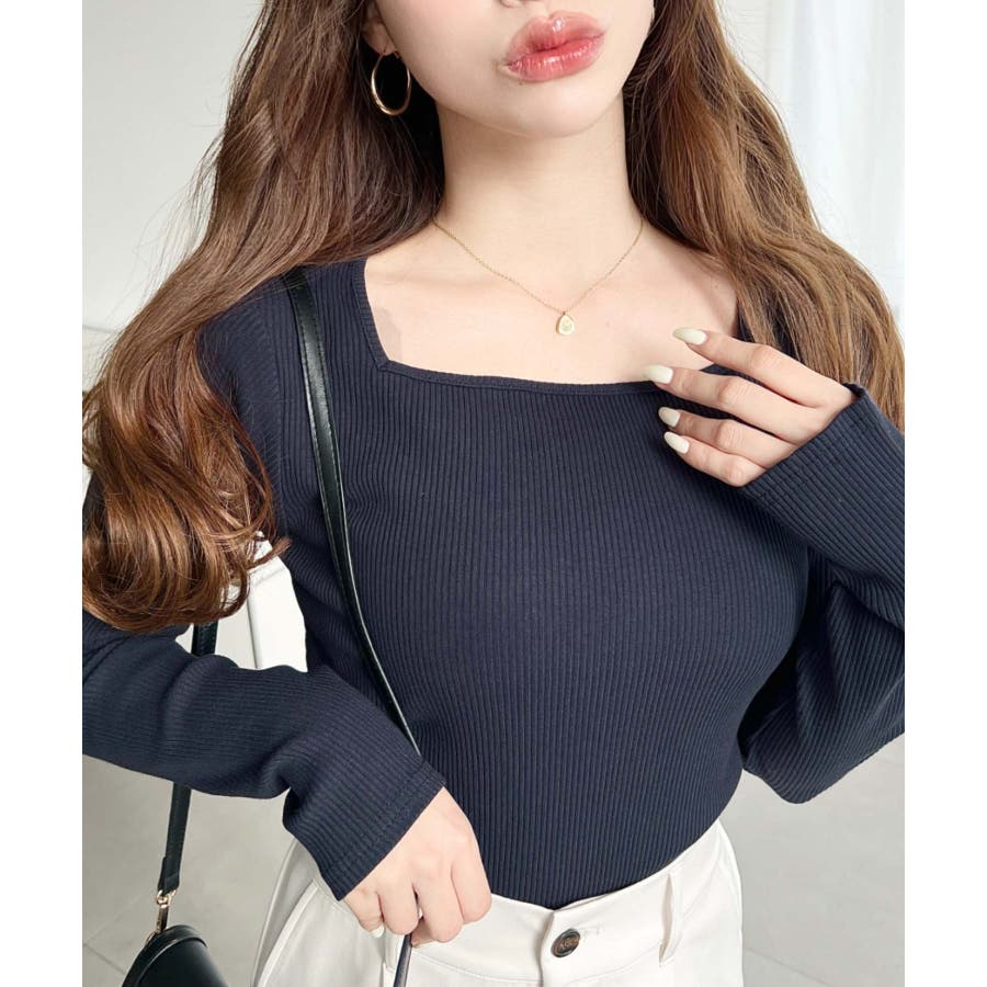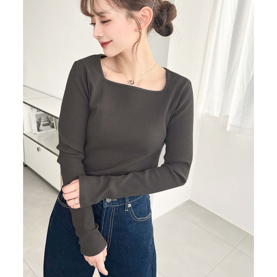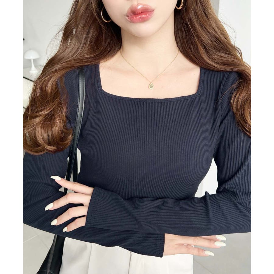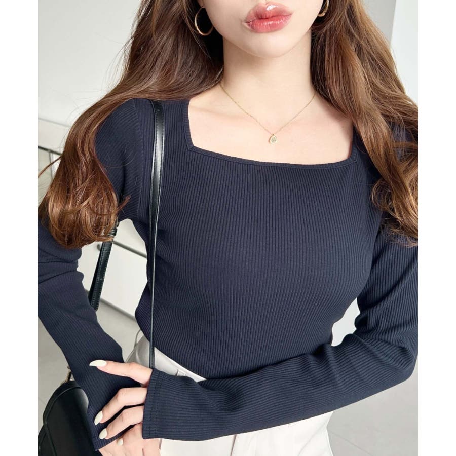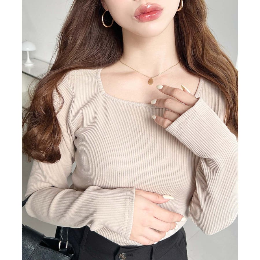 ・スクエアネックがデコルテラインを美しく引き立て、顔まわりをすっきりと見せてくれる長袖リブトップス◎