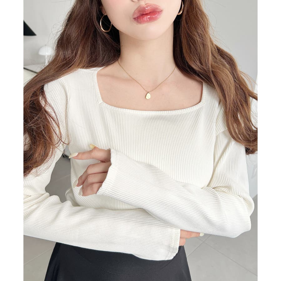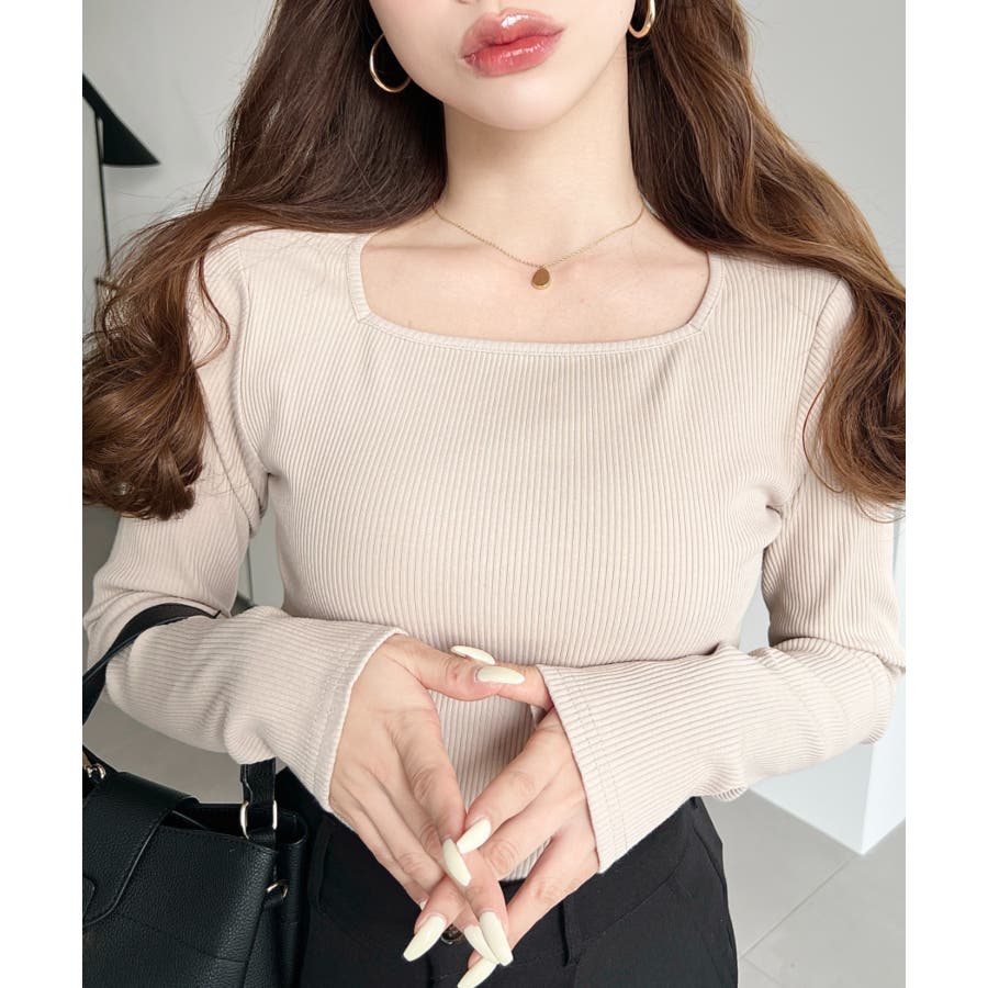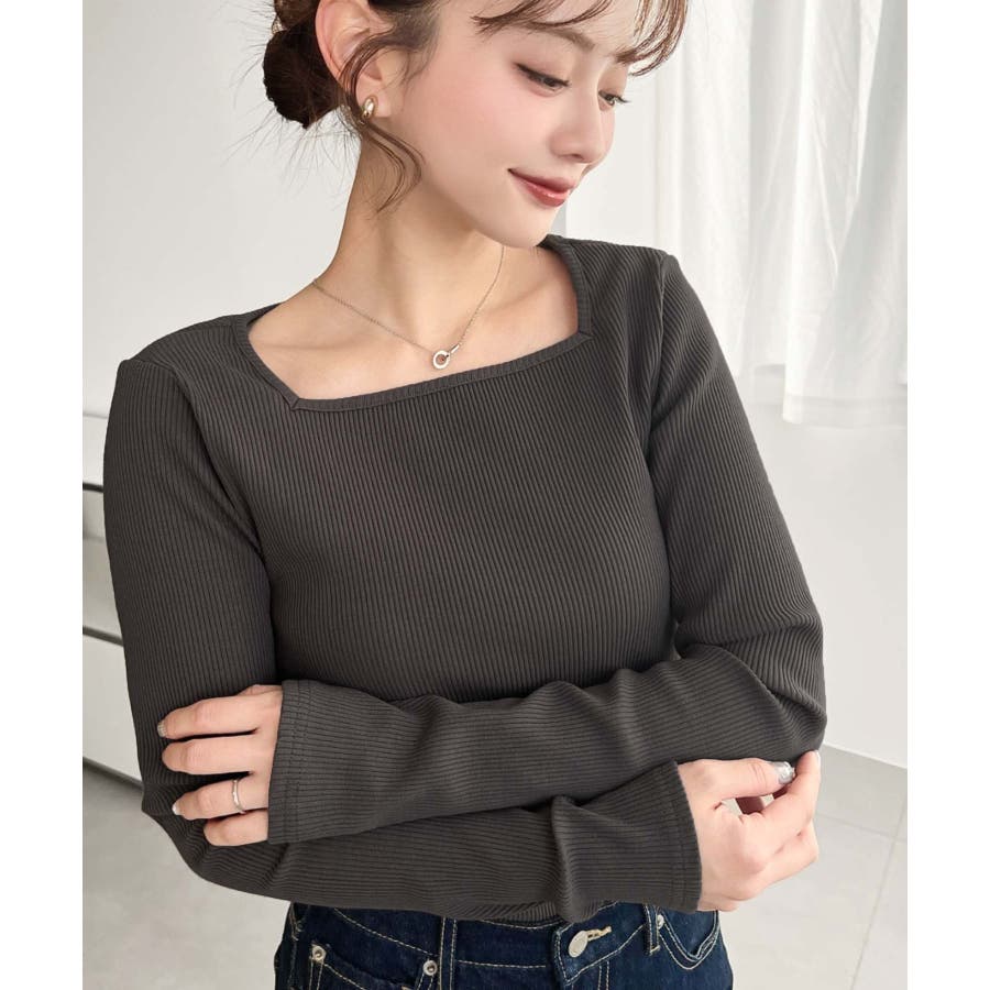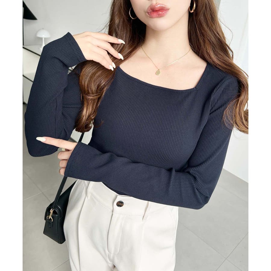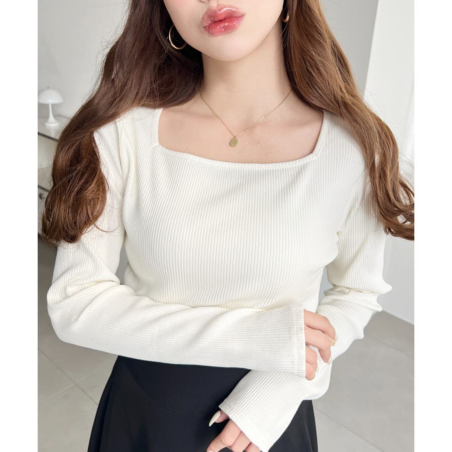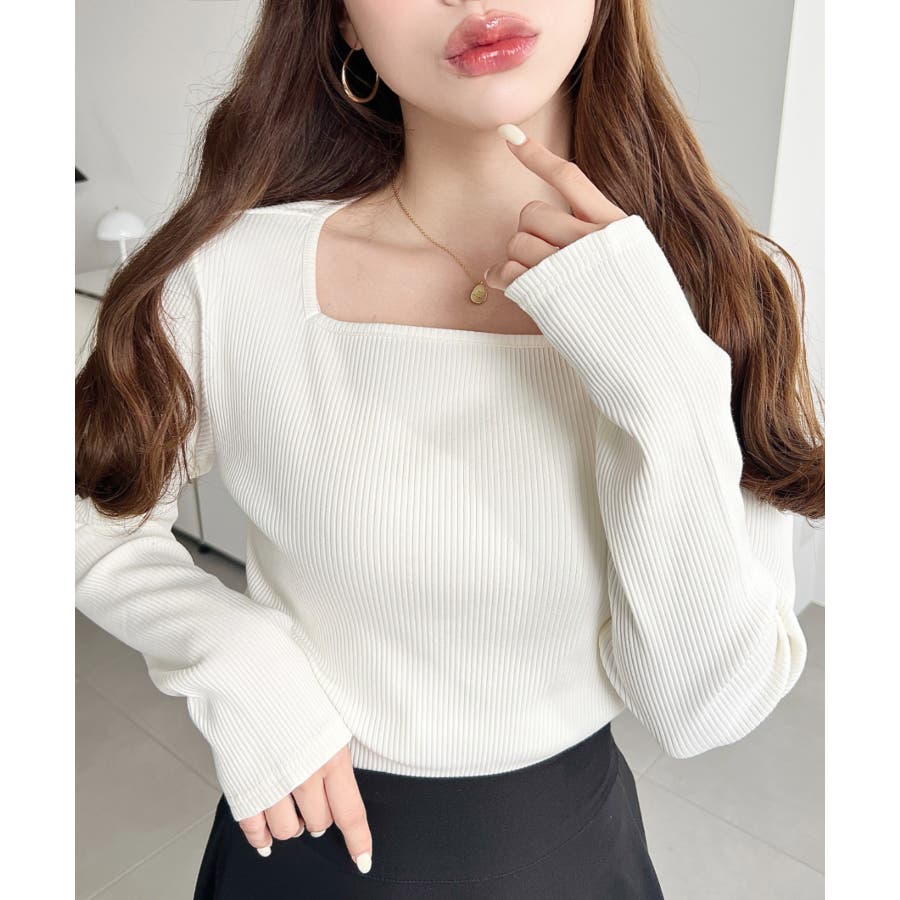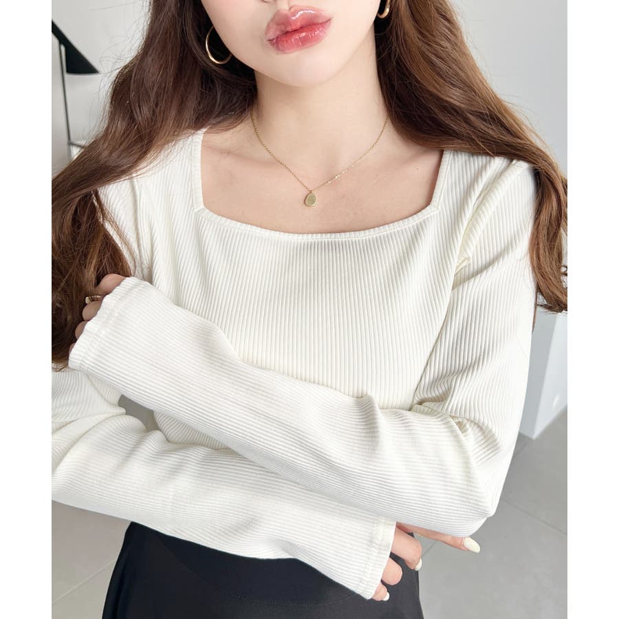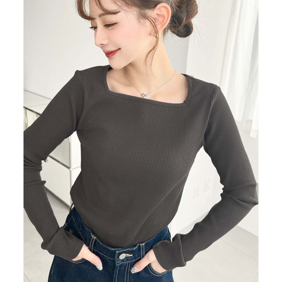 ・スクエアネックがデコルテラインを美しく引き立て、顔まわりをすっきりと見せてくれる長袖リブトップス◎