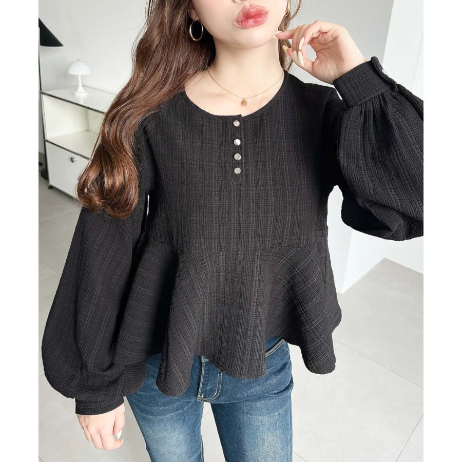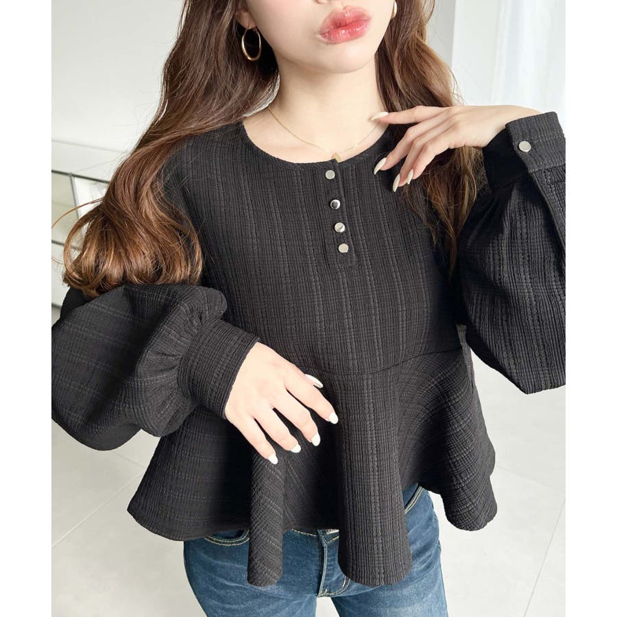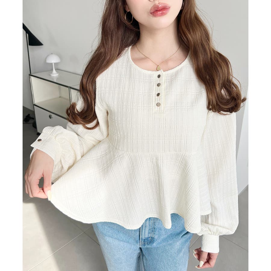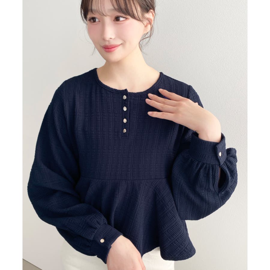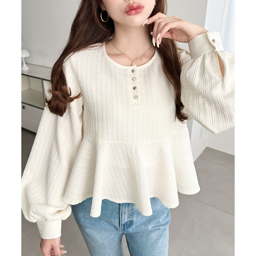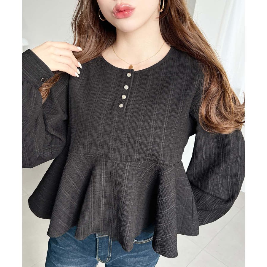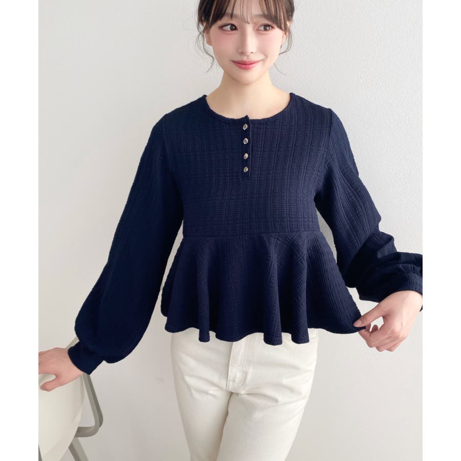 ・ヘンリーネックボタンの開閉で首元の印象を調整でき、甘くなりがちなペプラムシルエットも大人っぽく着こなせるデザインです。