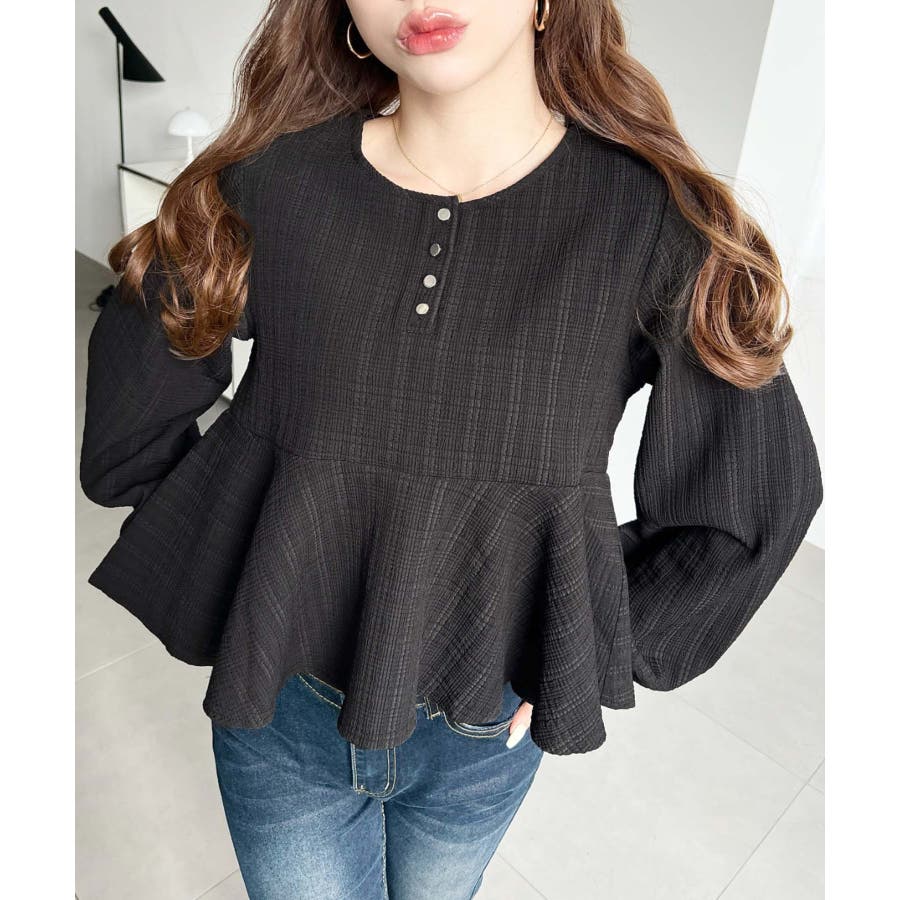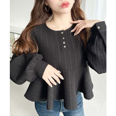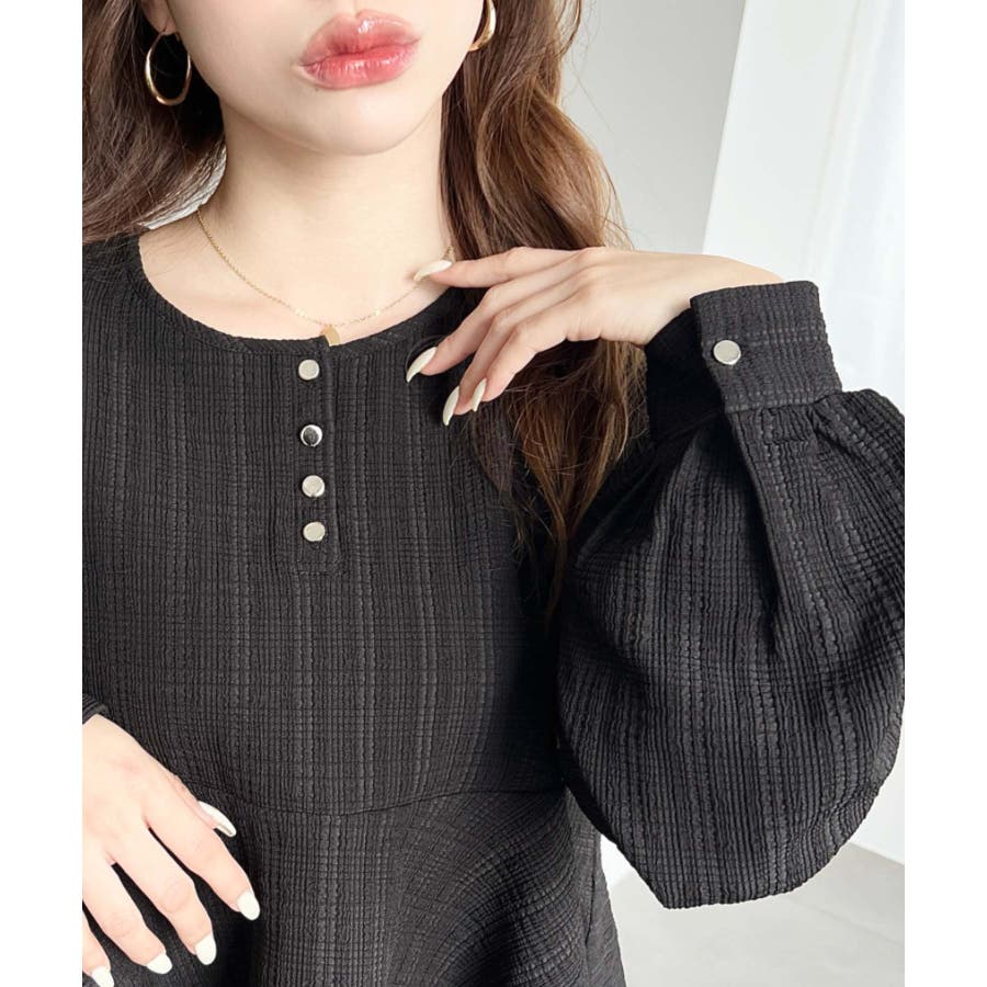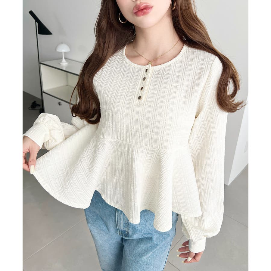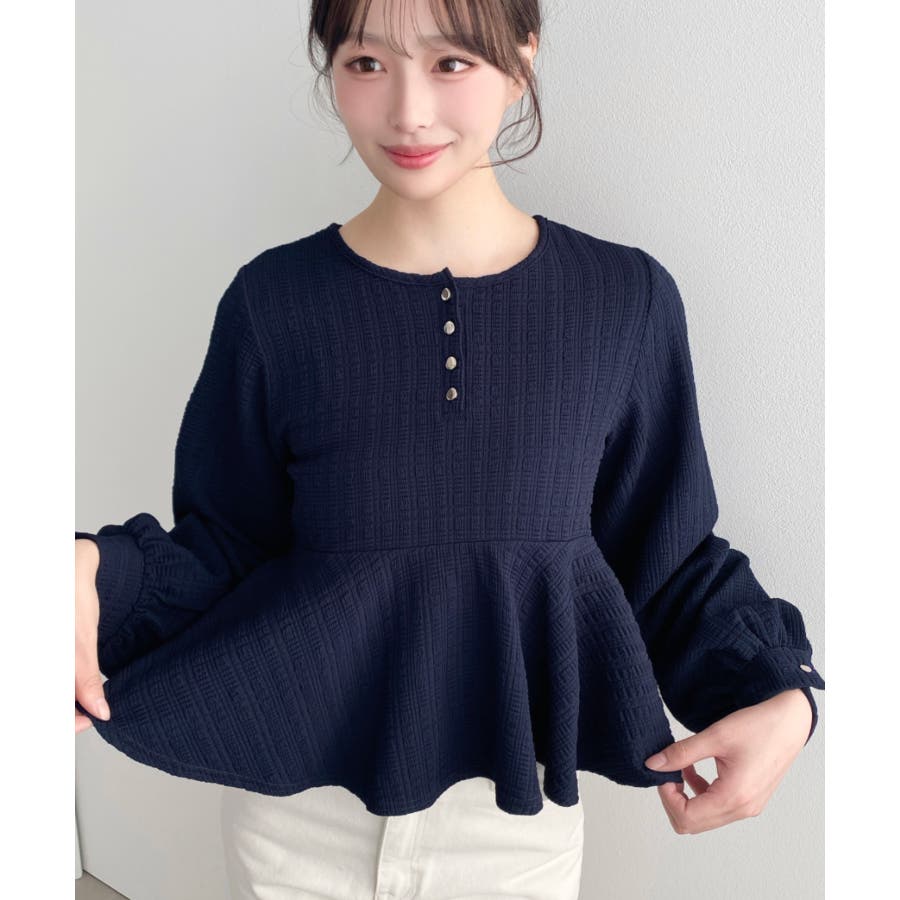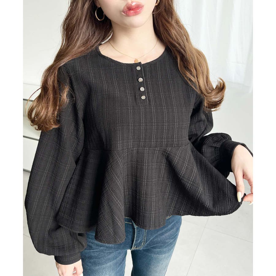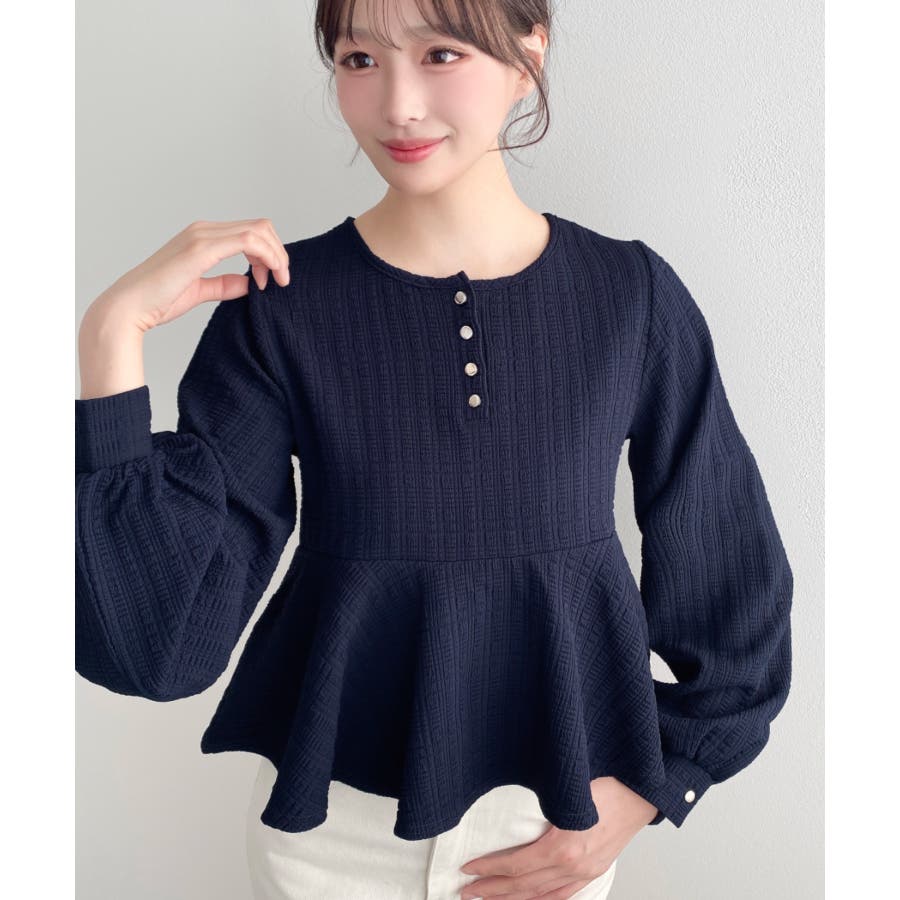・ヘンリーネックボタンの開閉で首元の印象を調整でき、甘くなりがちなペプラムシルエットも大人っぽく着こなせるデザインです。