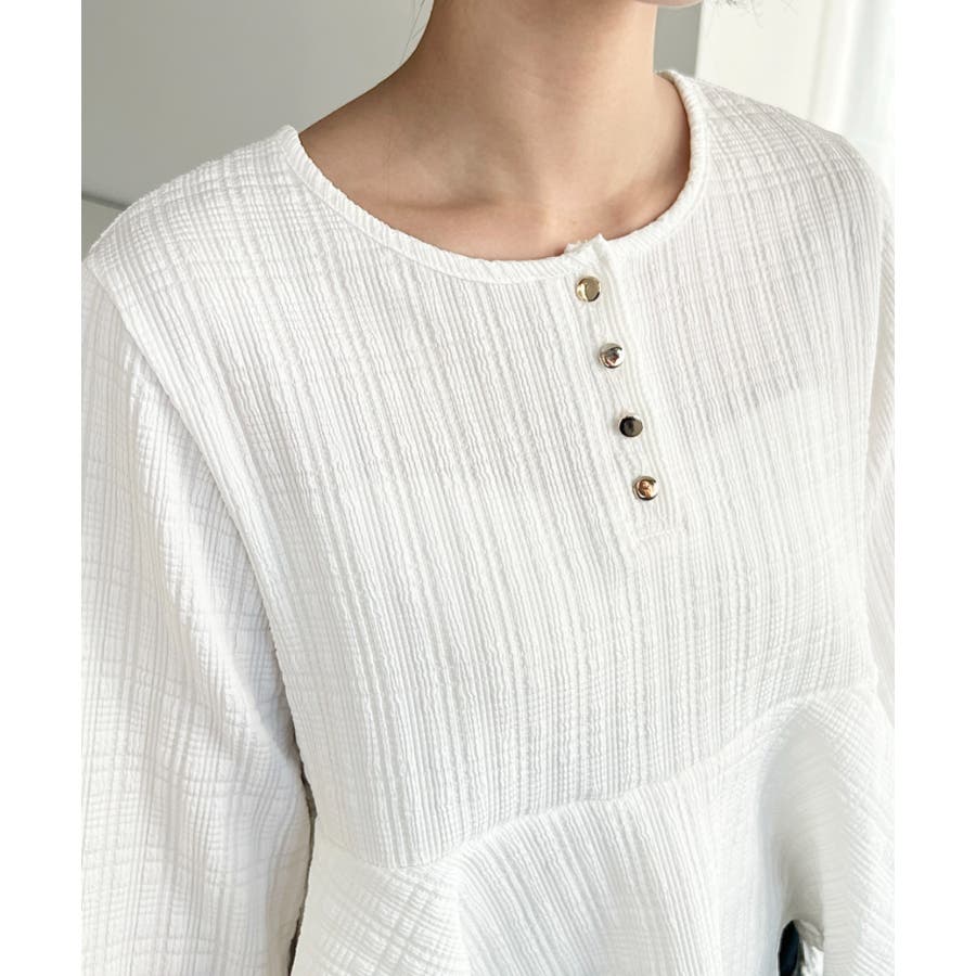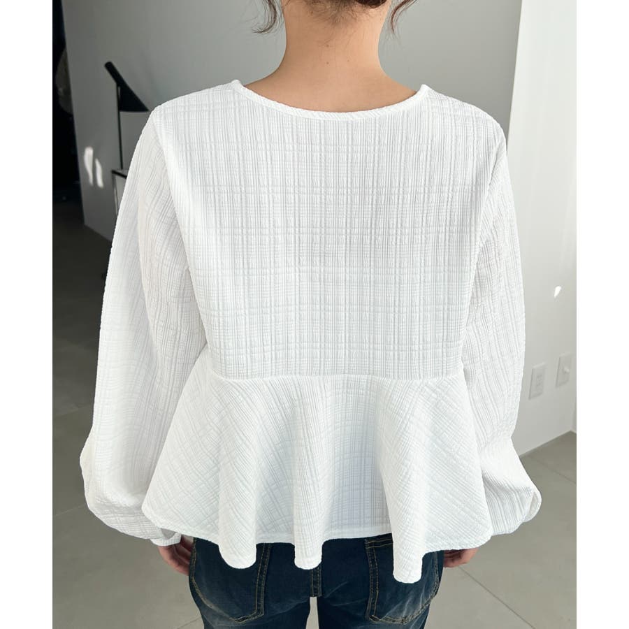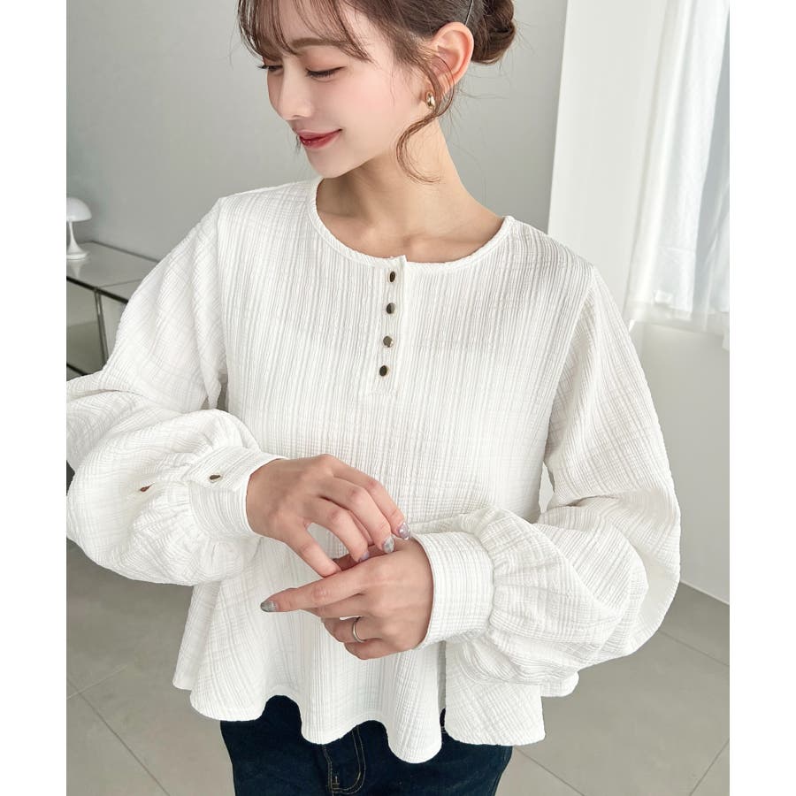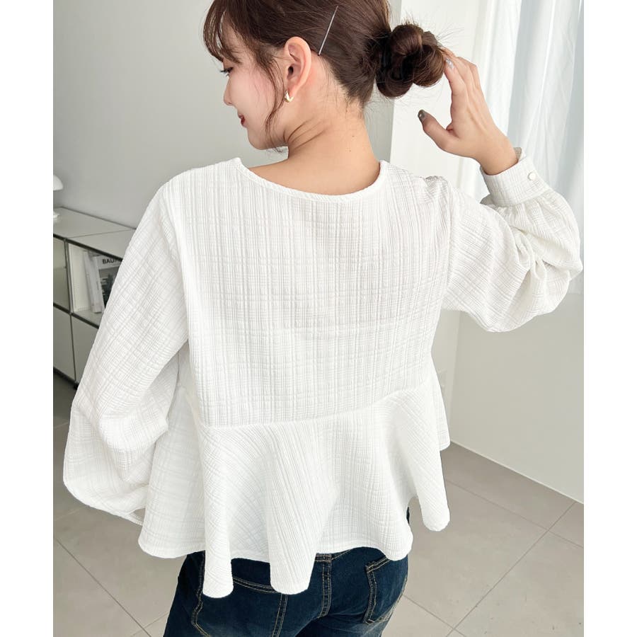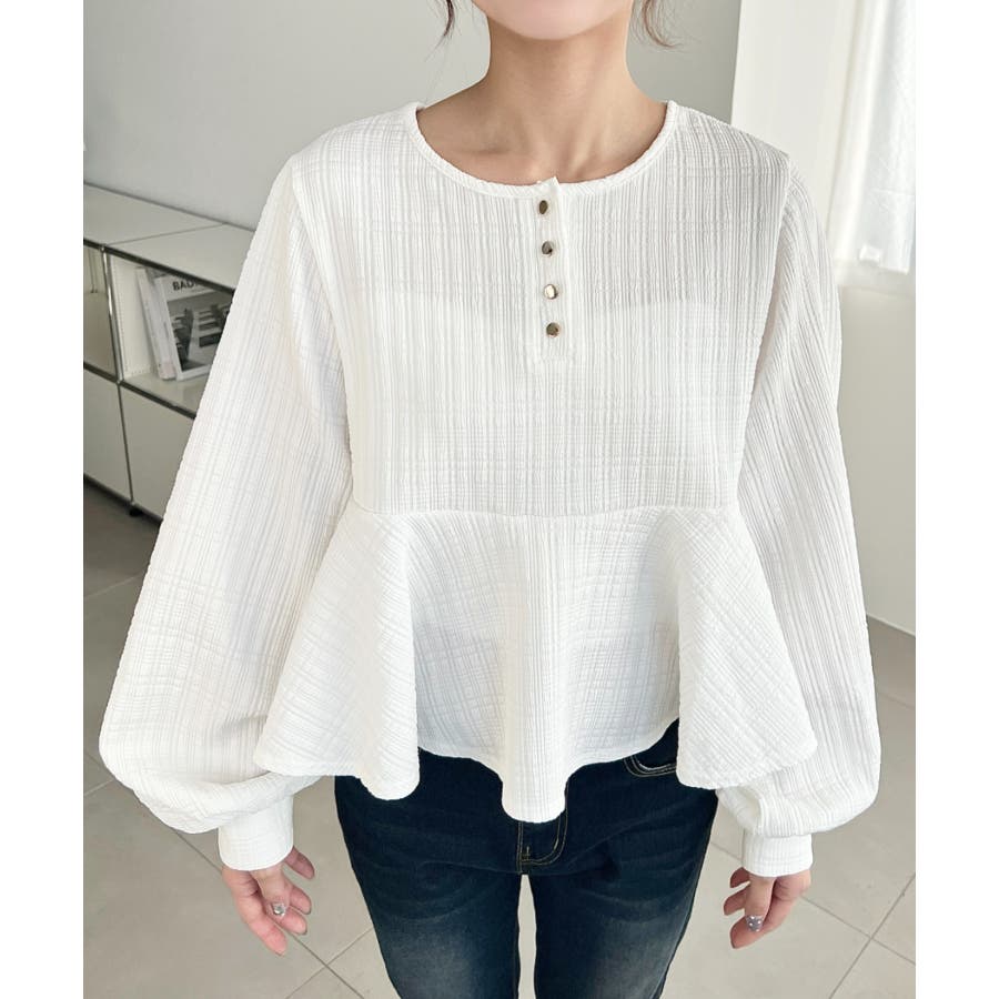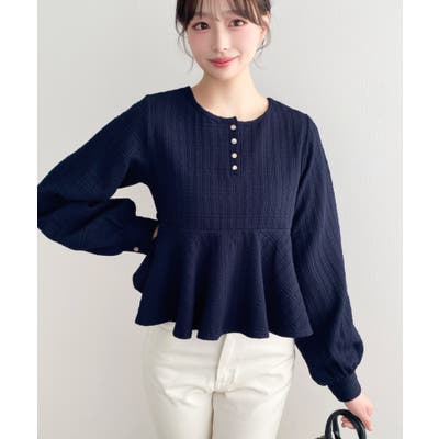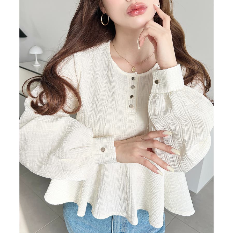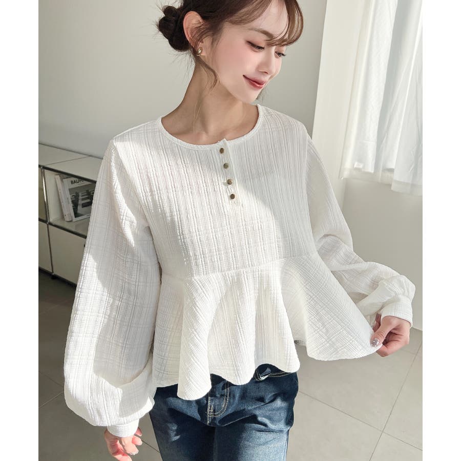 ・ヘンリーネックボタンの開閉で首元の印象を調整でき、甘くなりがちなペプラムシルエットも大人っぽく着こなせるデザインです。