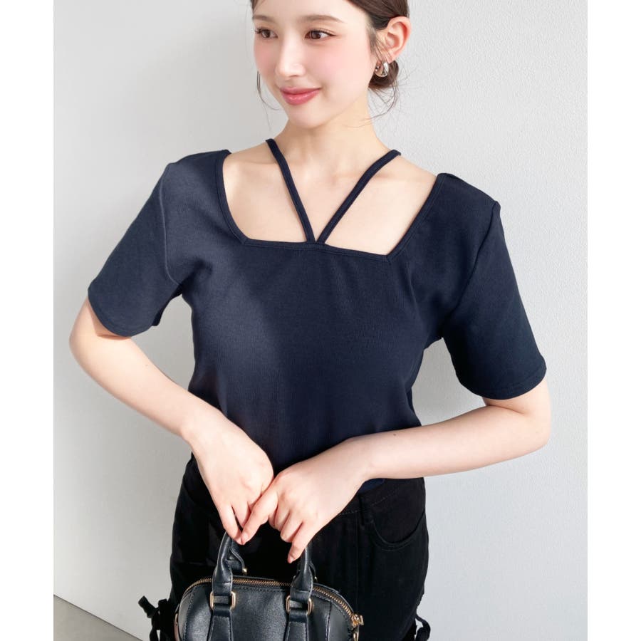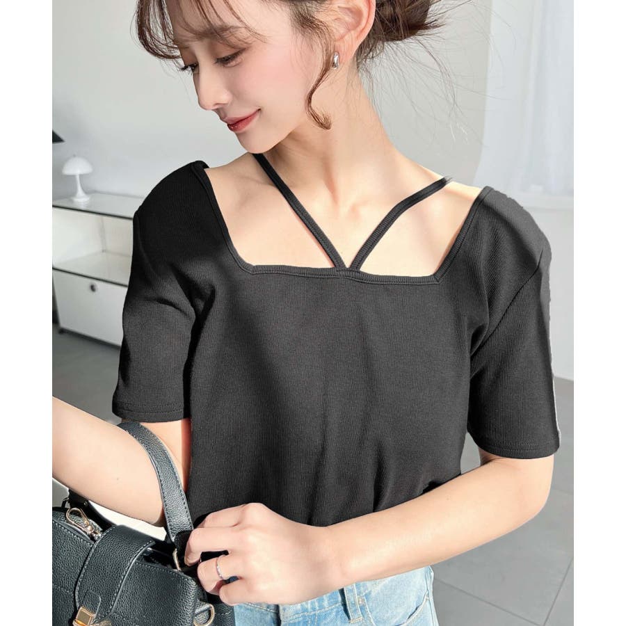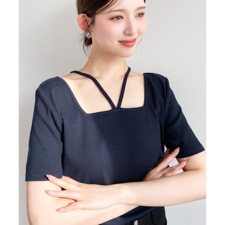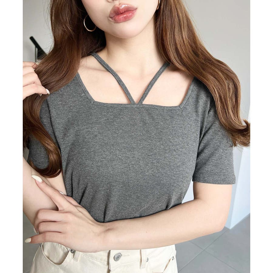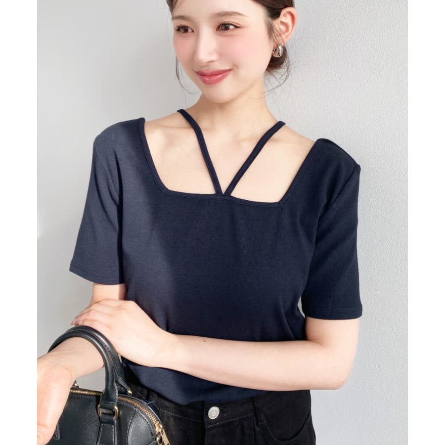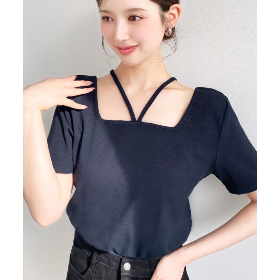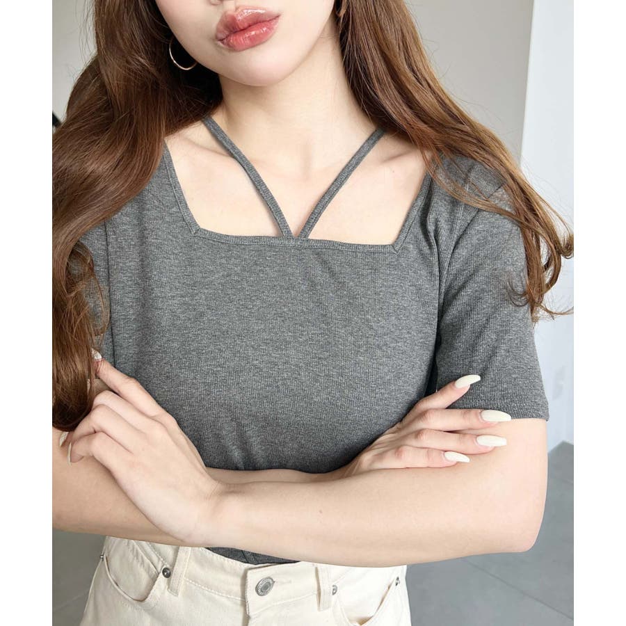 ・デコルテラインをすっきりとスクエアネックと、トレンド感のあるホルターネックを組み合わせたデザイン◎