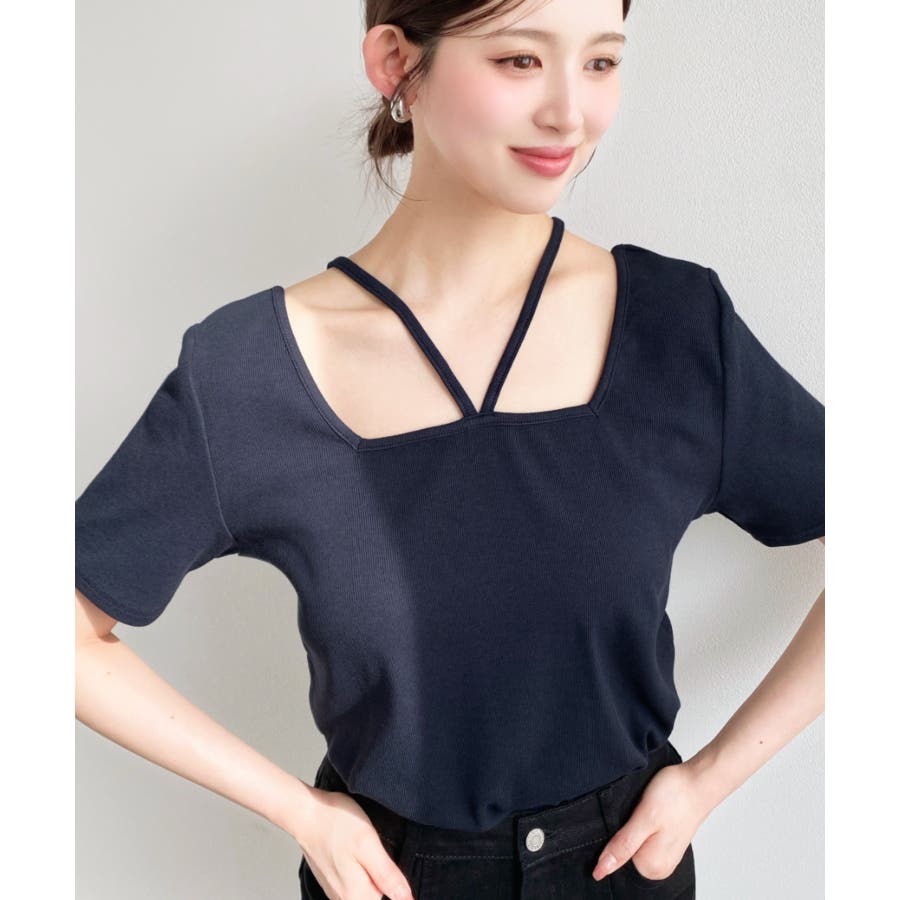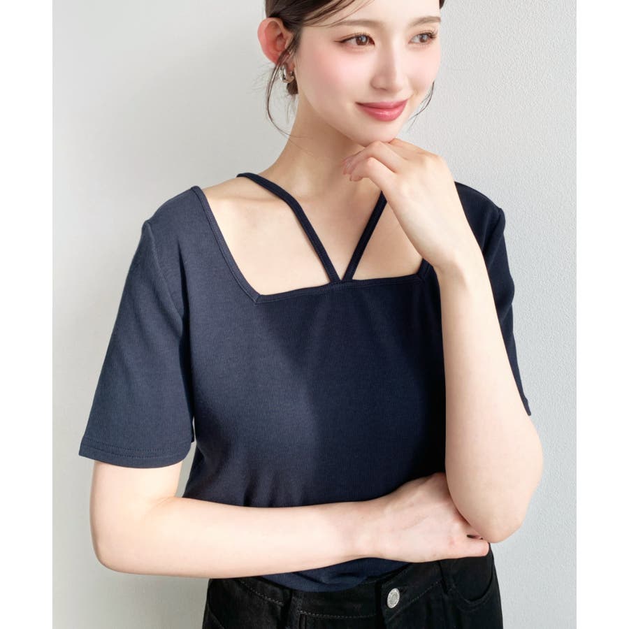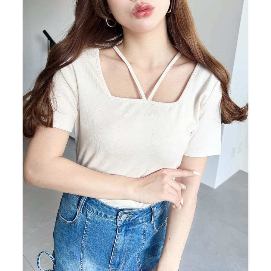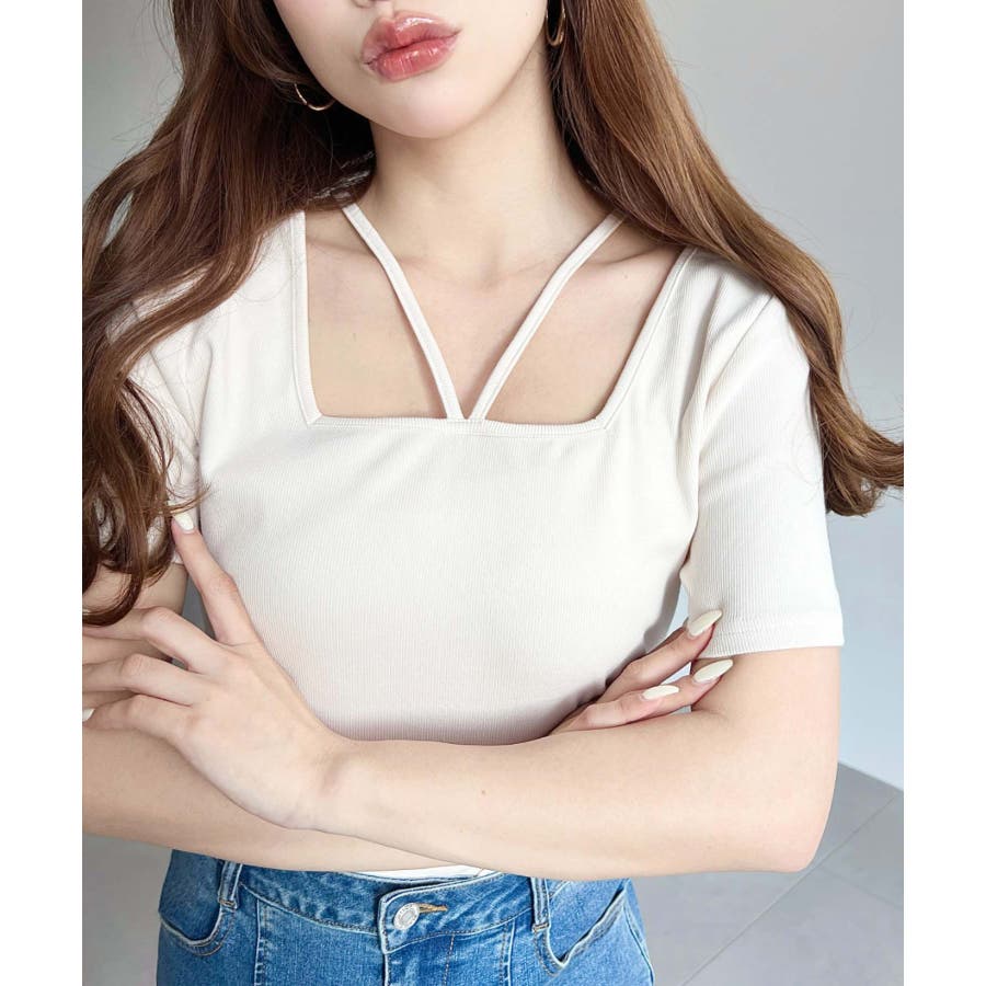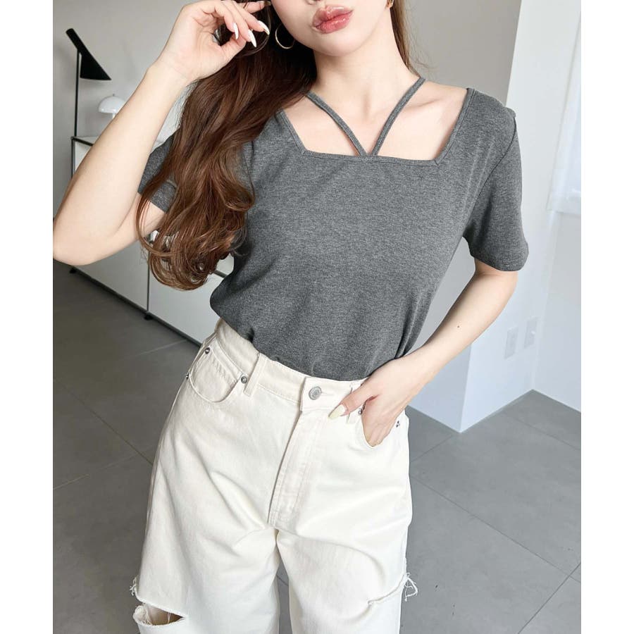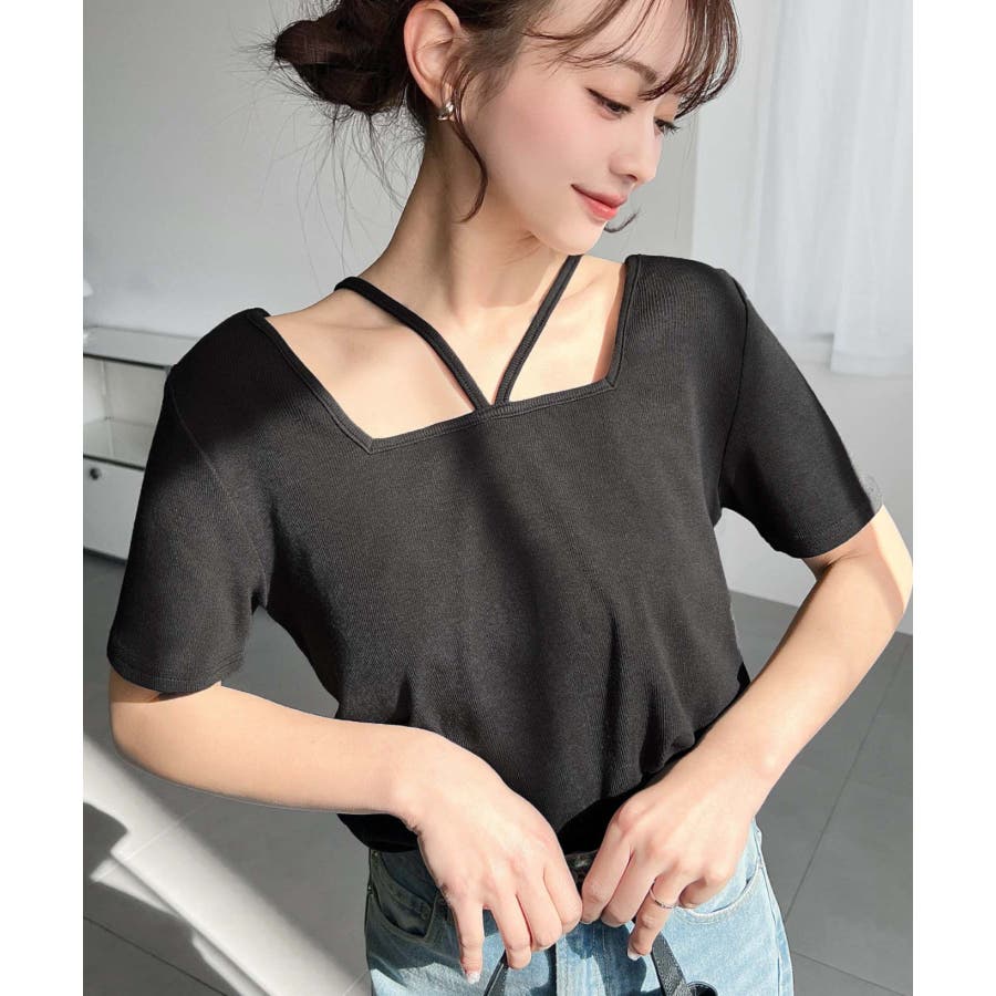 ・デコルテラインをすっきりとスクエアネックと、トレンド感のあるホルターネックを組み合わせたデザイン◎