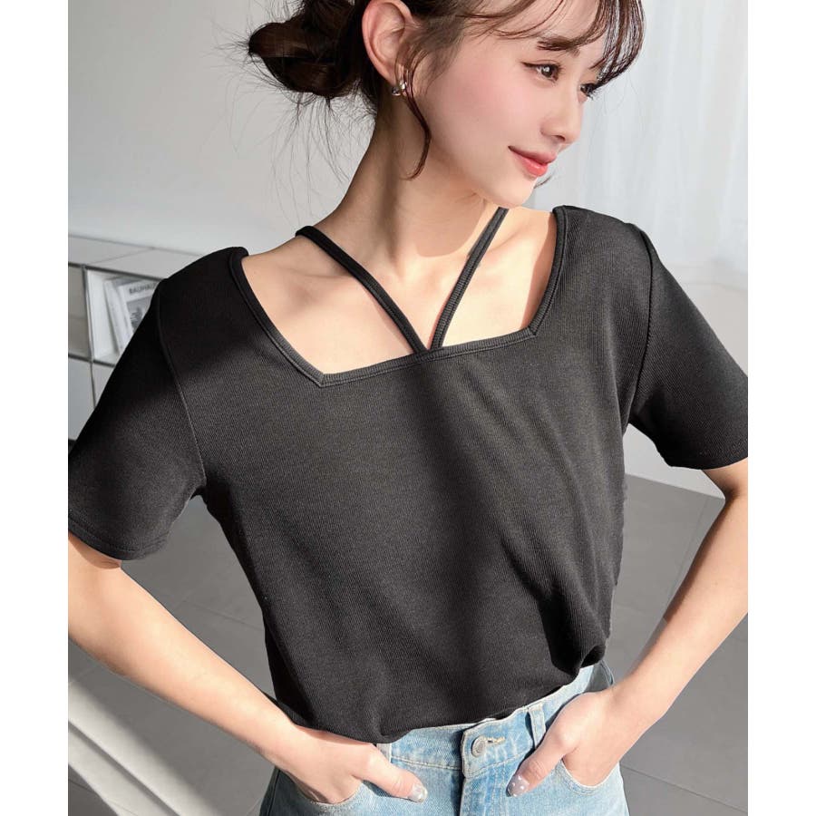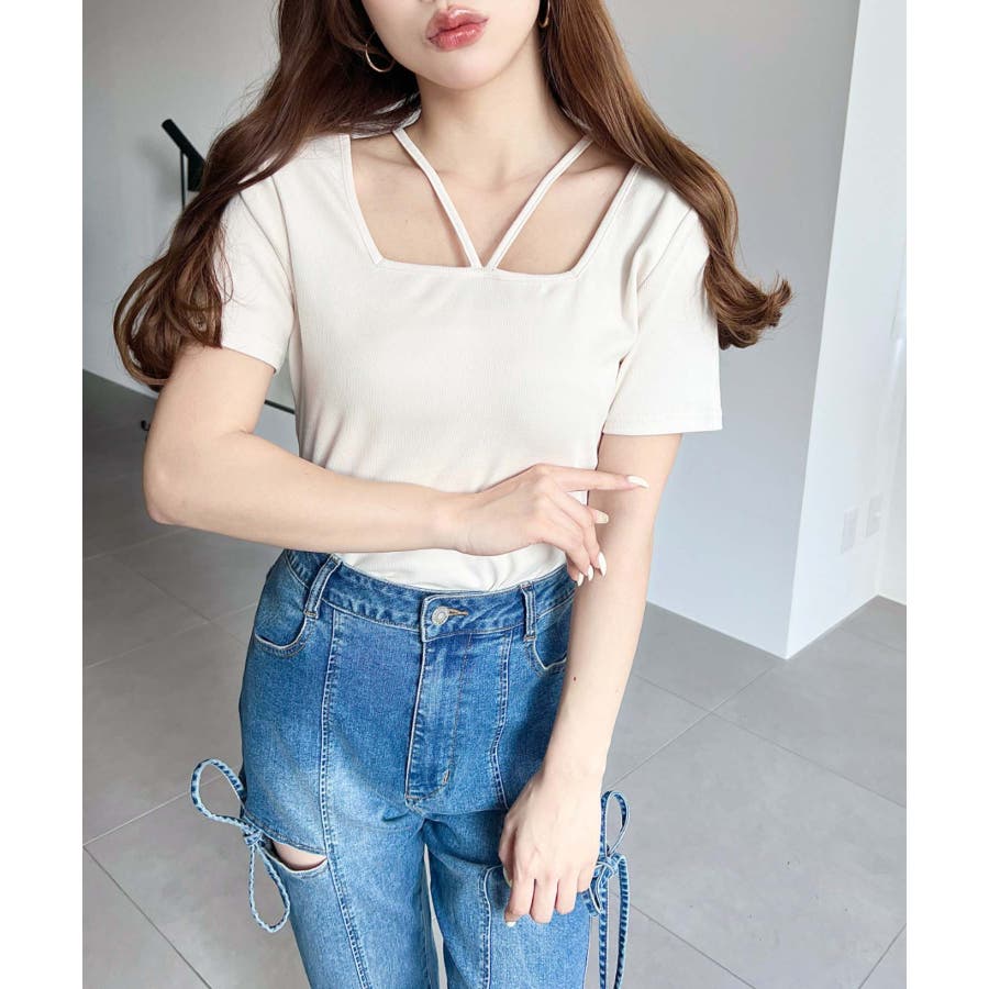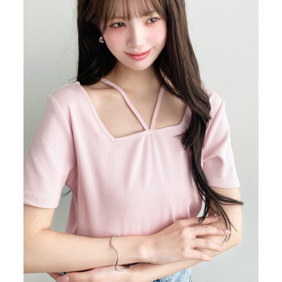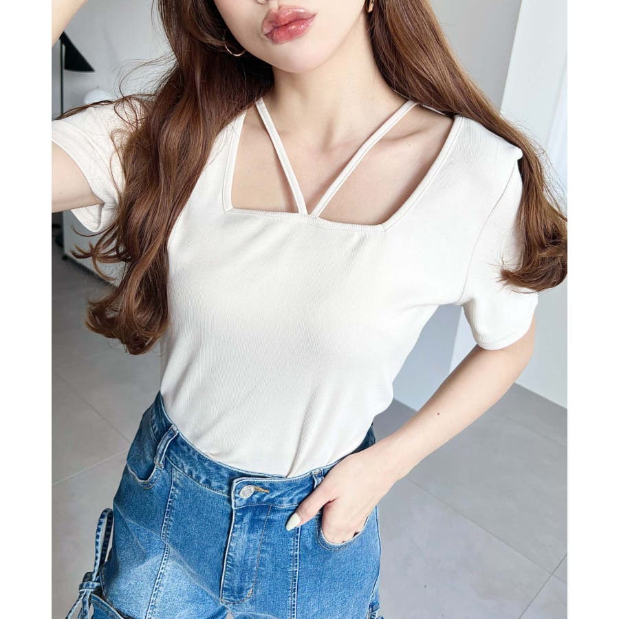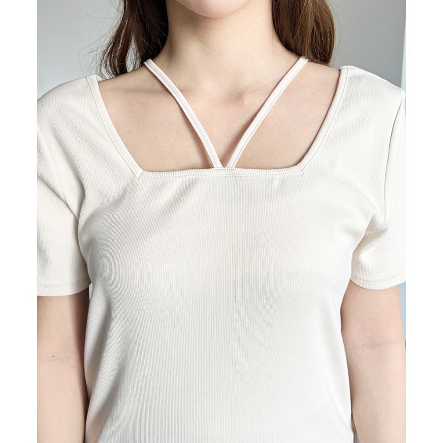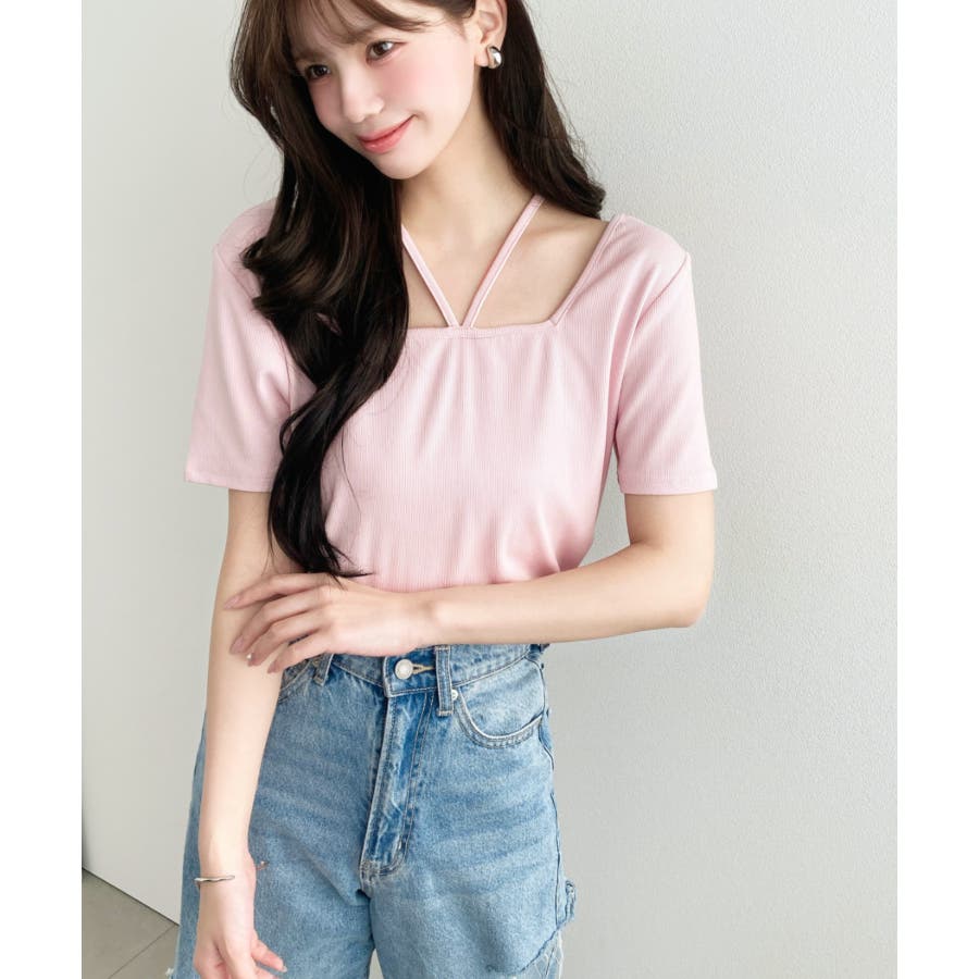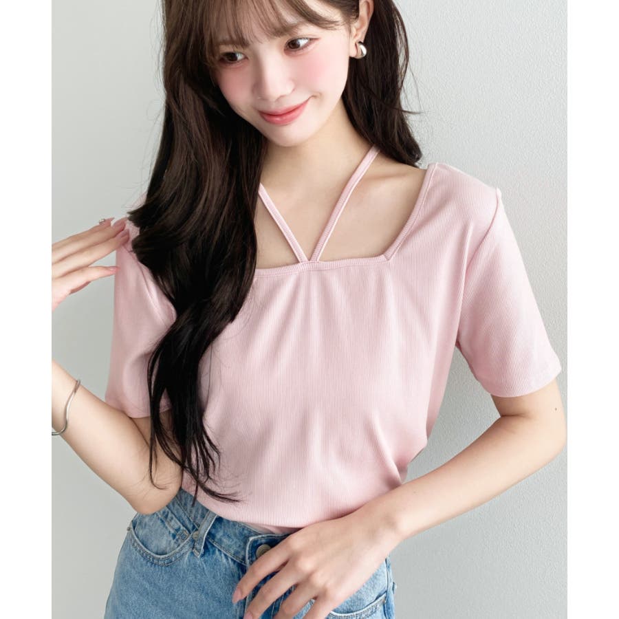・デコルテラインをすっきりとスクエアネックと、トレンド感のあるホルターネックを組み合わせたデザイン◎