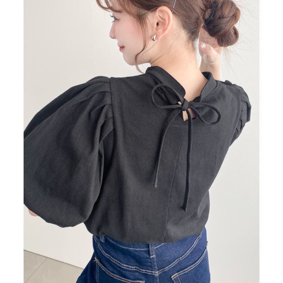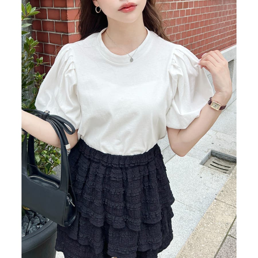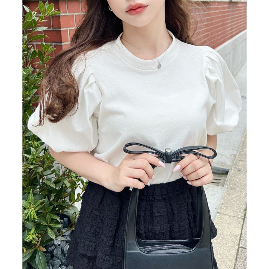 ・スタンドカラーとパフスリーブで肩まわりに立体感を作り、1枚でも華やかに着られるTシャツ。