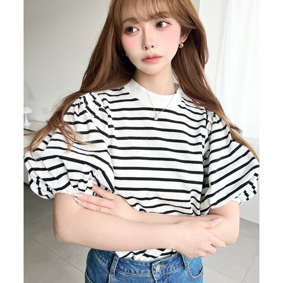 スタンドカラーやパフスリーブのおかげで、カジュアルなTシャツも女性らしい印象になります◎
