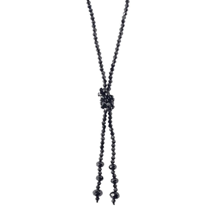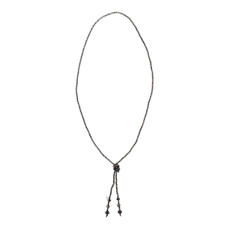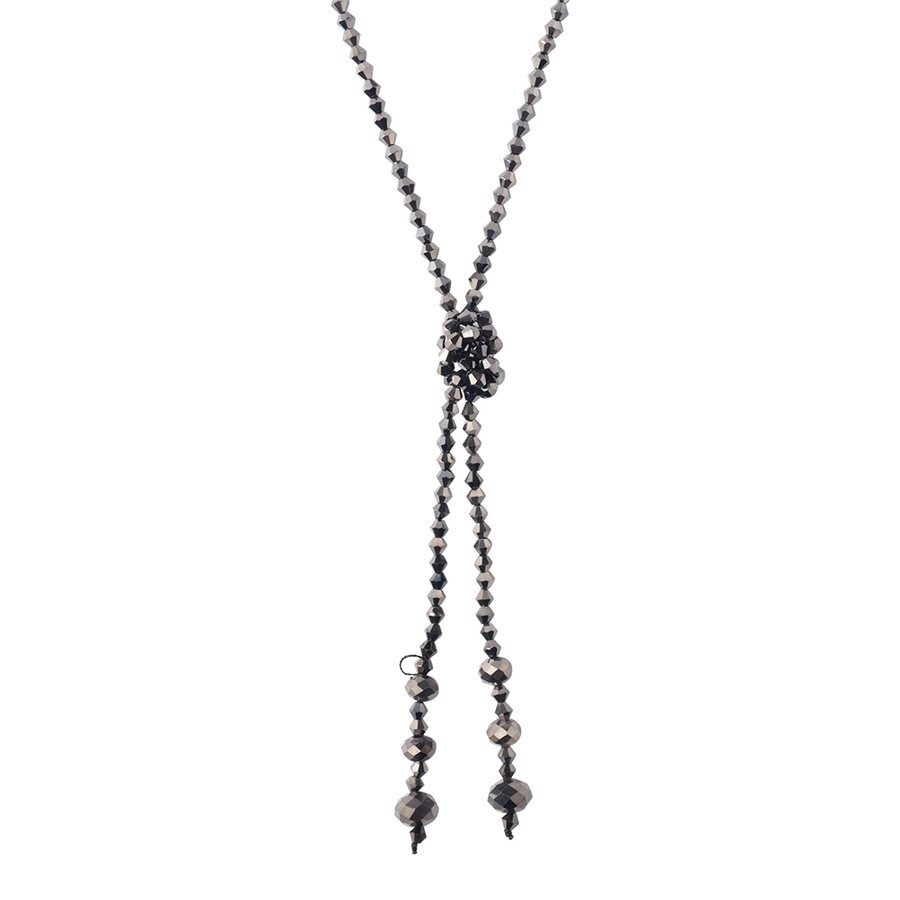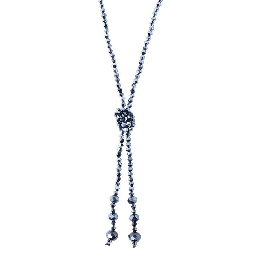光の具合によってキラキラと光を反射して存在感を放つガラスビーズをふんだんに使用したラリエット。自分の好きな長さに結ぶだけでオシャレな胸元の出来上がり。身体の動きに合わせてスウィングするフリンジもオシャレ感をプラス。金属アレルギーの方にもオススメ。