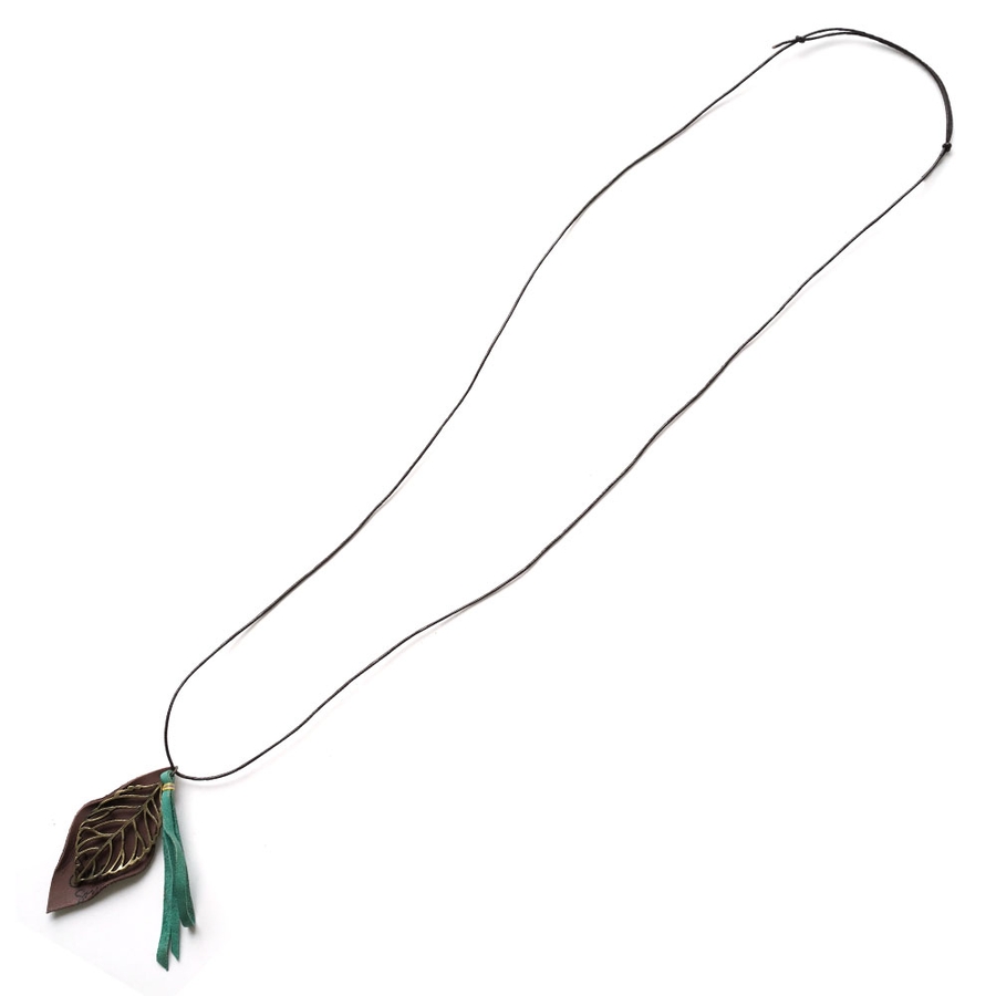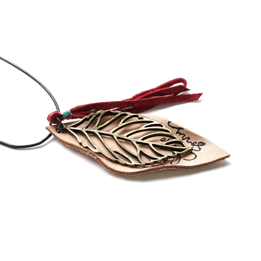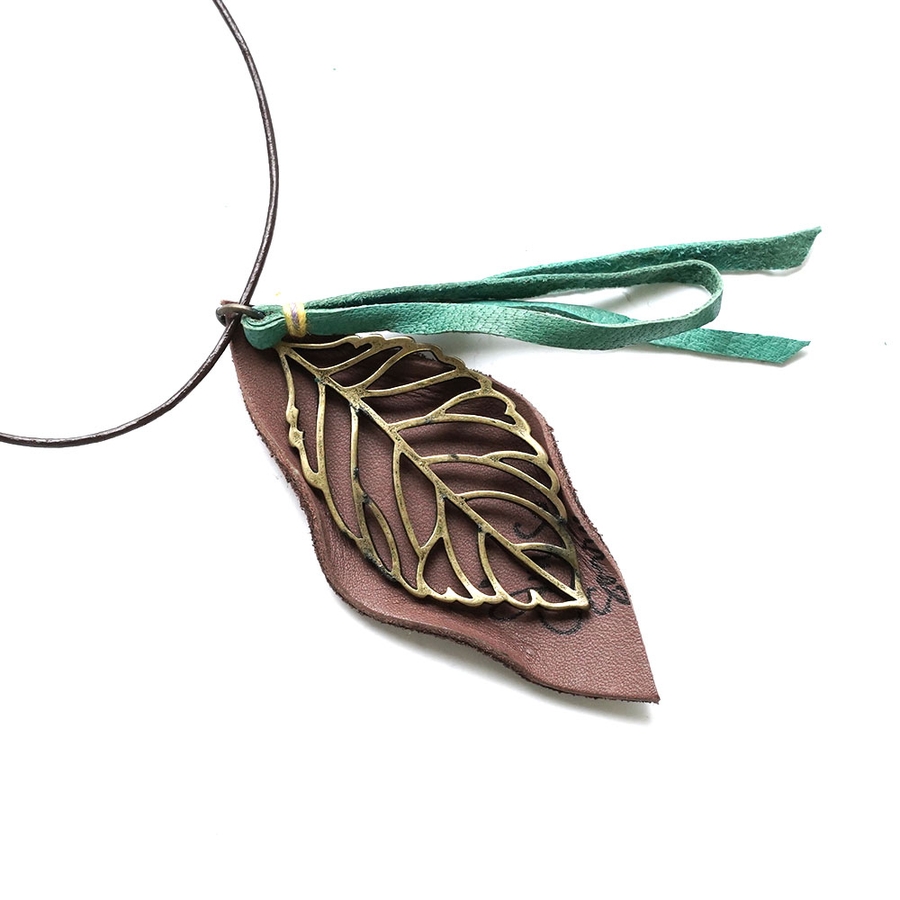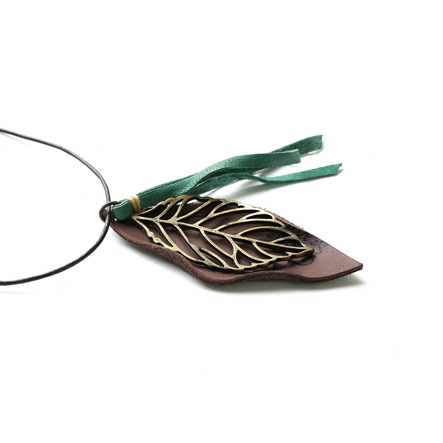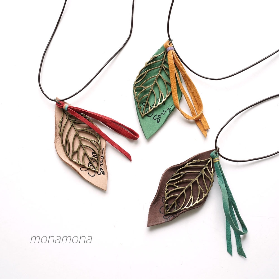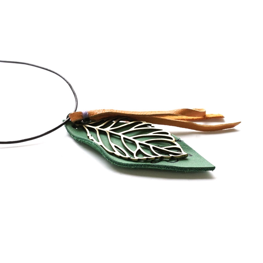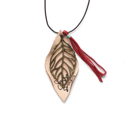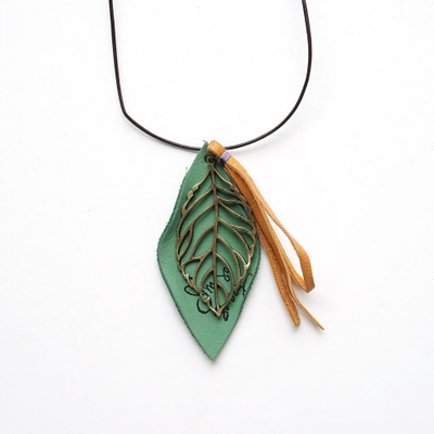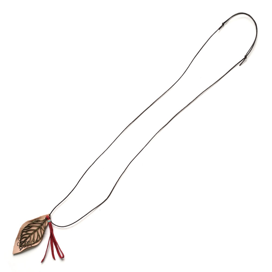 メタルとレザーで葉っぱのモチーフをかたどったネックレス
