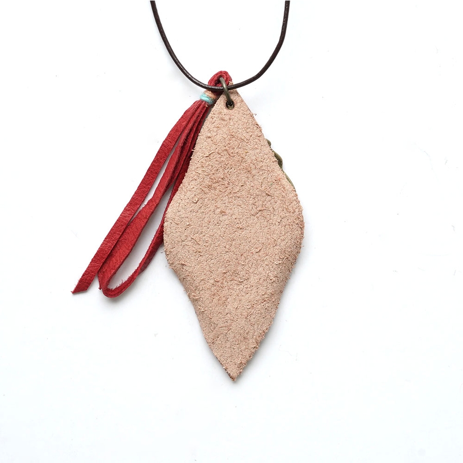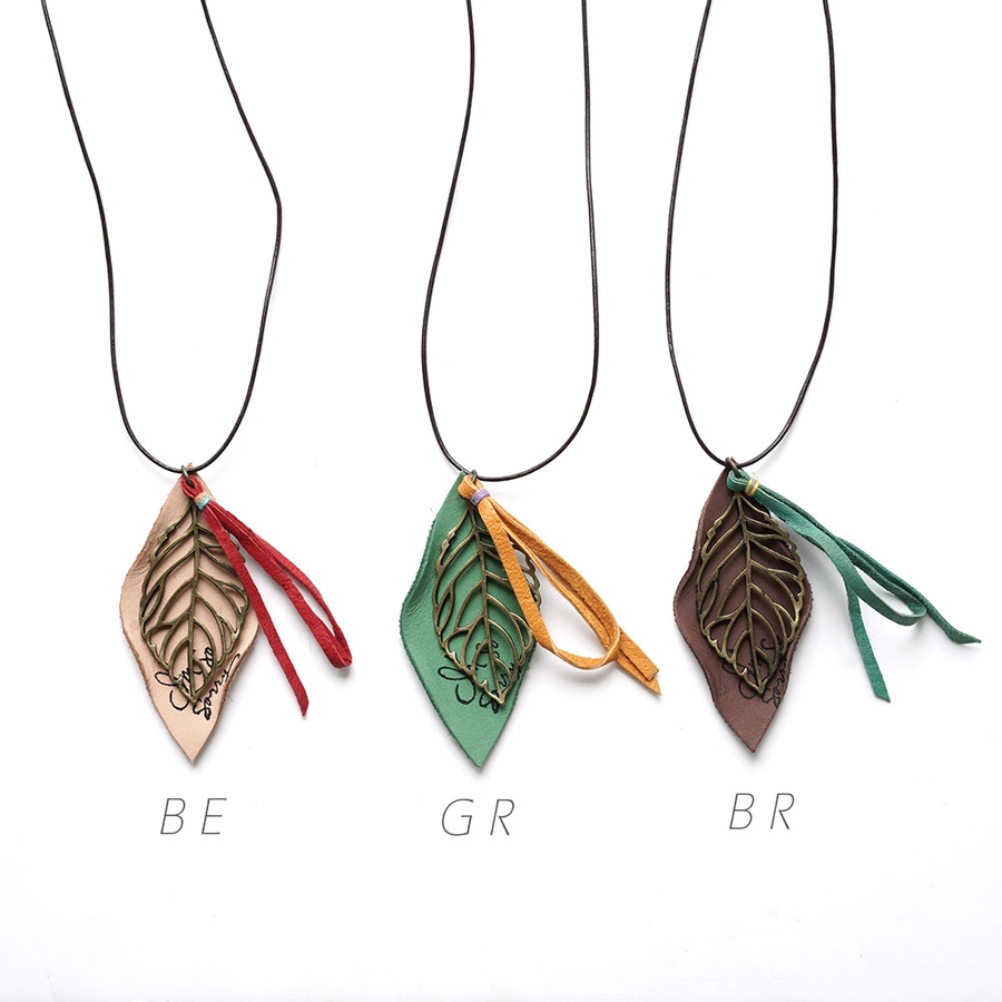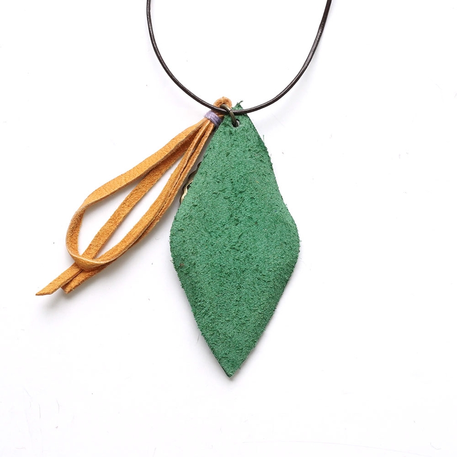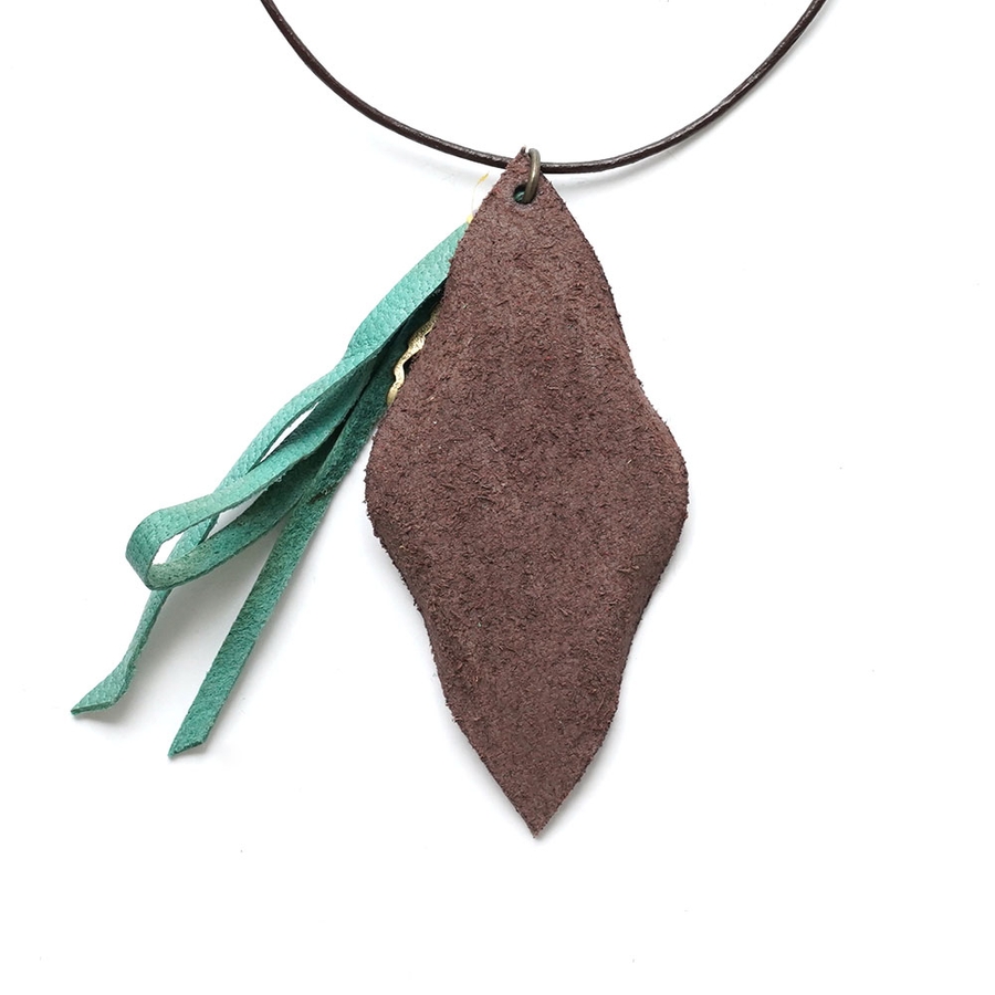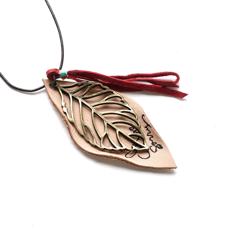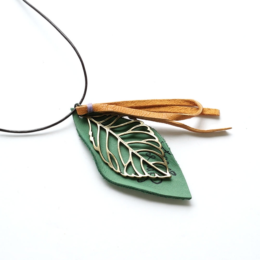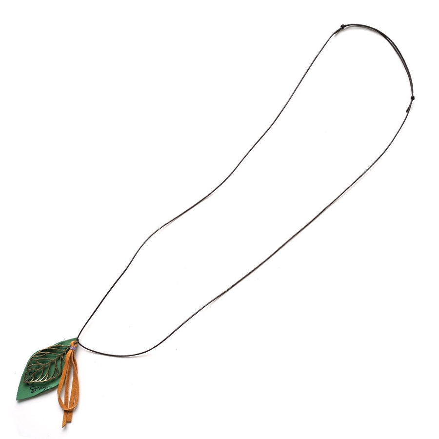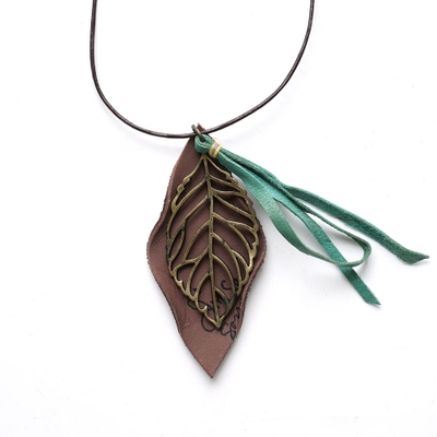 メタルとレザーで葉っぱのモチーフをかたどったネックレス