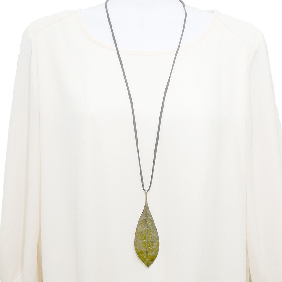 季節感たっぷりのスエードコードを結んだロングネックレス。センターには本物さながらのリーフモチーフをあしらった大胆なデザイン。シンプルなコーディネートのアクセントとしてもピッタリ。季節感のある着こなしを楽しみたい方にもオススメのアイテム。