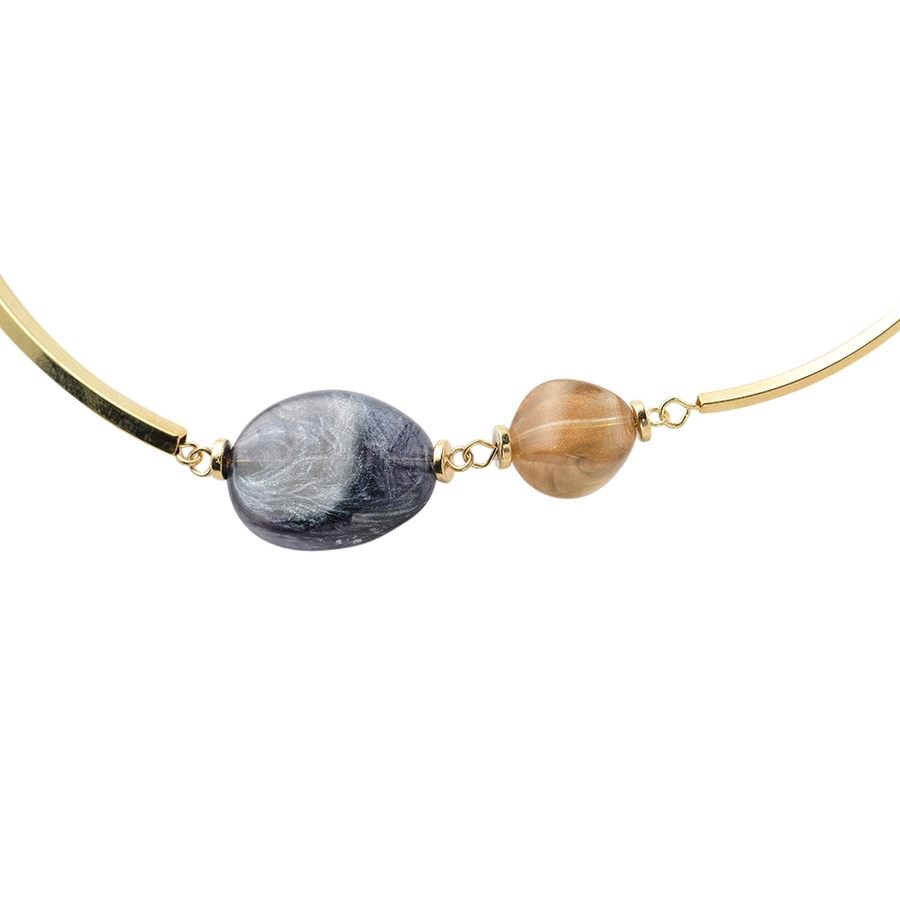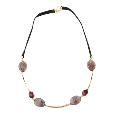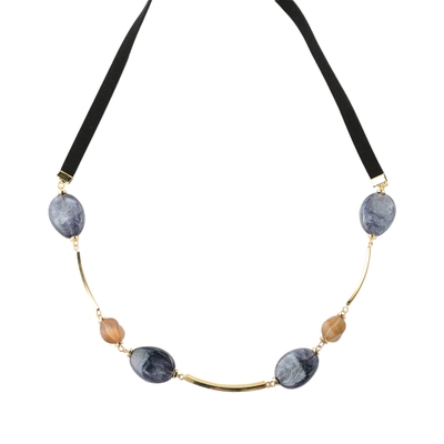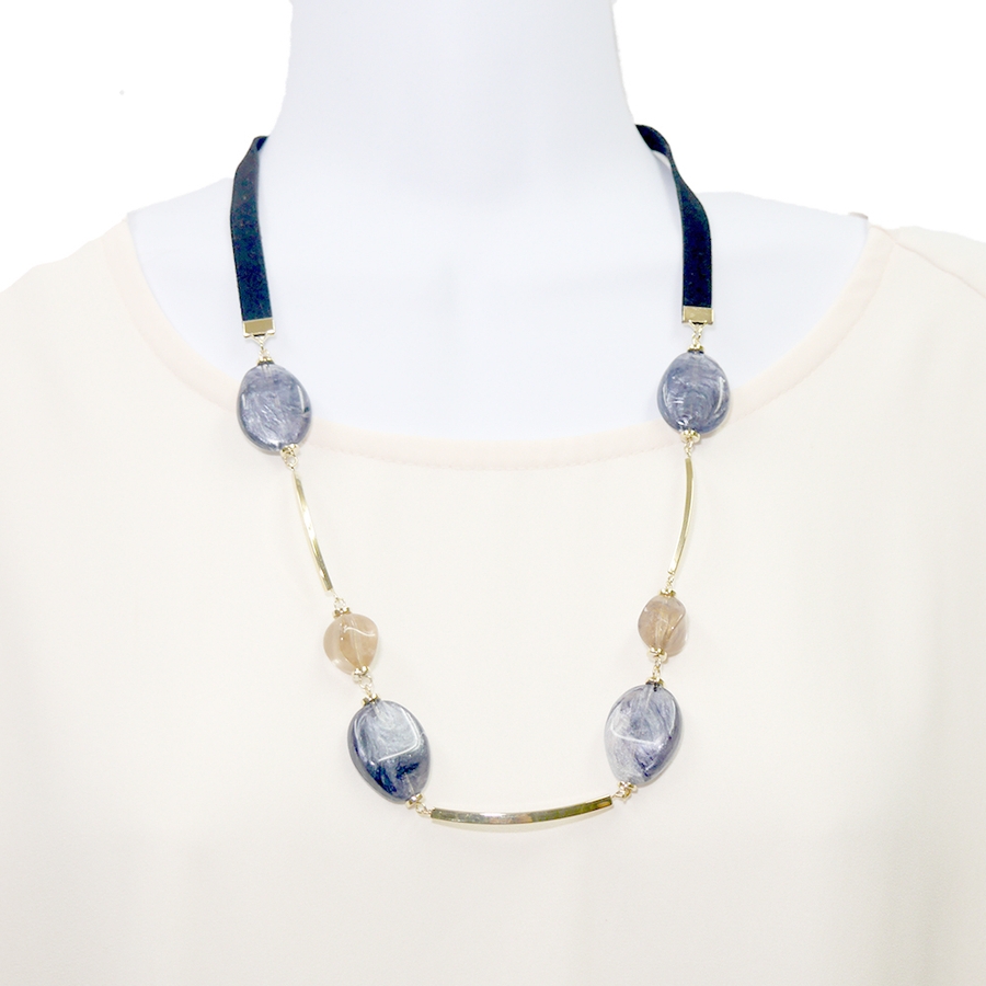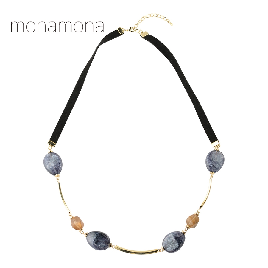 独特な存在感を持つ石目の入った2種類のストーンとゴールドのバーを繋げたネックレス。あえてチェーン部分にはスエードリボンを使用したこだわりのアイテム。ボリューム感たっぷりのディテールは胸元が開いたドレスなどにもピッタリ。パーティーにも◎。