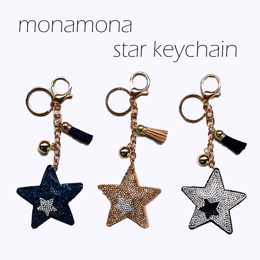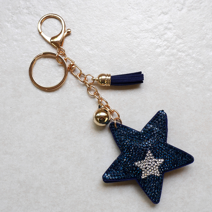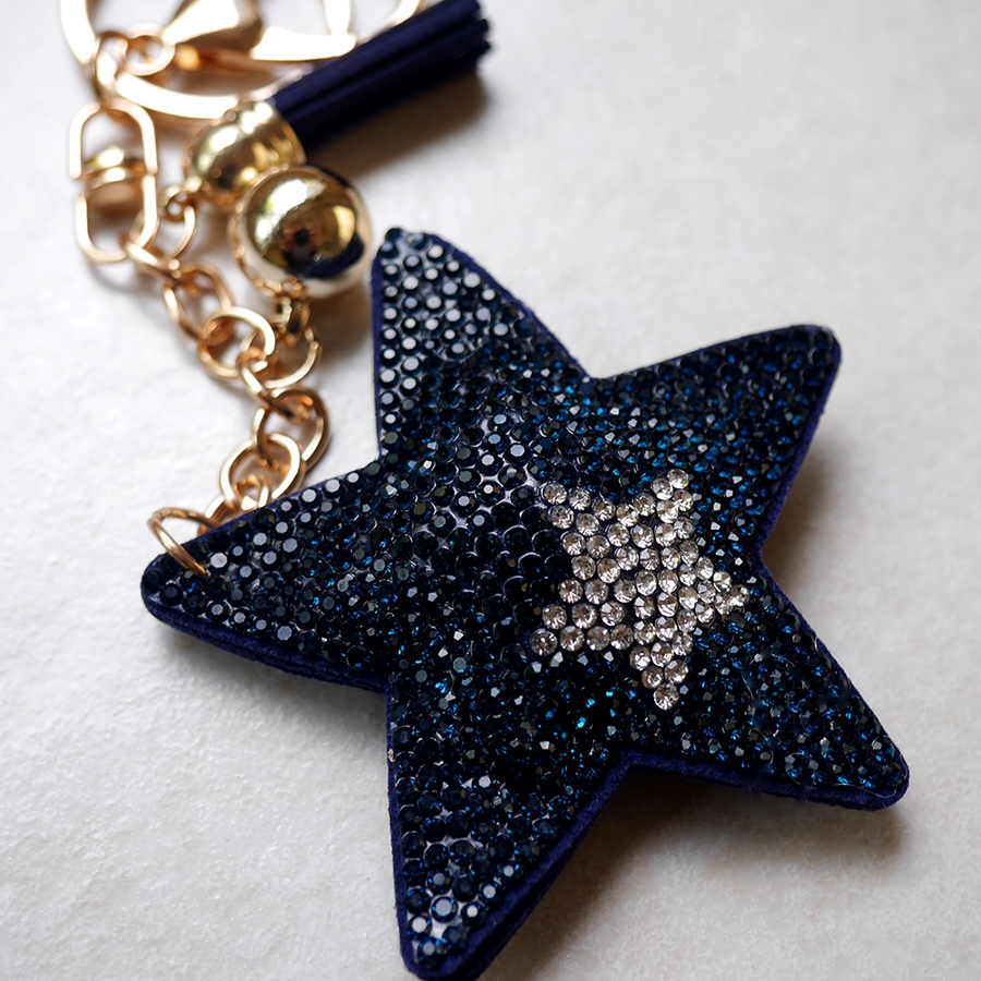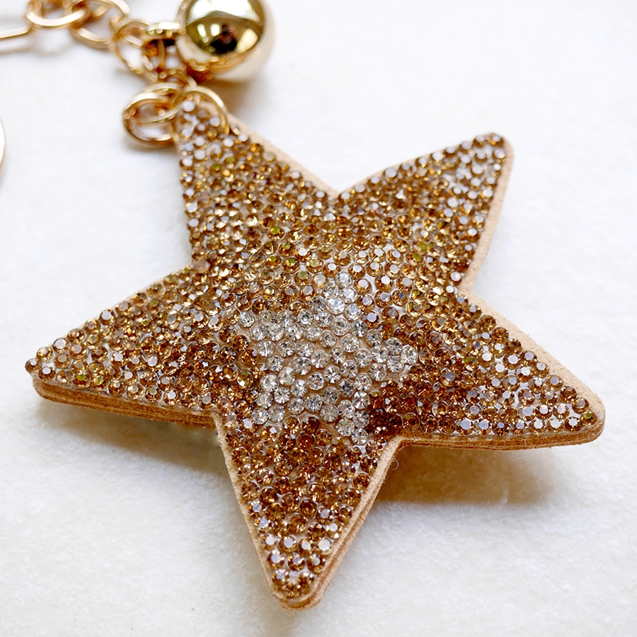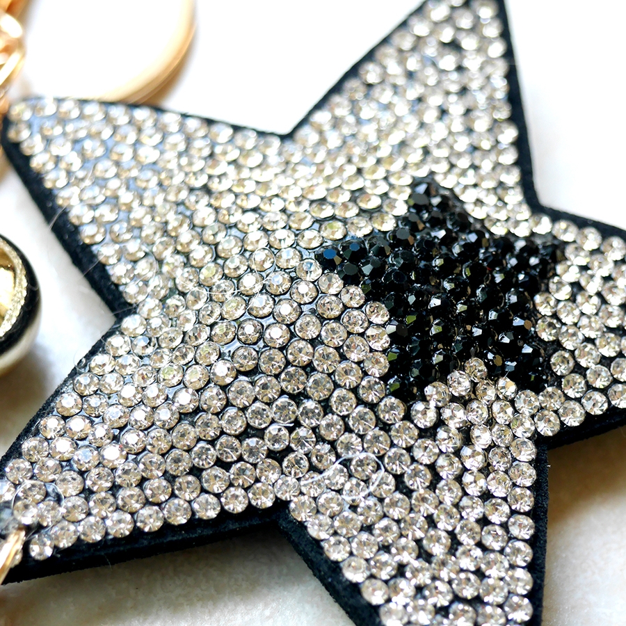 キラキララインストーンの2色使いで、バックチャームにも使える星型キーホルダーです。