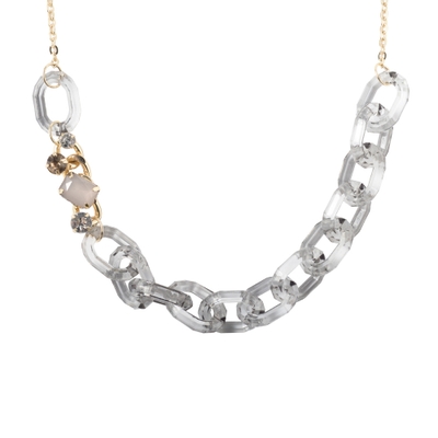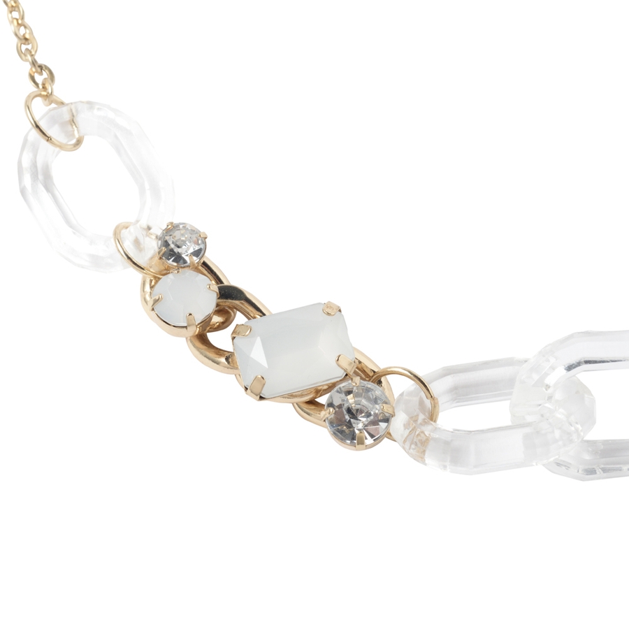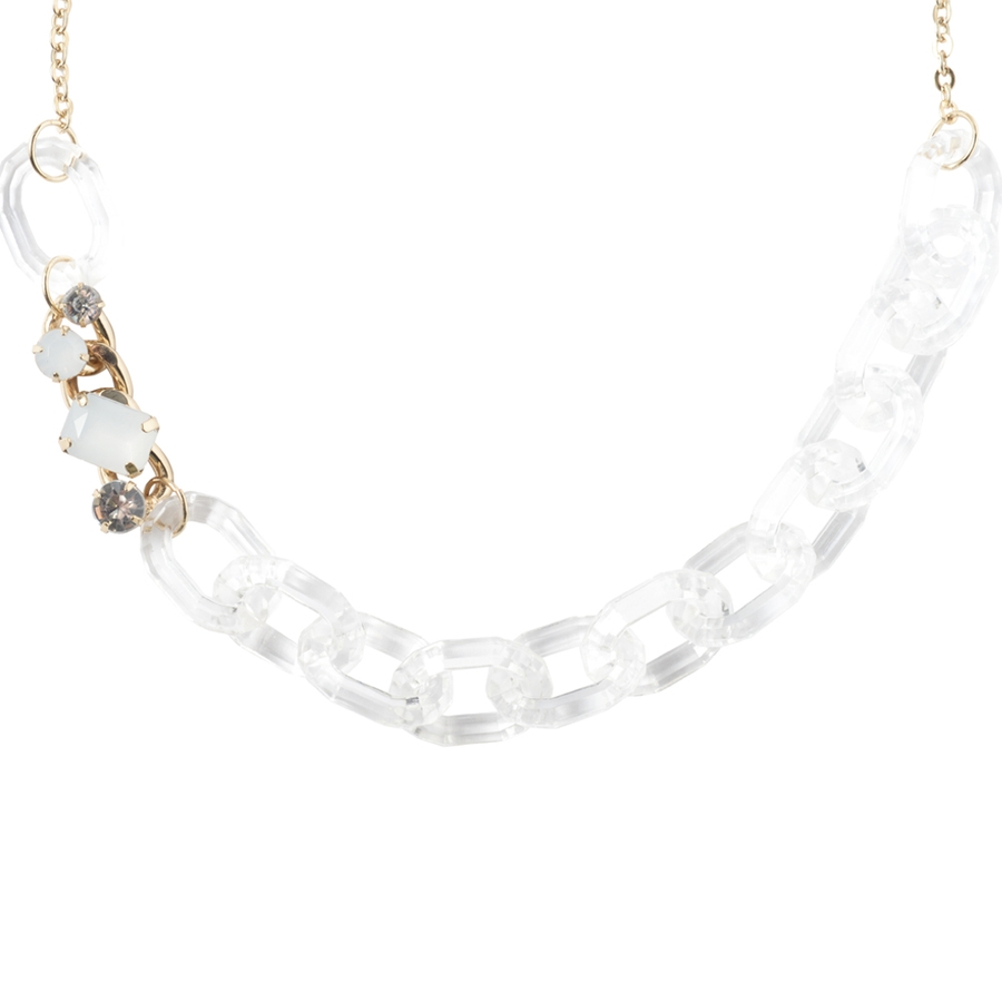 半透明のアクリルチェーンにビジューなどのデコレーションパーツを組み合わせたキュートなネックレス。存在感たっぷりのディテールながら、首裏にはシンプルなチェーンをあしらうことでつけ心地もスムーズな仕上がりに。ボリューミーな首元を演出するアイテム。