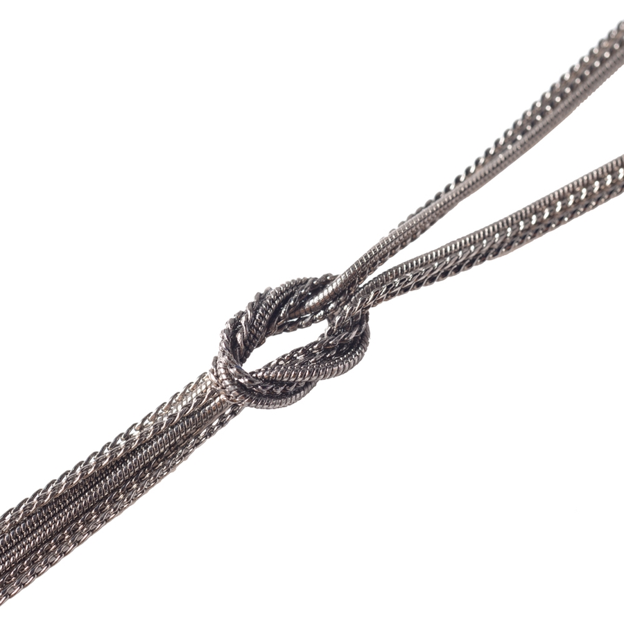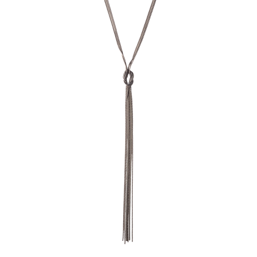 センターの結び目が目を惹くアクセントになったロングネックレス。数種類のチェーンを組み合わせた斬新なデザインがポイントに。まるでフリンジのようにふとした動きに合わせてチェーン部分が揺れる華やかなアイテム。カジュアルなコーデにもマッチするディテール。