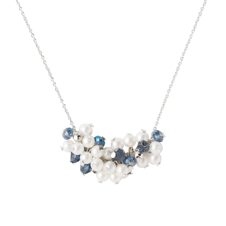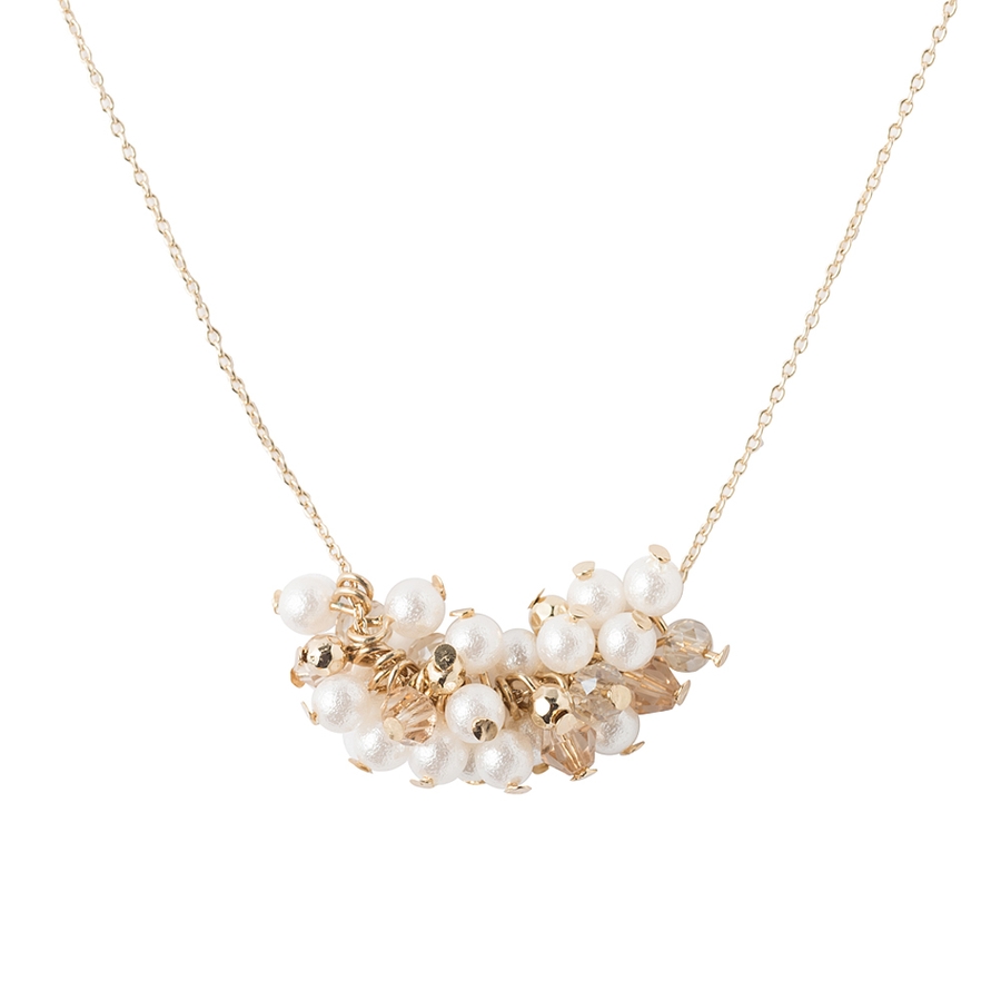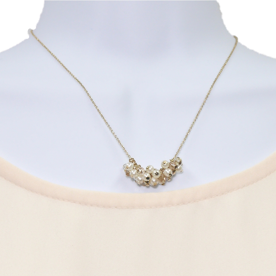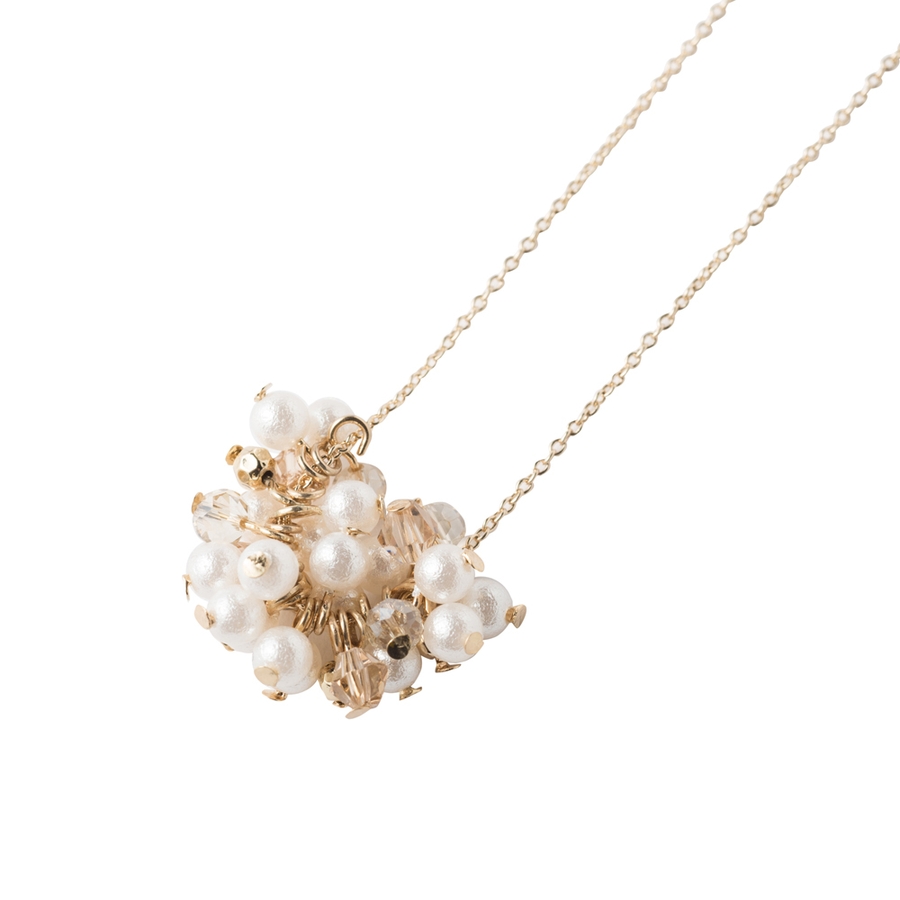 放射状にパールビーズを配した立体的なモチーフが存在感を放つネックレス。果実がたわわに実ったようなラグジュアリー感漂うシルエットがポイント。胸元にボリューム感をプラスしたい時にもピッタリのアイテム。イベントなどの華やかなシーンにも重宝しそう。