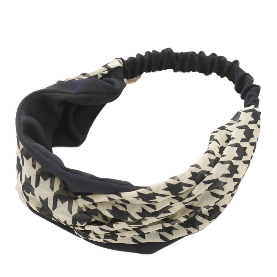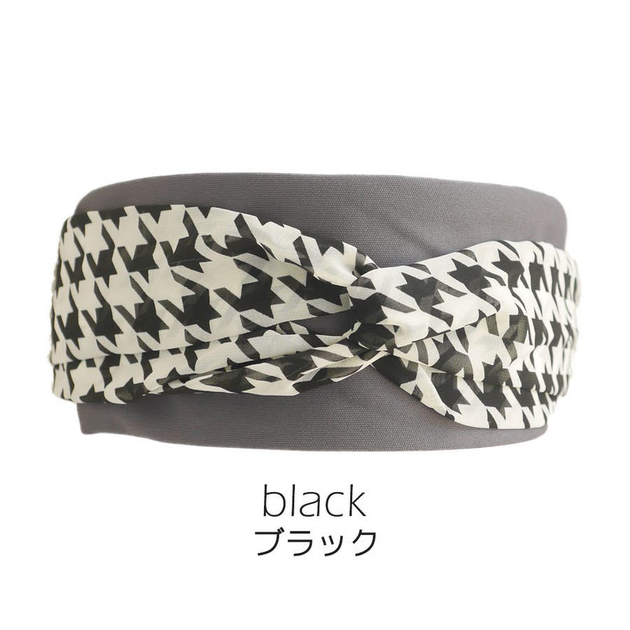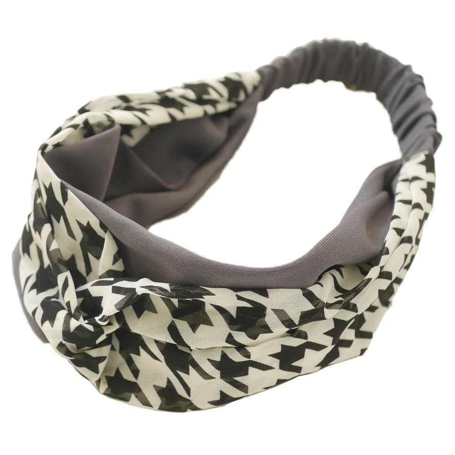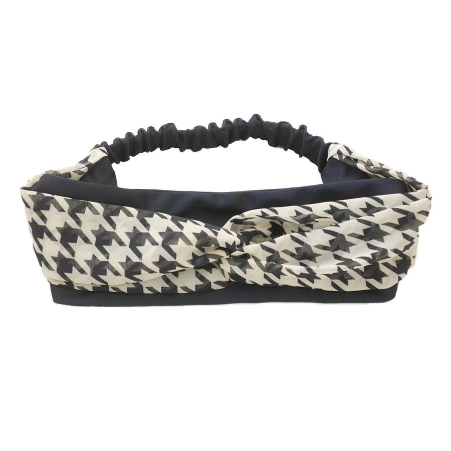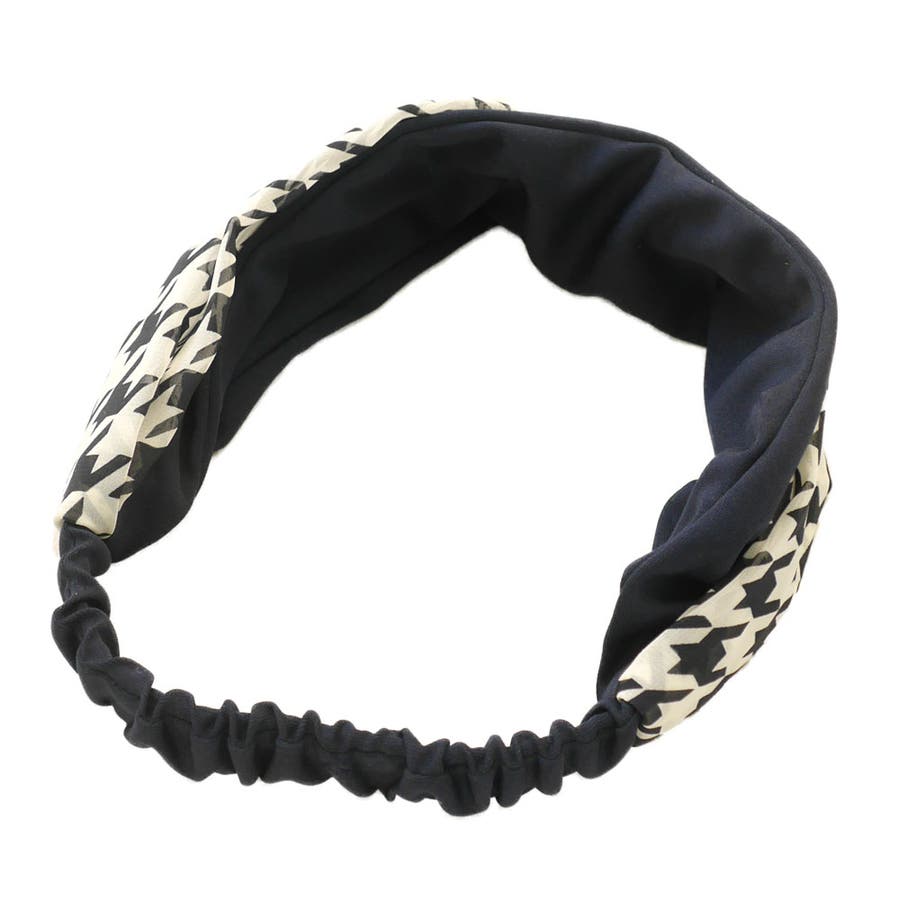 大きめの千鳥柄のヘアバンド、落ち着いたカラーの無地と合わせることで使いやすデイリーカジュアルにぴったり。