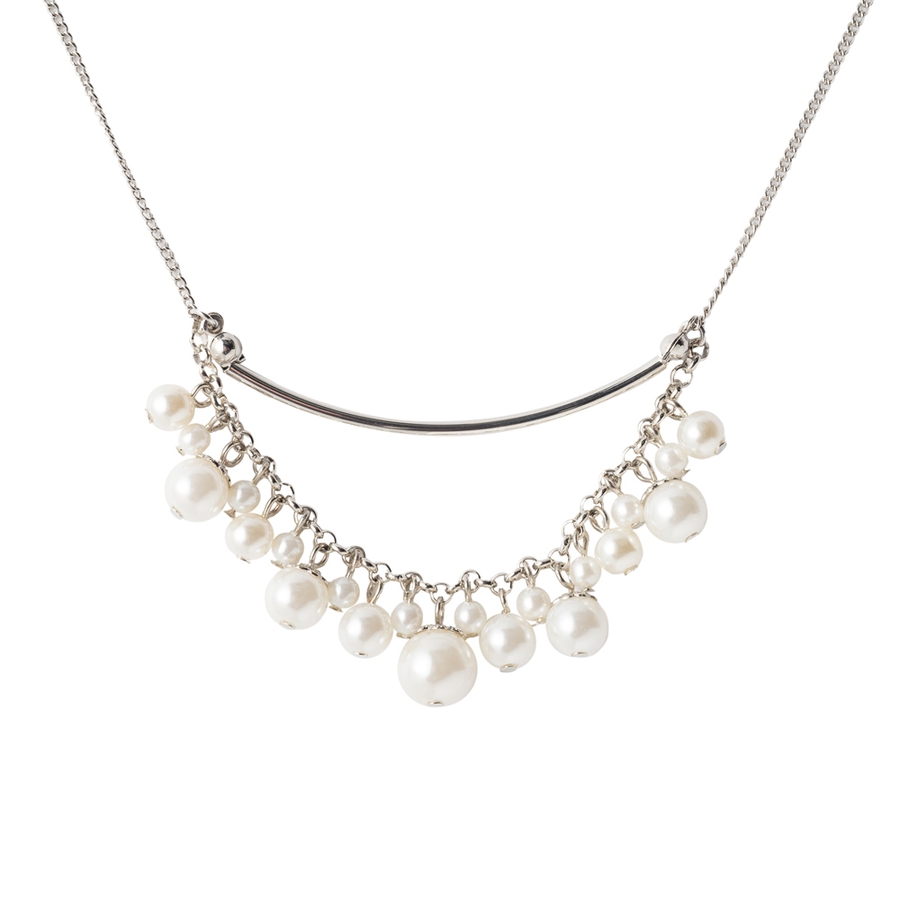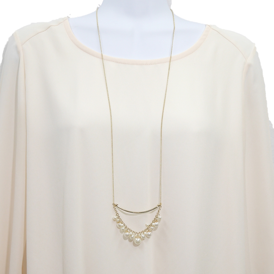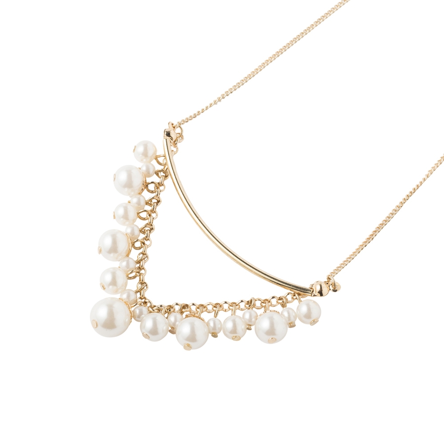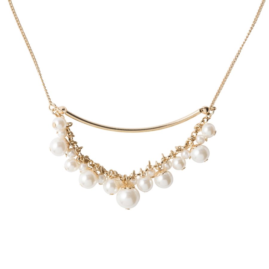 ゴールドのバーにぶら下がるチェーン×パールのモチーフが優雅な胸元を演出するネックレス。ふとした動きに合わせてパールが軽やかにスウィングする何とも華やかなディテールが魅力。シンプルなコーディネートにこそ取り入れてもらいたいデコラティブなアイテム。