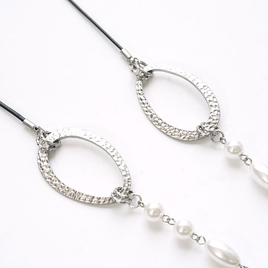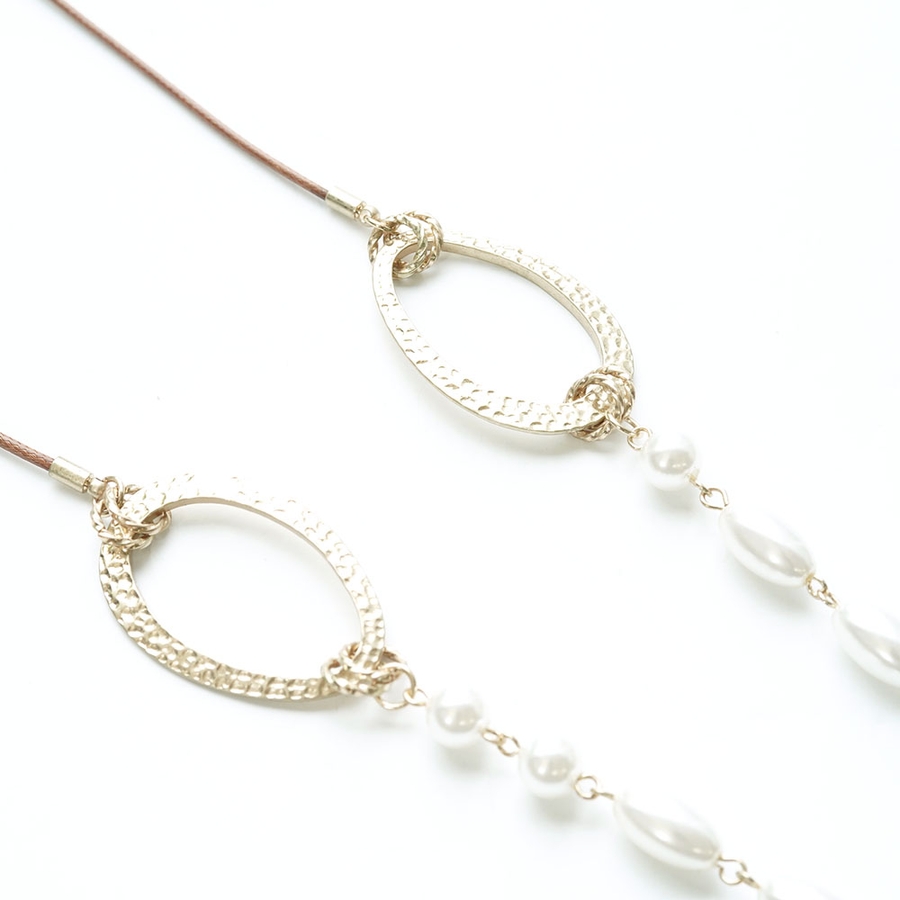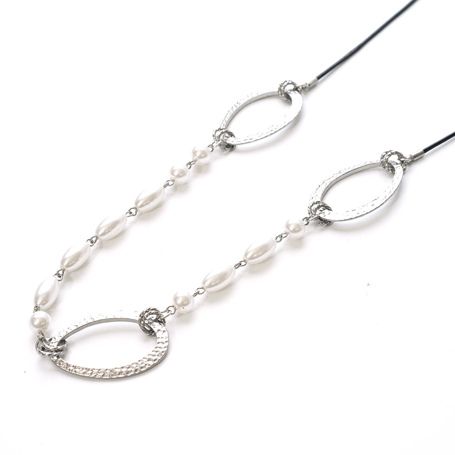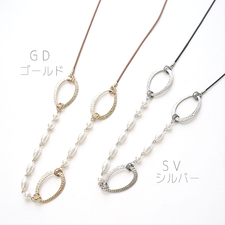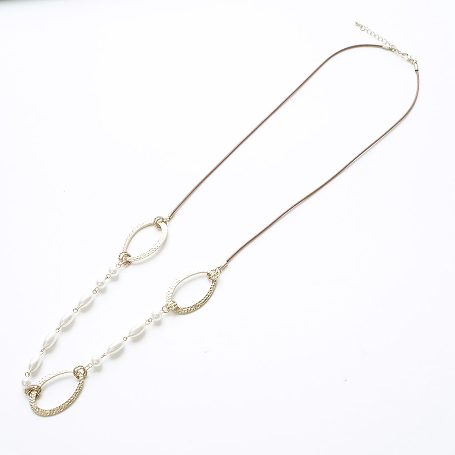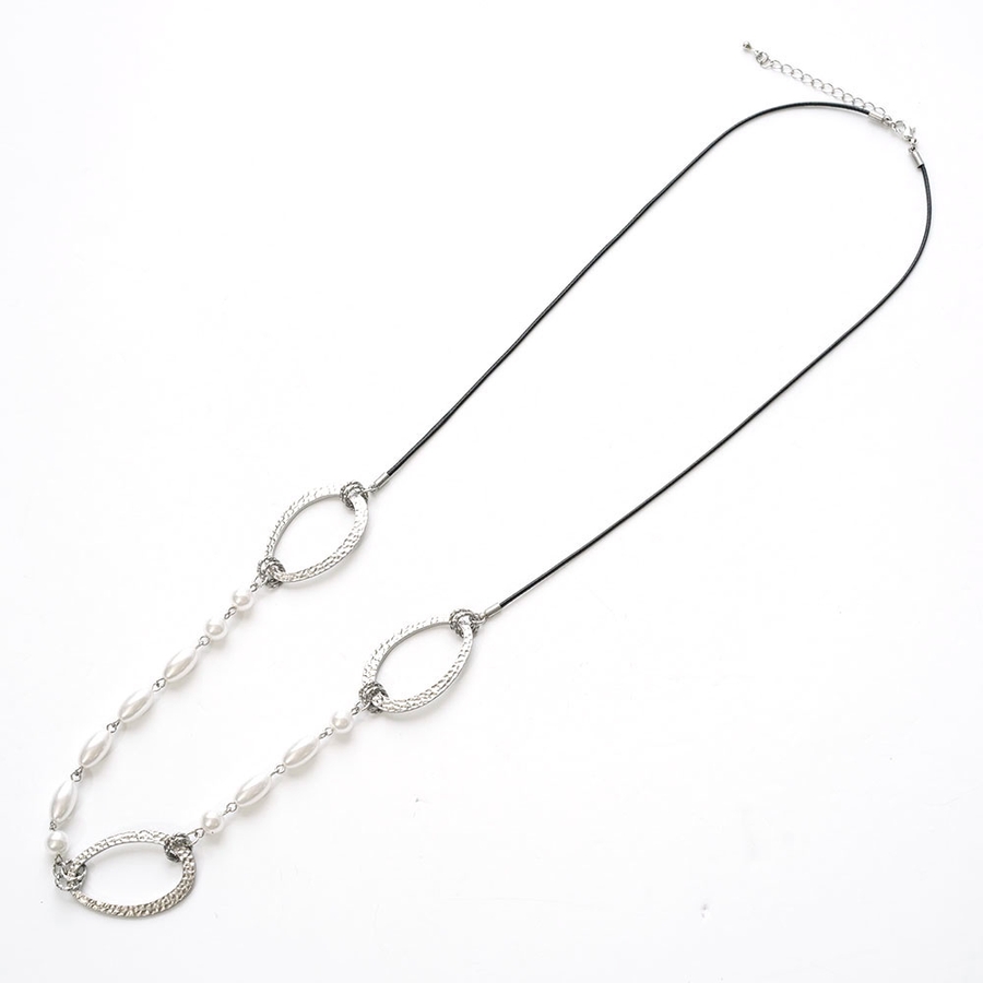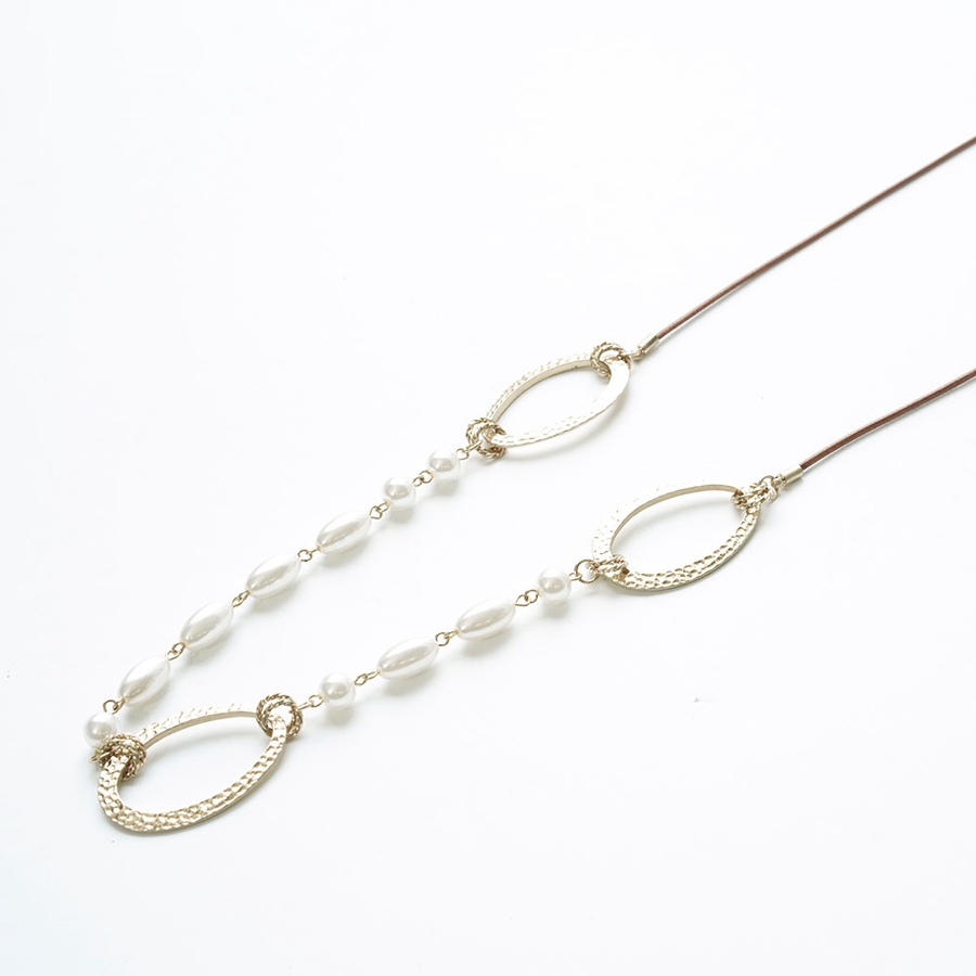 フェイクパールとメタルの楕円パーツのロングネックレス