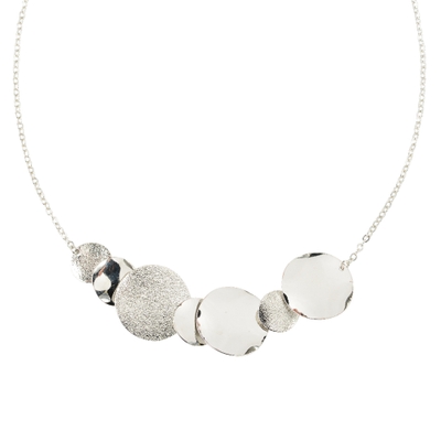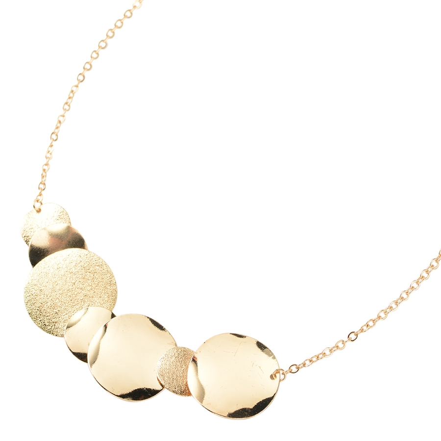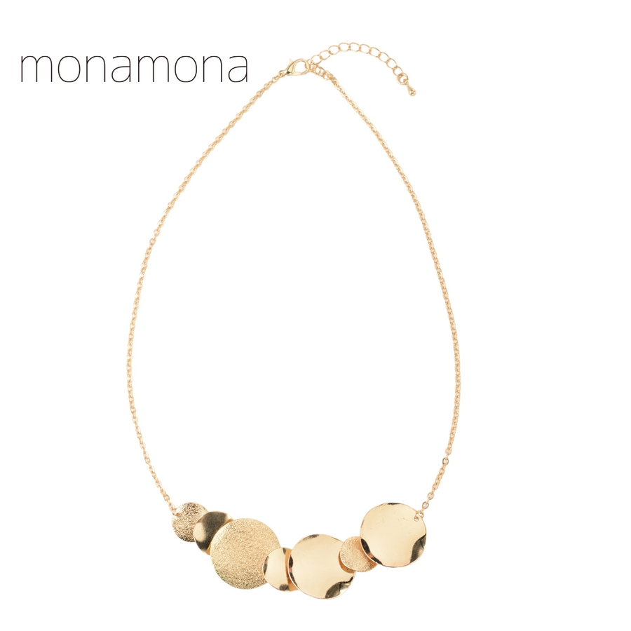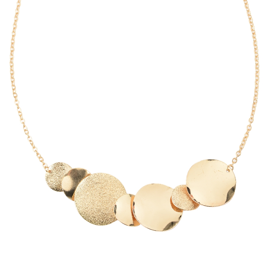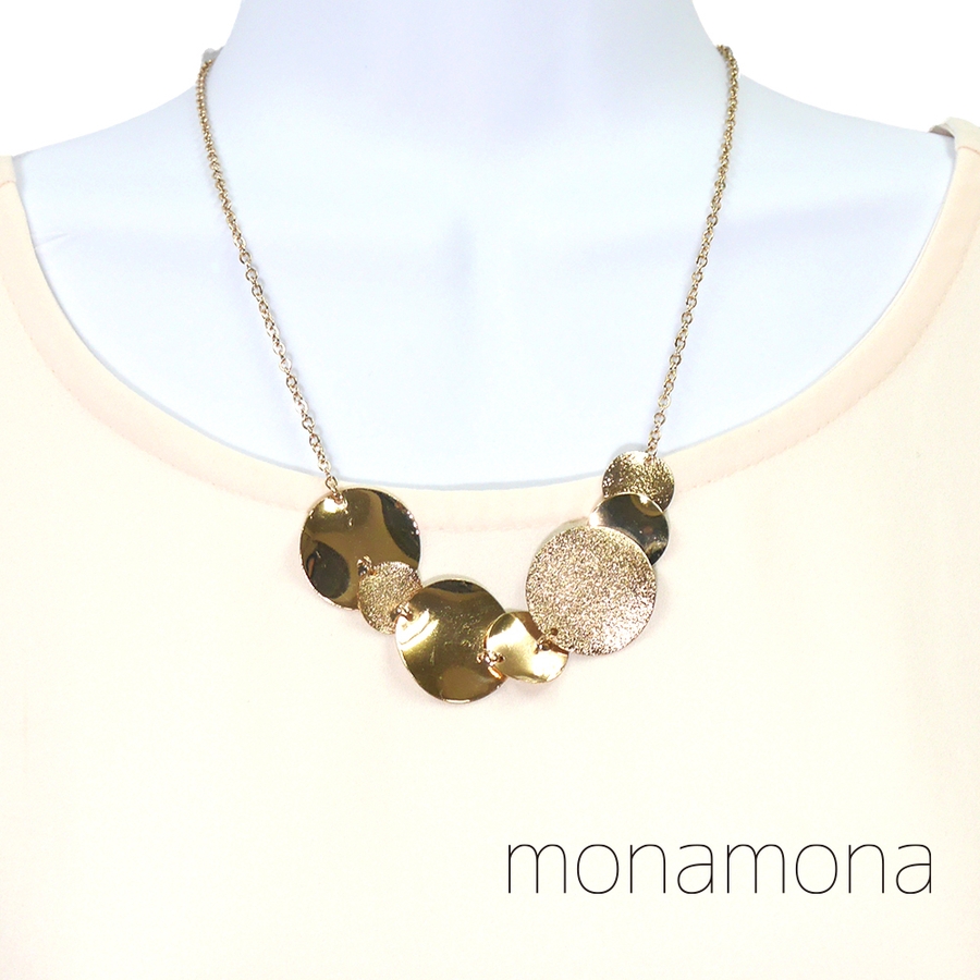 艶やかな表面の円形パーツとざらざらした表面の円形パーツ、大小取り混ぜて並べたラグジュアリーなネックレス。胸元のデコレーションがキラキラと反射して存在感を放つ華やかなアイテム。ゴージャスなドレスにもマッチするからパーティーシーンなどにも活躍してくれそう。