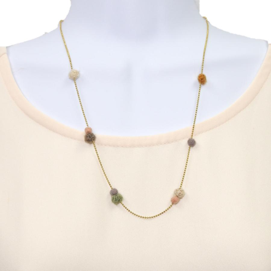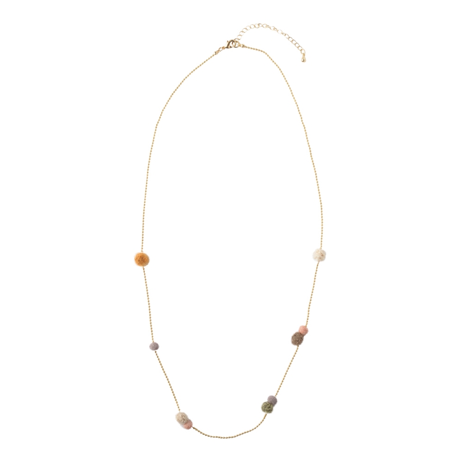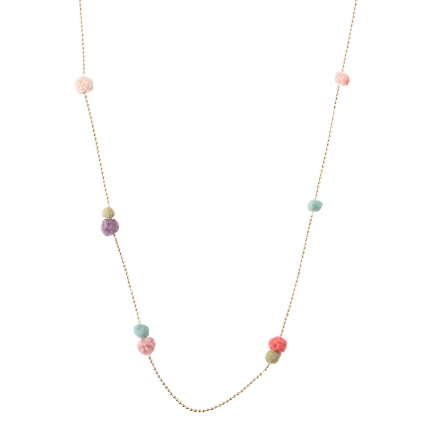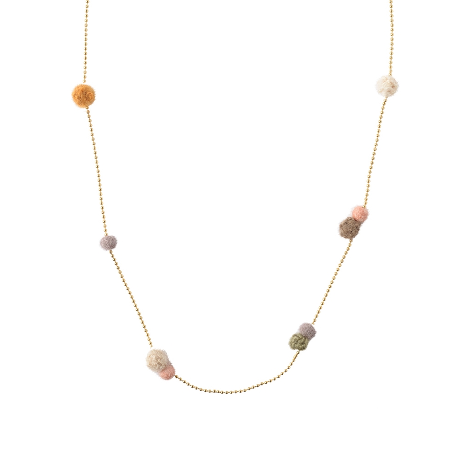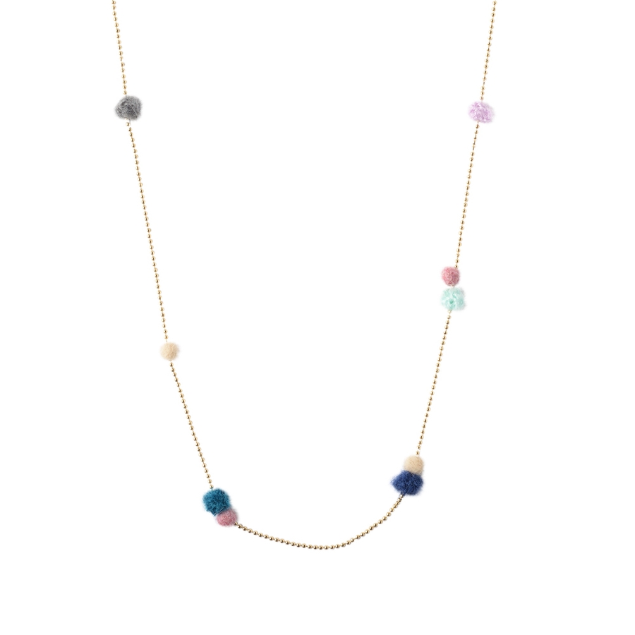 羊毛で作ったカラフルなポンポンをランダムにあしらったステーションネックレス。ガーリーな華やかさを存分に表現したキュートなディテール。季節感のあるコーディネートを楽しみたい人にもオススメ。シンプルなスタイリングはもちろん、2連ネックレスのアレンジも可能。