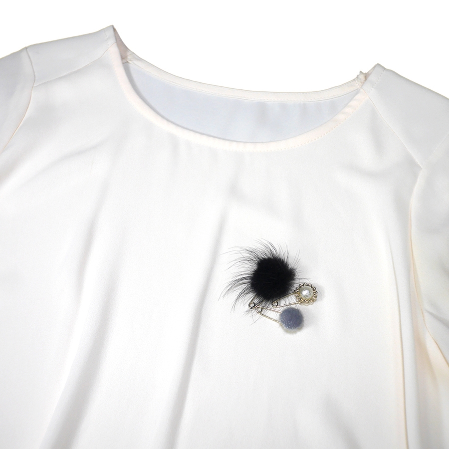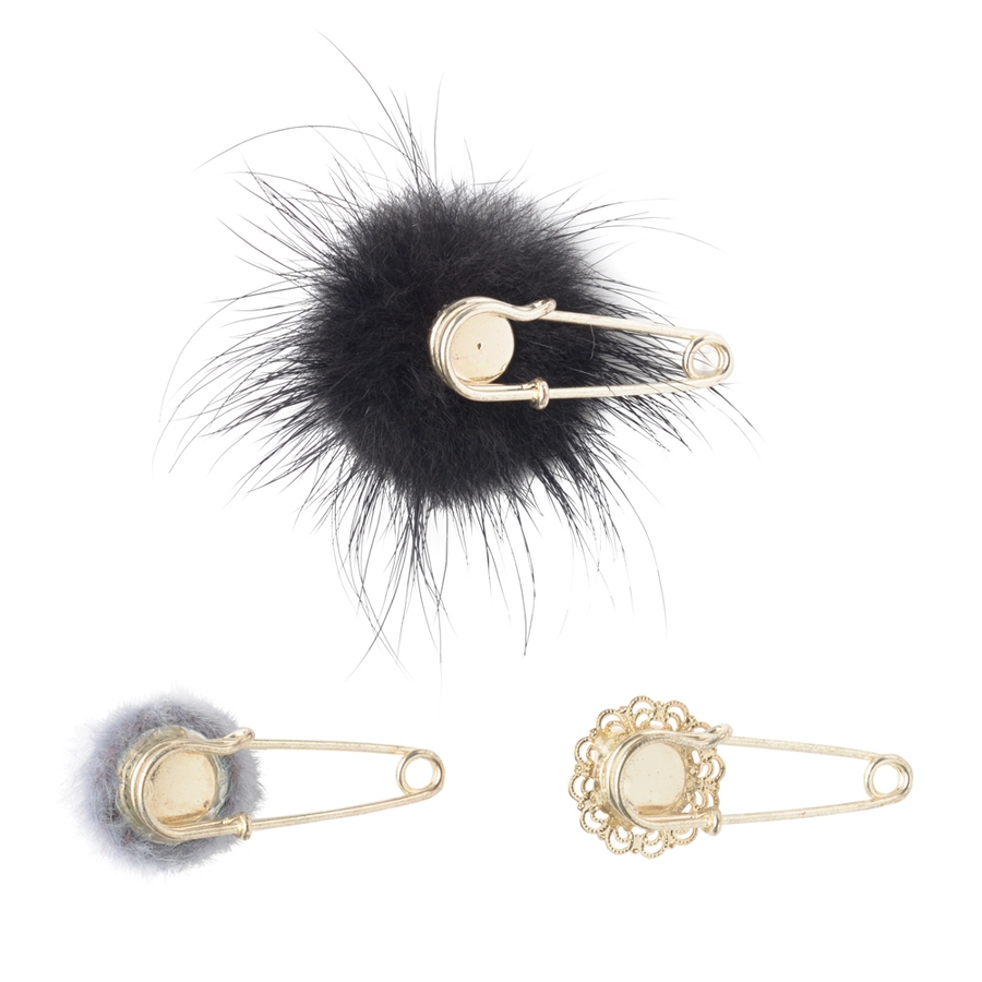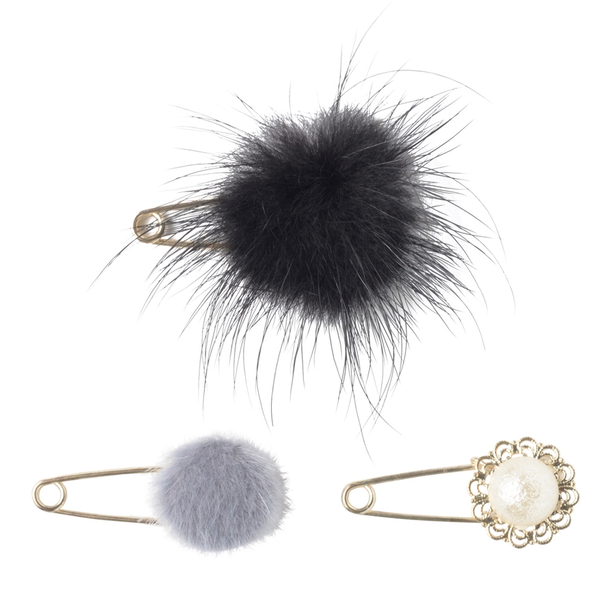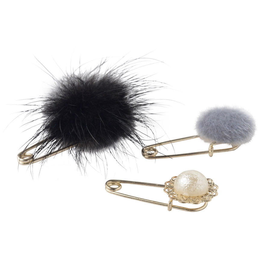 季節感たっぷりの装いが楽しめるミンクファーポンポンつきブローチ。そのほか小さめのファーブローチ、コットンパール使いのブローチ3種類がセットになった便利なセット。洋服に着けるのはもちろん、バッグや靴などの小物に着けてもオシャレなアクセントに。