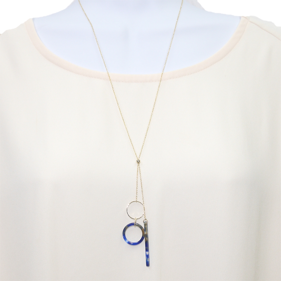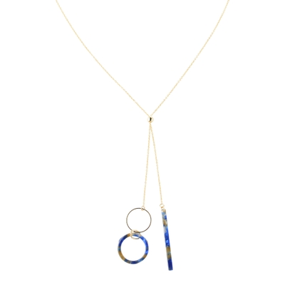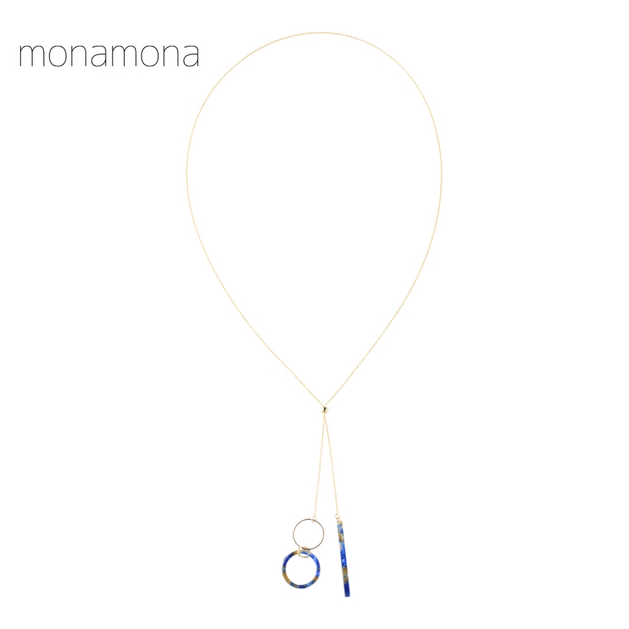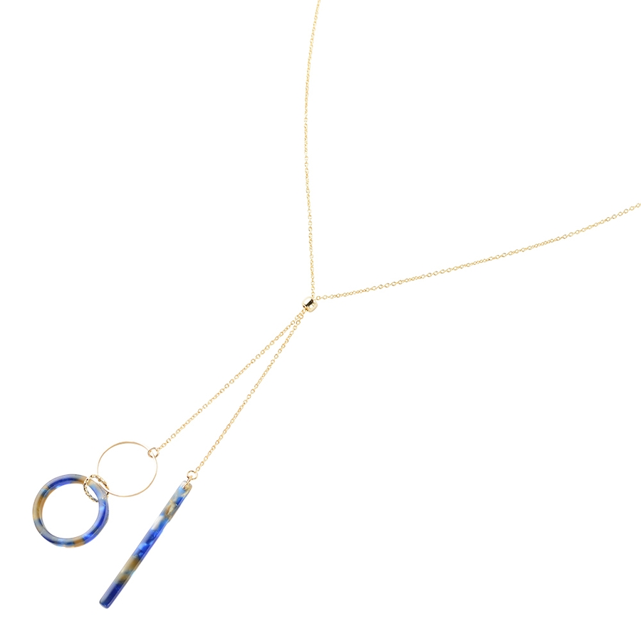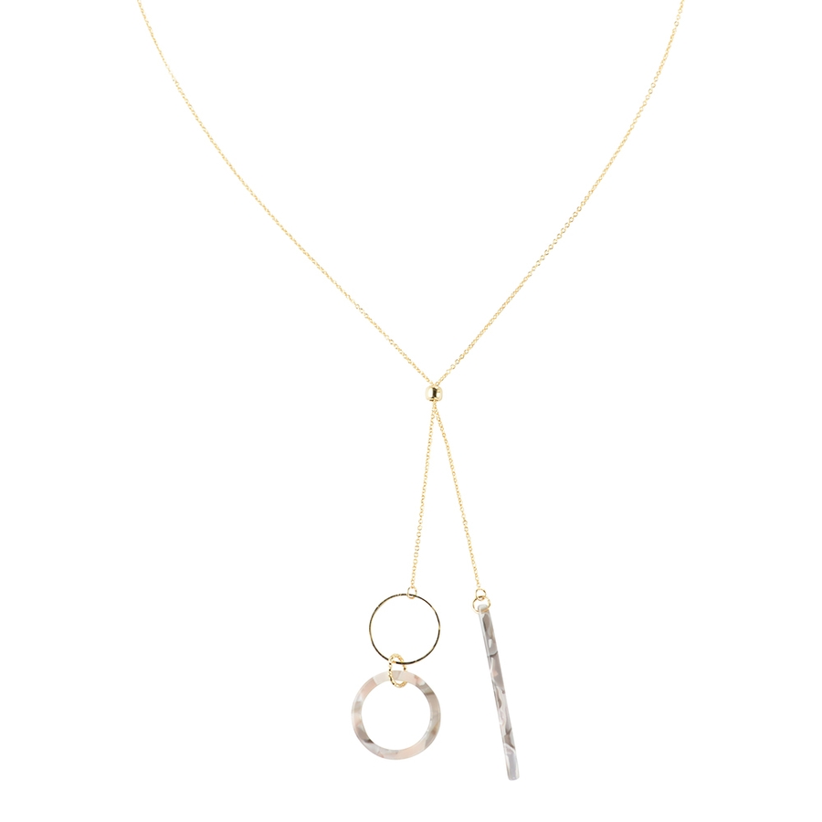 自分の好きな長さにアレンジが楽しめるスライドパーツを使用したネックレス。バーとリングの形をしたマーブル模様のアセチパーツがとってもキュート。どちらかだけを長めに調節すれば左右非対称なスタイリッシュコーデの出来上がり。自在にアレンジを楽しんで。