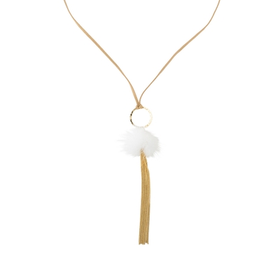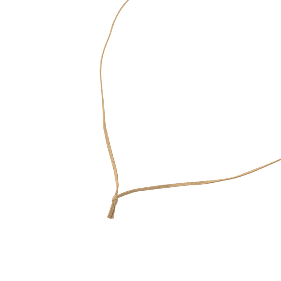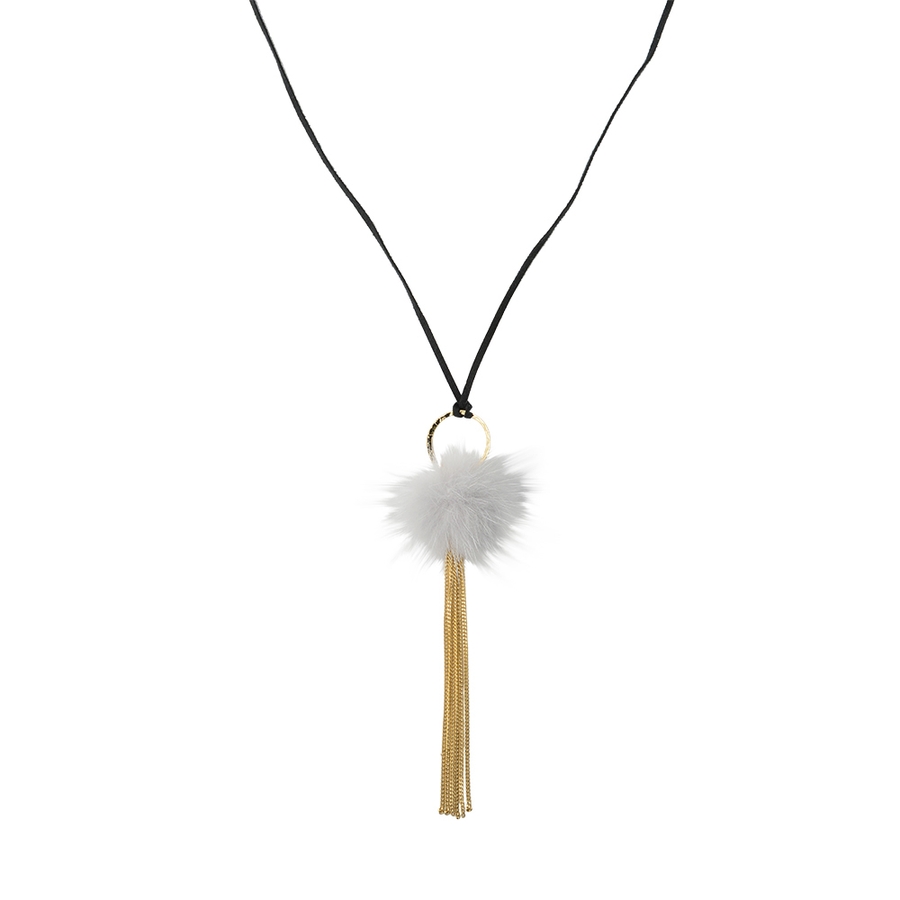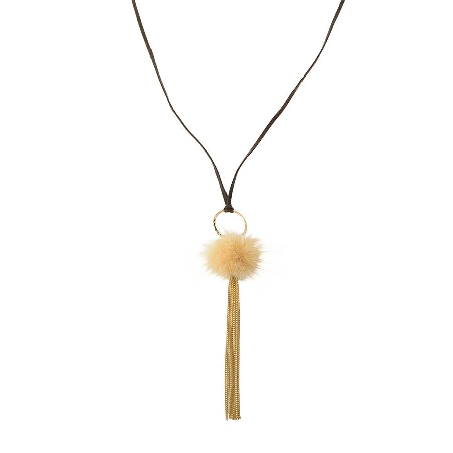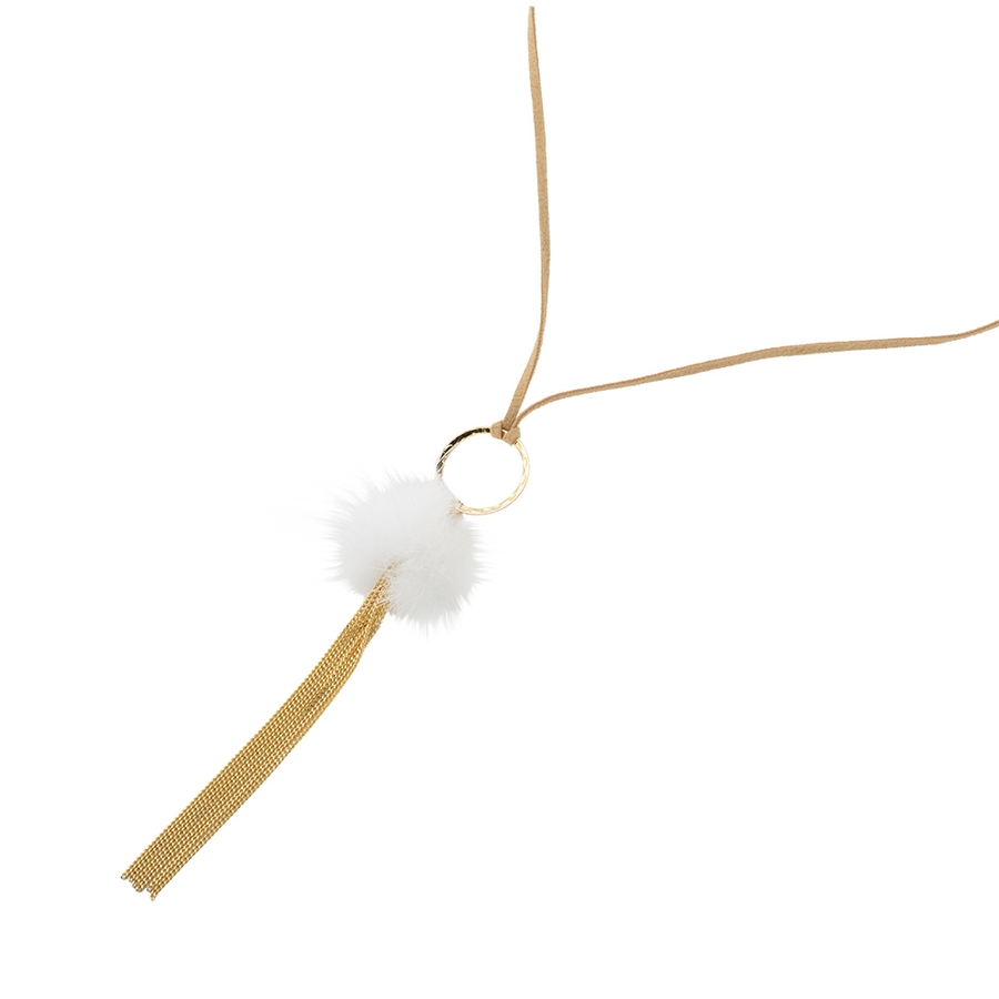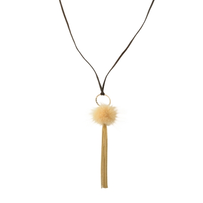 ラグジュアリー感漂うミンクファーにゴールドのリングやチェーンフリンジを組み合わせたネックレス。あえてスエードの紐を使用することで季節感たっぷりの仕上がりに。いつものコーディネートにプラスするだけでもワンランク上の秋冬コーデの出来上がり。