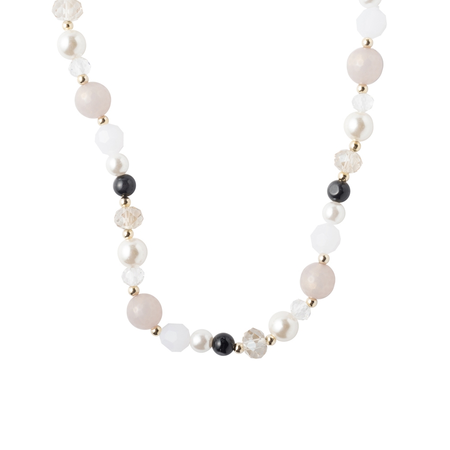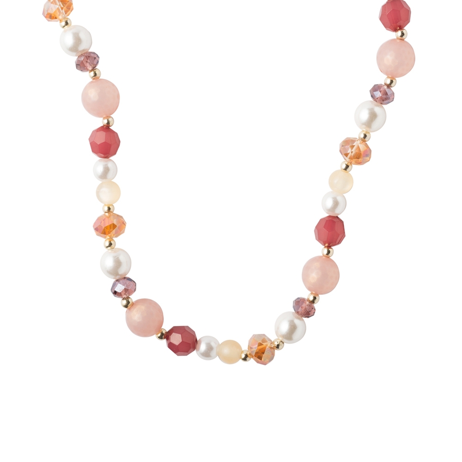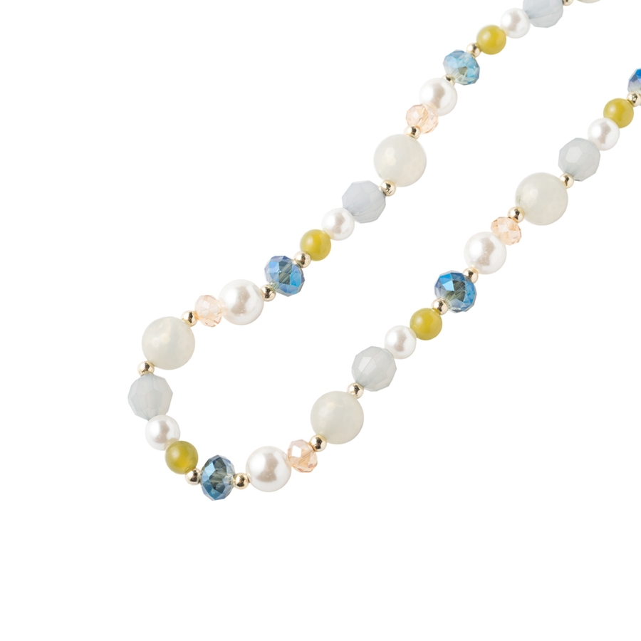 上品に輝くパールや同系色のボール状ビジューを組み合わせたネックレス。華やかな存在感がありながらもチェーン部分は繊細なものを組み合わせることでエレガントな仕上がりに。ほどよいボリューム感でどんなコーディネートにもマッチする便利なアイテム。