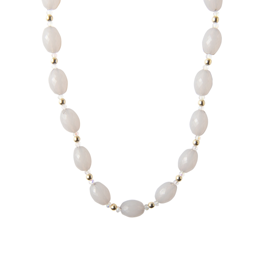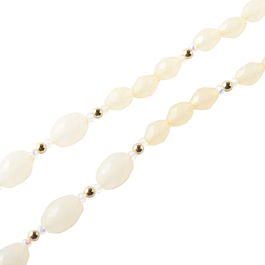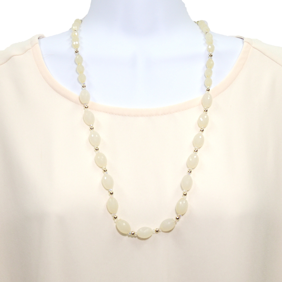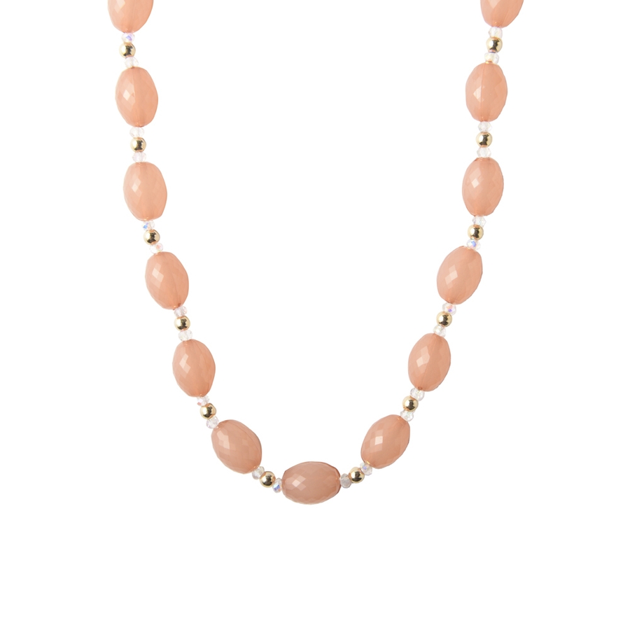 繊細なカッティングを施したパーツを並べたロングネックレス。全面にのみ大きめのパーツをあしらうことでボリューム感をON。シンプルなデザインながら首元に華やかさを演出してくれるアイテム。普段使いからイベントシーンにまで幅広く活躍してくれるハズ。