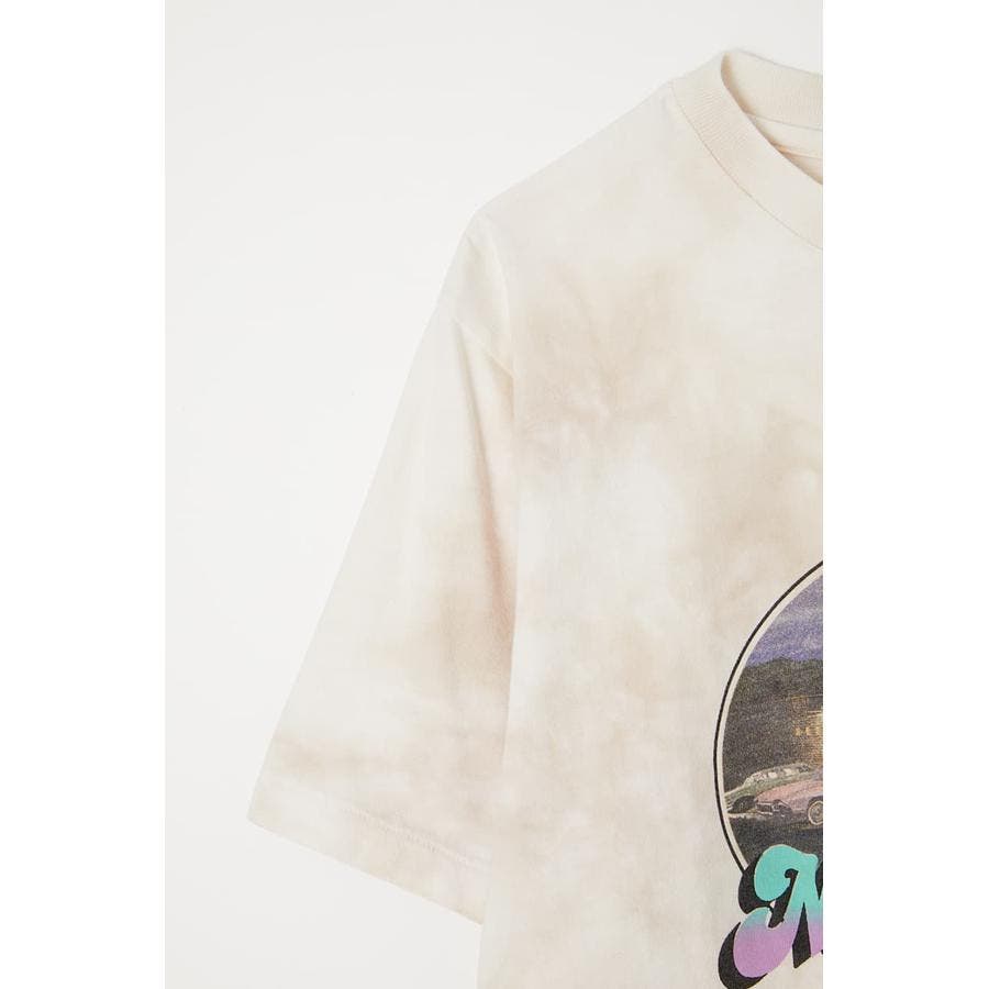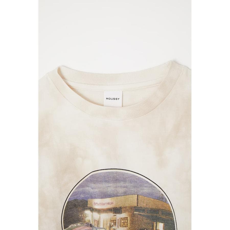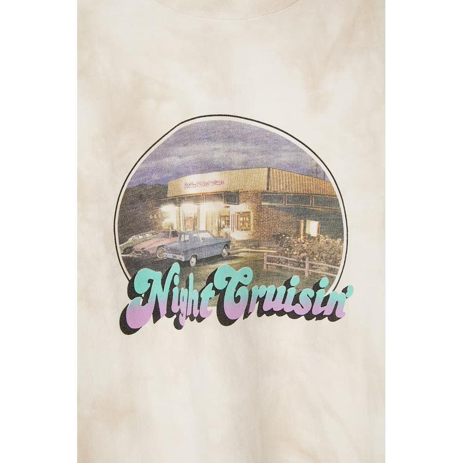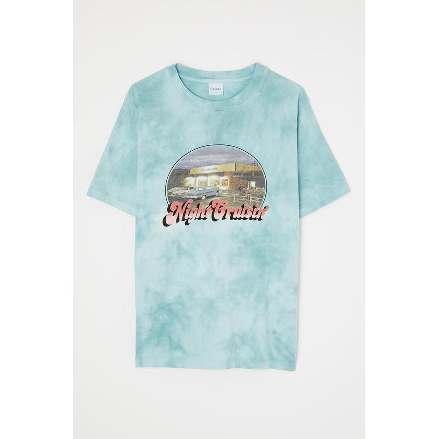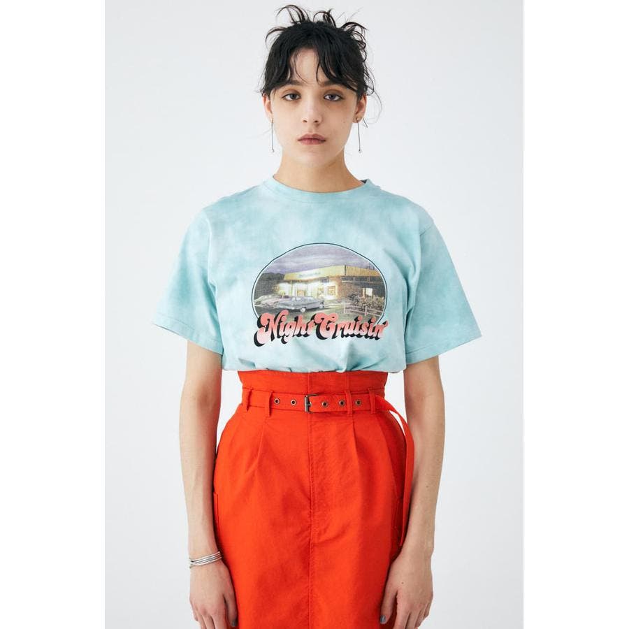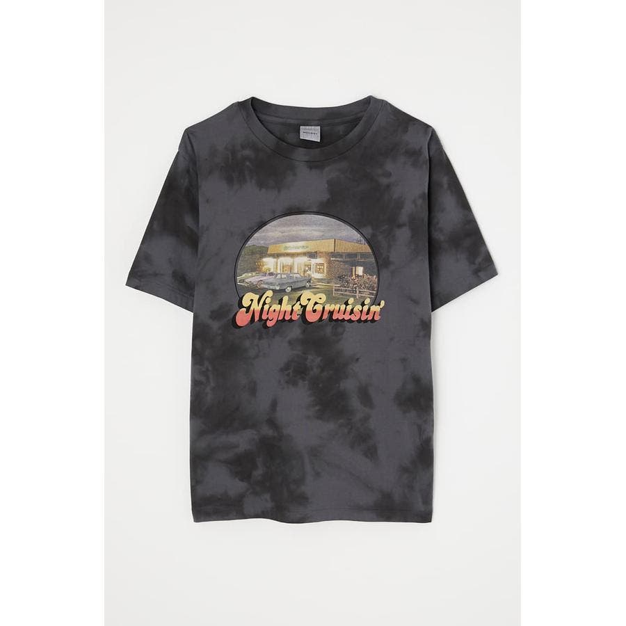 派手すぎない程よいタイダイのボディにプリントの入ったTシャツです。Tシャツが活躍する季節にコーデの主役になってくれる1枚です。(50年代風のダイナーと車のプリントに合わせて「夜に車を走らせる」とういうような意味のフレーズを入れました。)