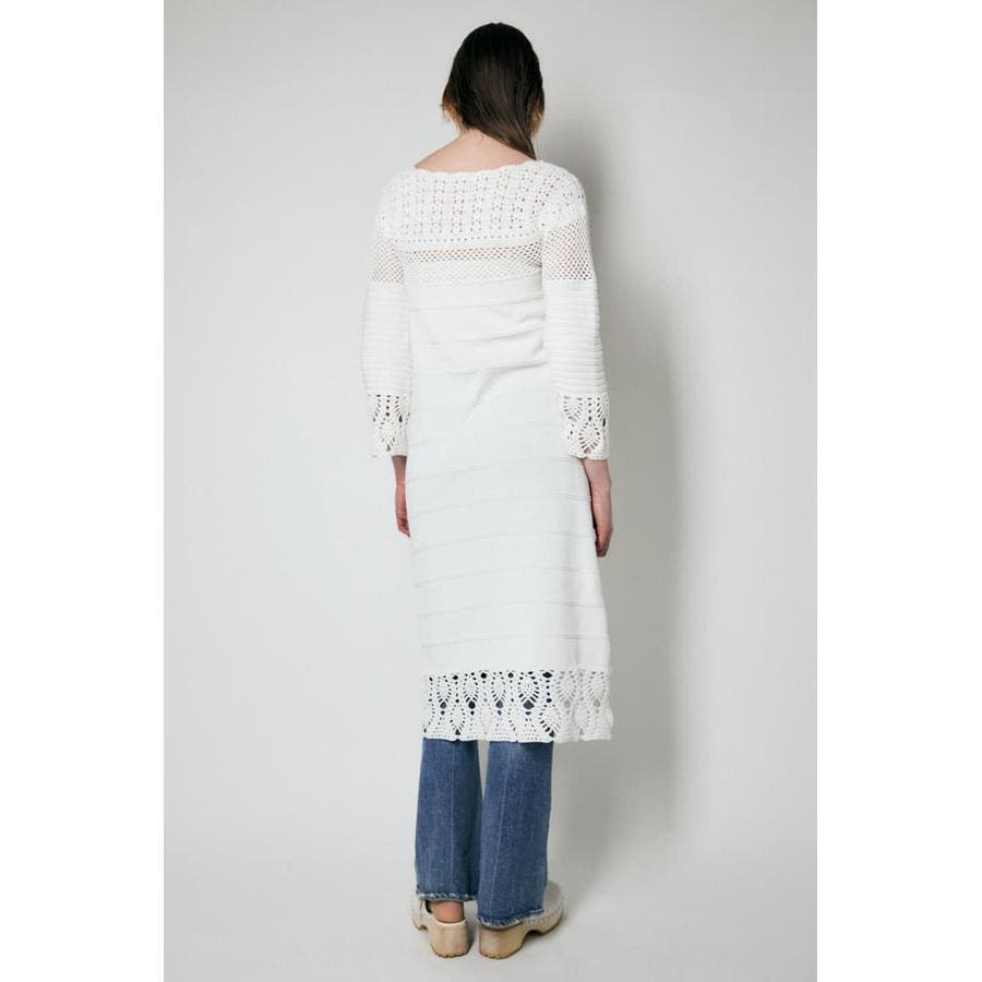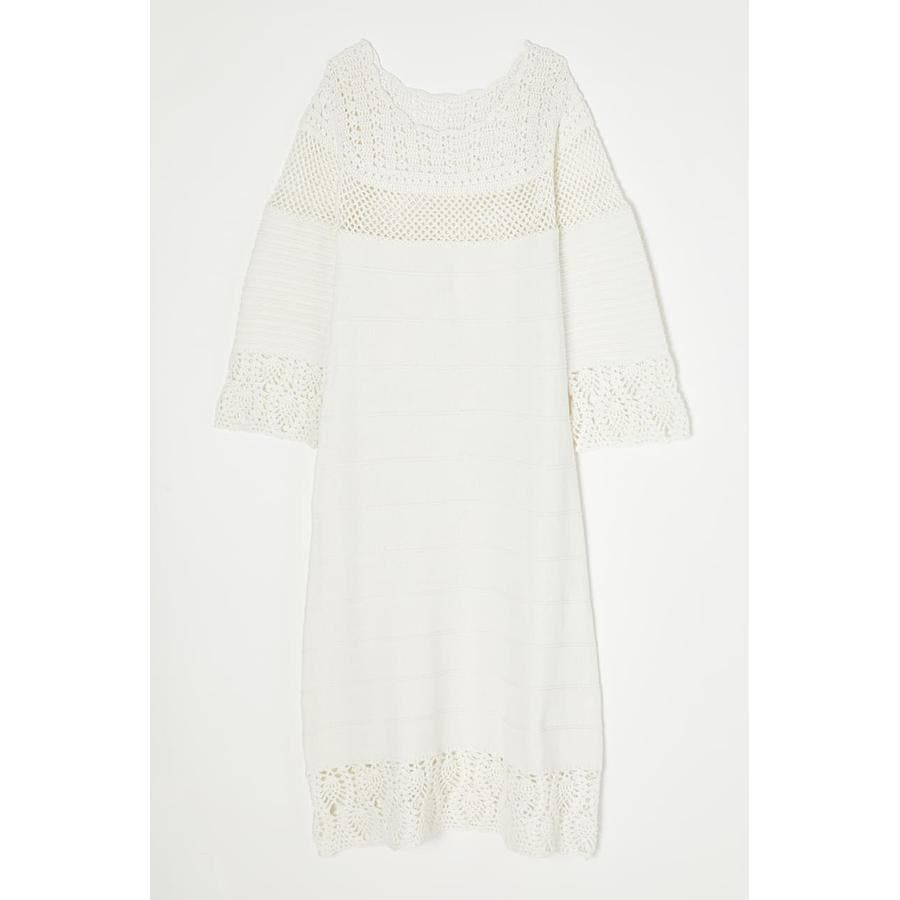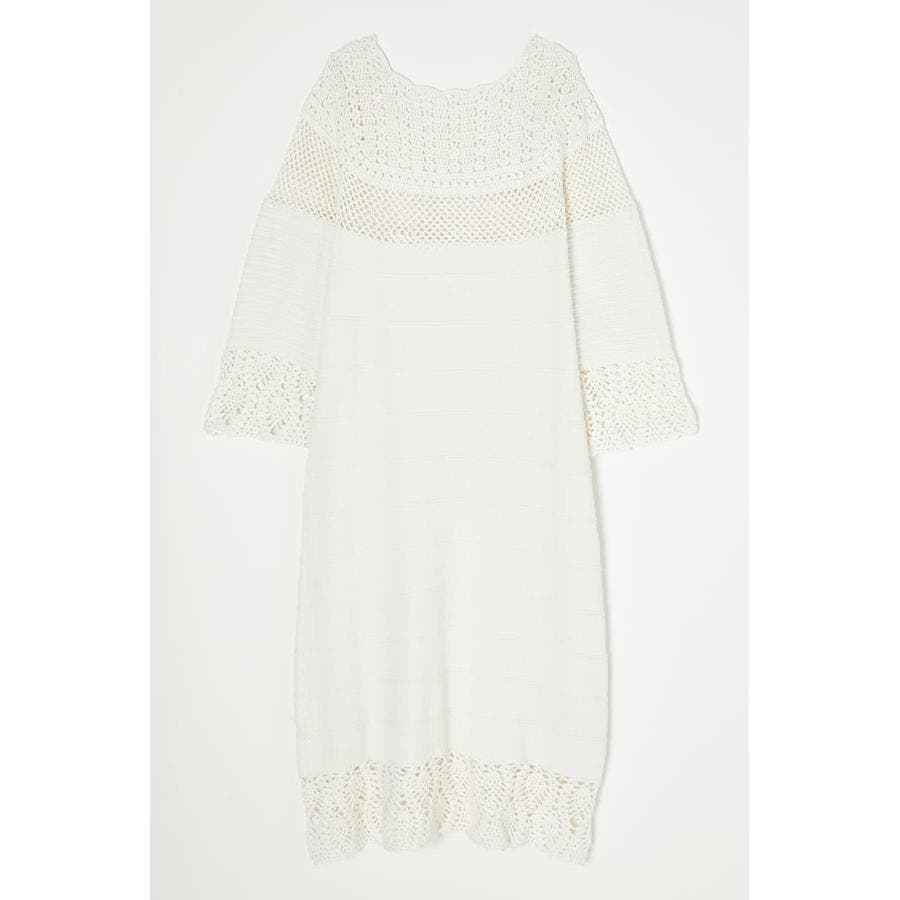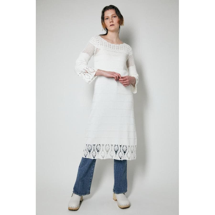 春らしい爽やかな印象のコットンニットワンピース。袖口や裾、首元はかぎ針編みで女性らしく肌を見せるデザイン。一方で身頃はガーター編みなので体のラインを拾いすぎません。ジーンズなどのパンツをレイヤードしてお召しいただくのもおすすめです。
