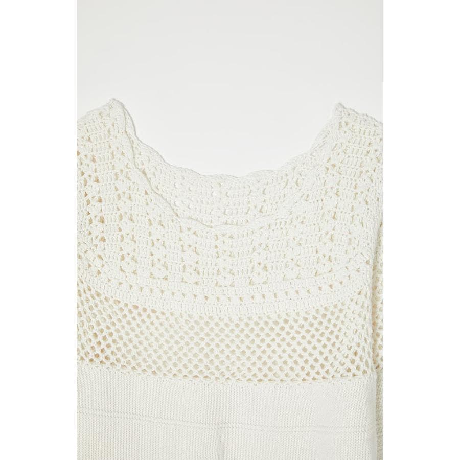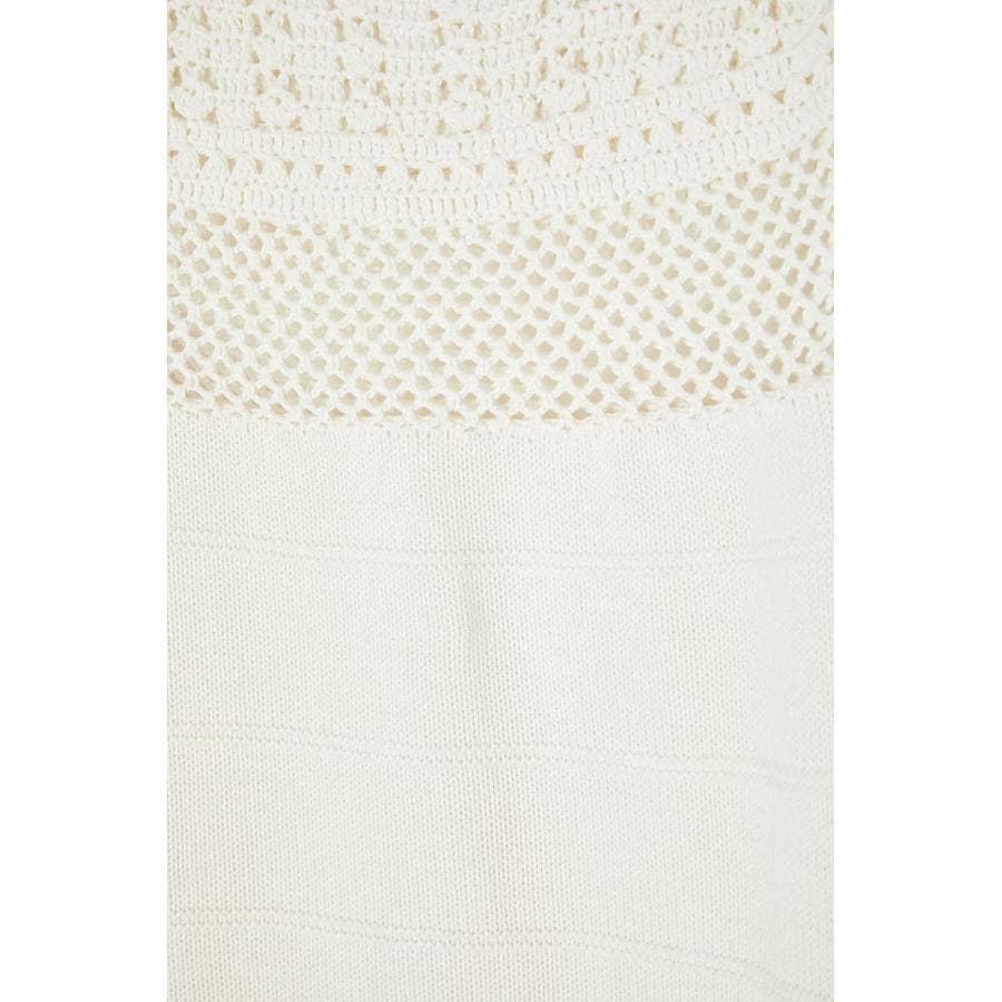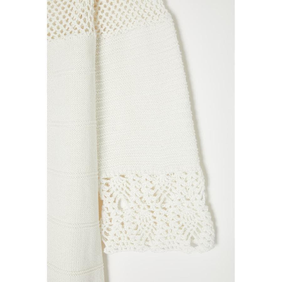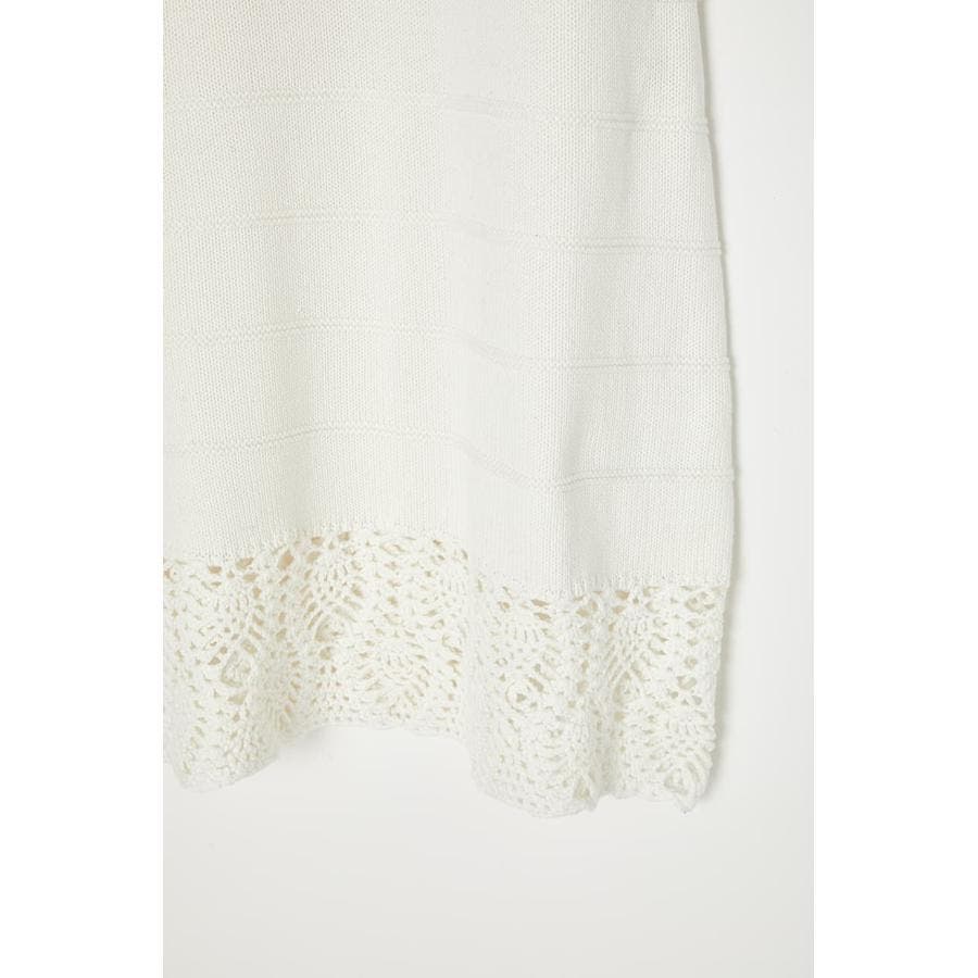 春らしい爽やかな印象のコットンニットワンピース。袖口や裾、首元はかぎ針編みで女性らしく肌を見せるデザイン。一方で身頃はガーター編みなので体のラインを拾いすぎません。ジーンズなどのパンツをレイヤードしてお召しいただくのもおすすめです。