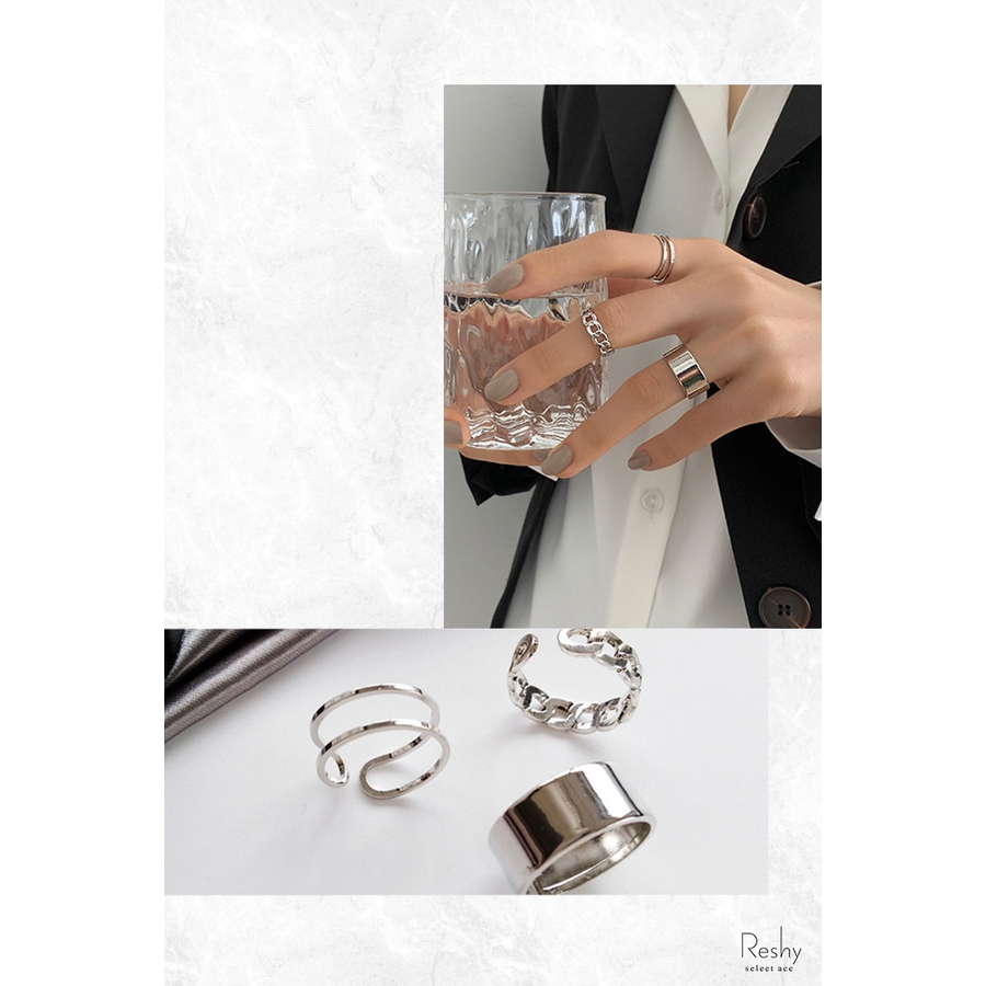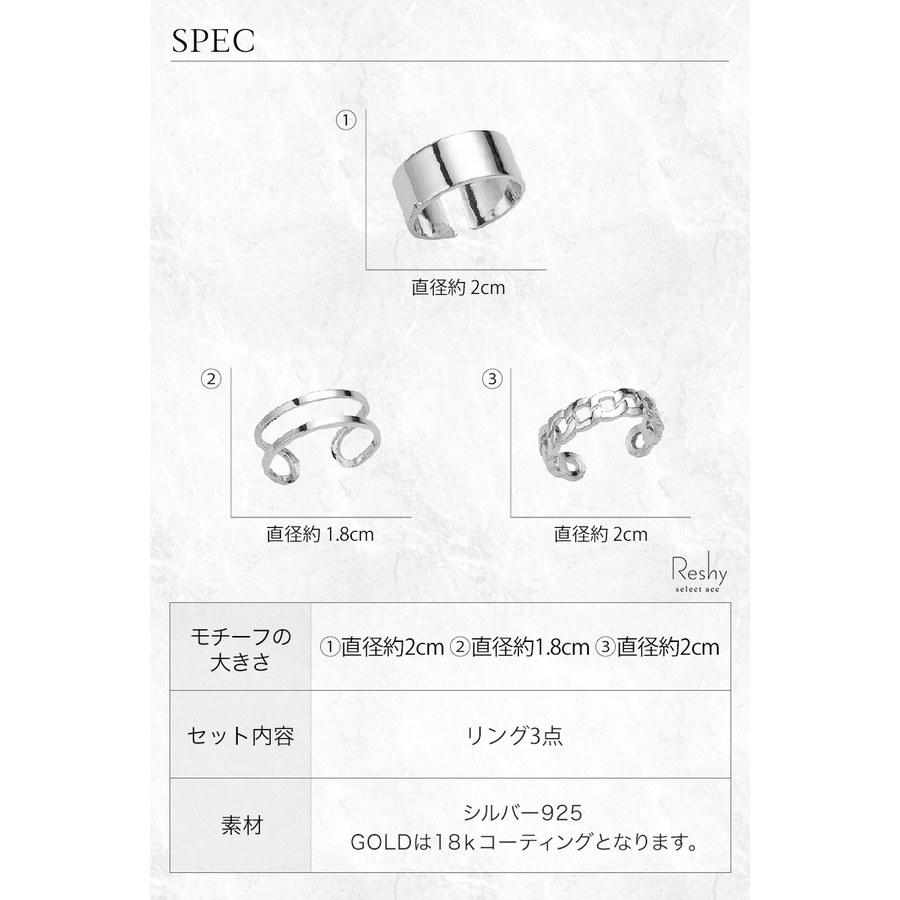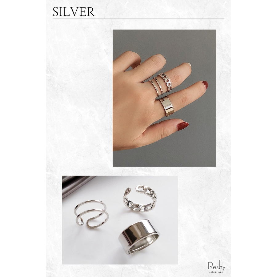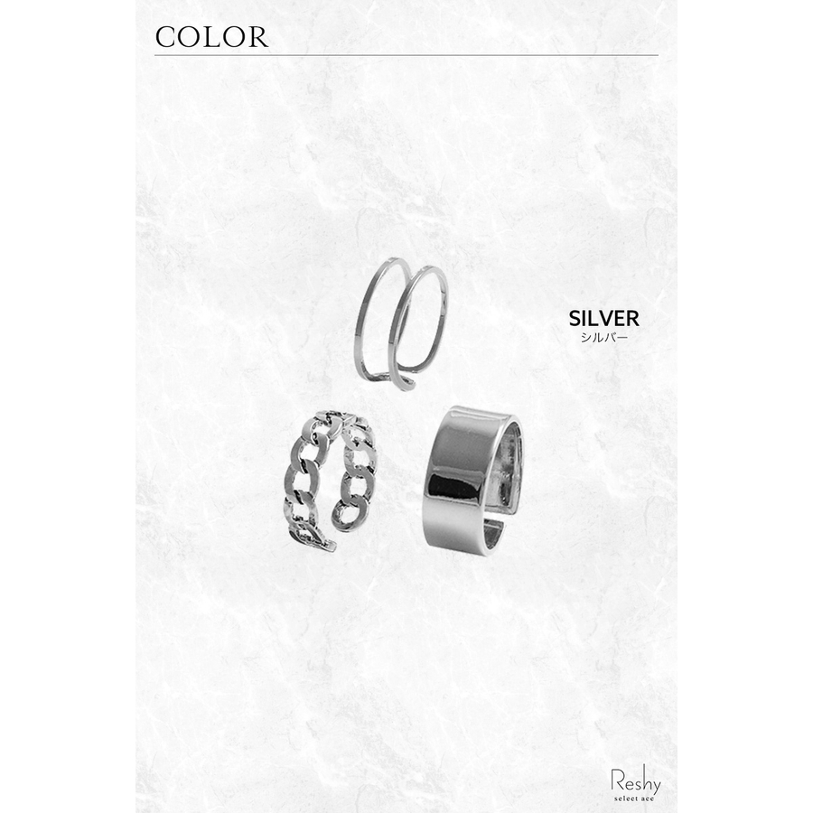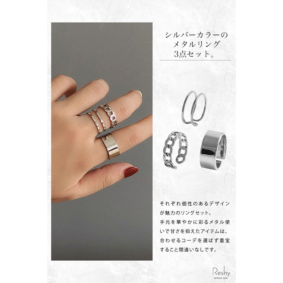 シルバーカラーのメタルリング3点セット。