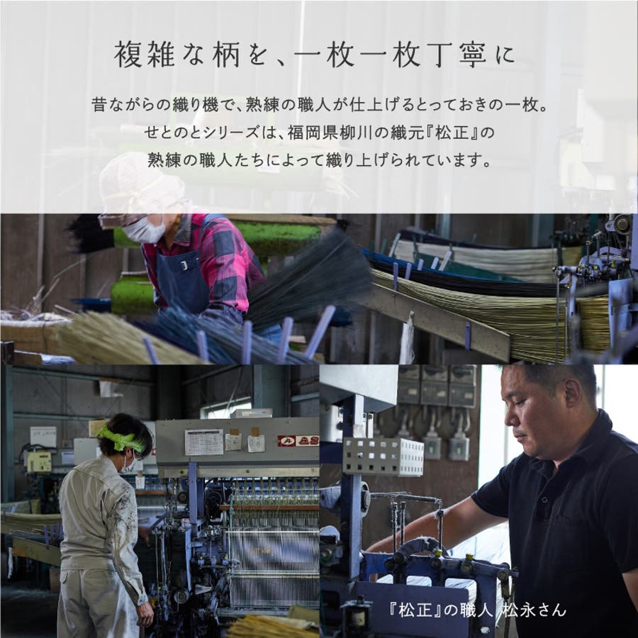 国産い草を100%使用し、日本の職人が丁寧に織り上げた純国産品。経糸の数が多いため、細かい文様を繊細に表現できる三重織(袋織)で織り上げています。い草三層構造になているため、重厚で壮美な仕上がりです。