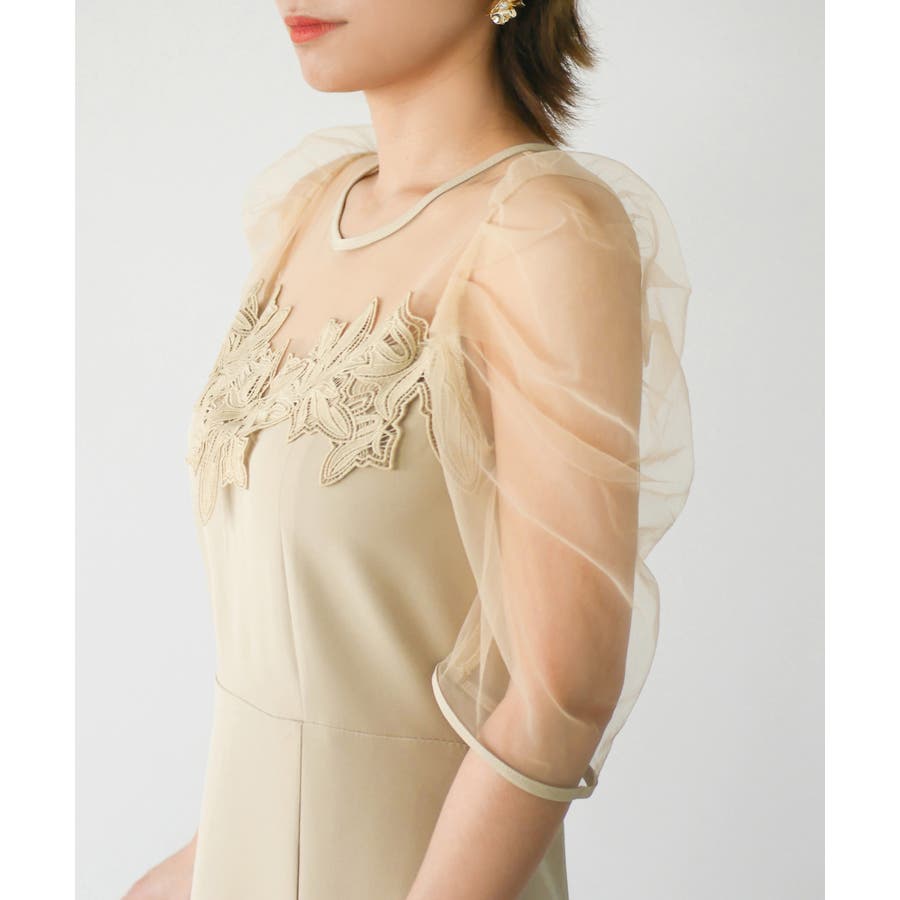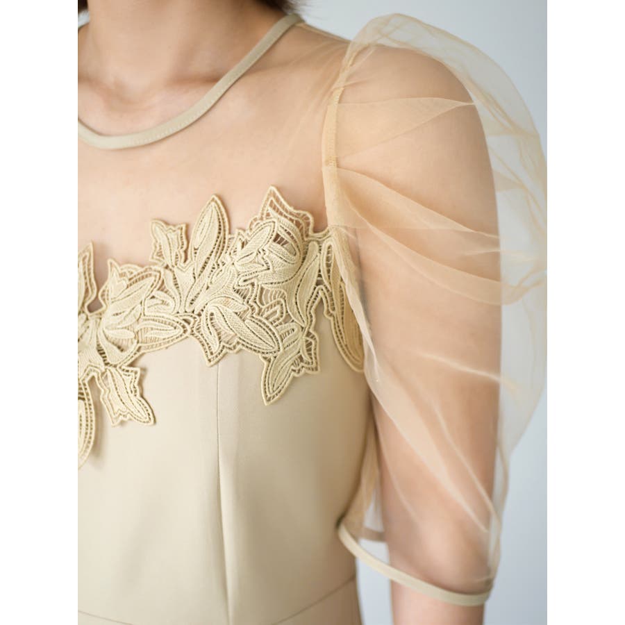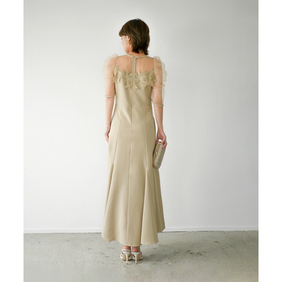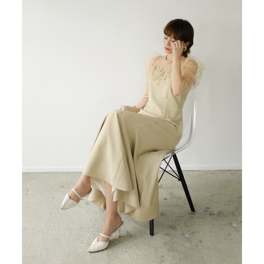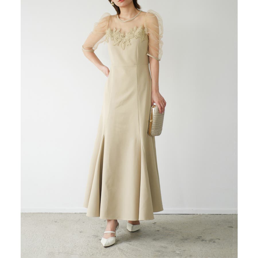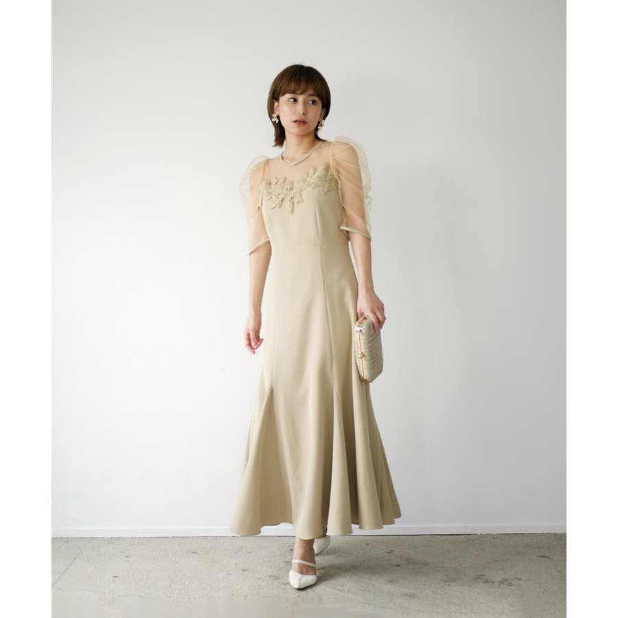 繊細なチュールからほのかに透ける肌が抜け感演出に効いて、ロングでも重たくない華やかな装いへとリードしてくれます。