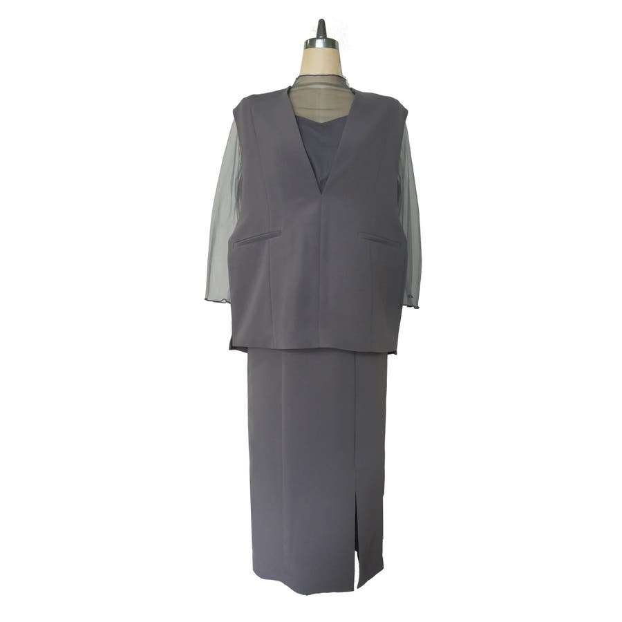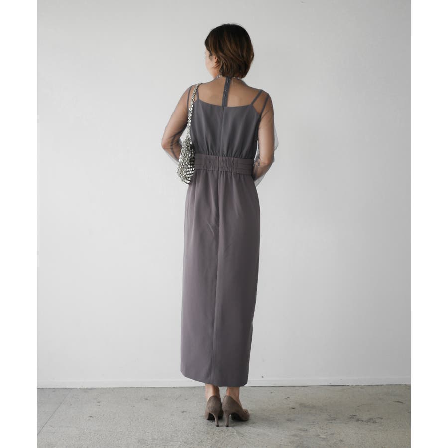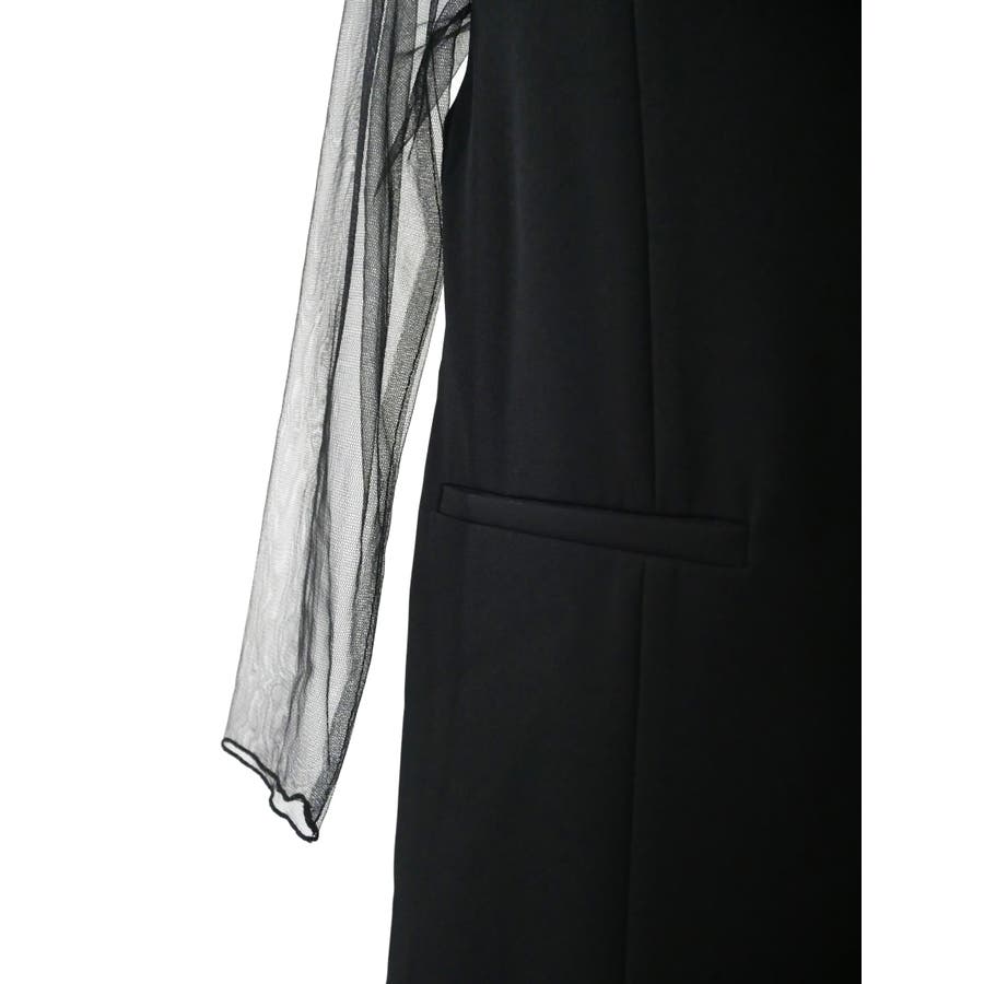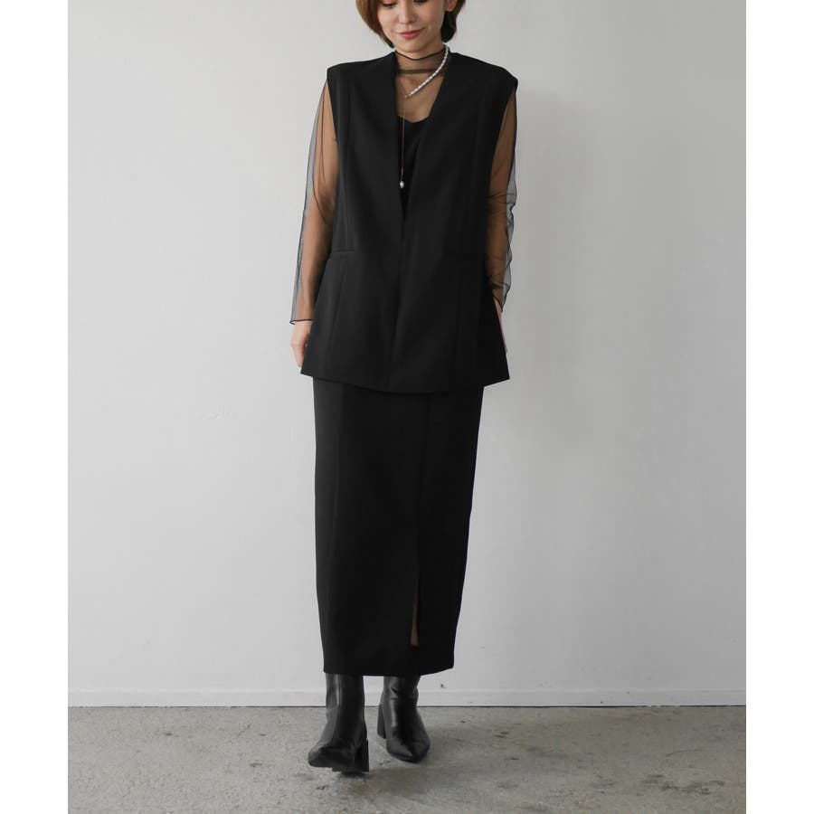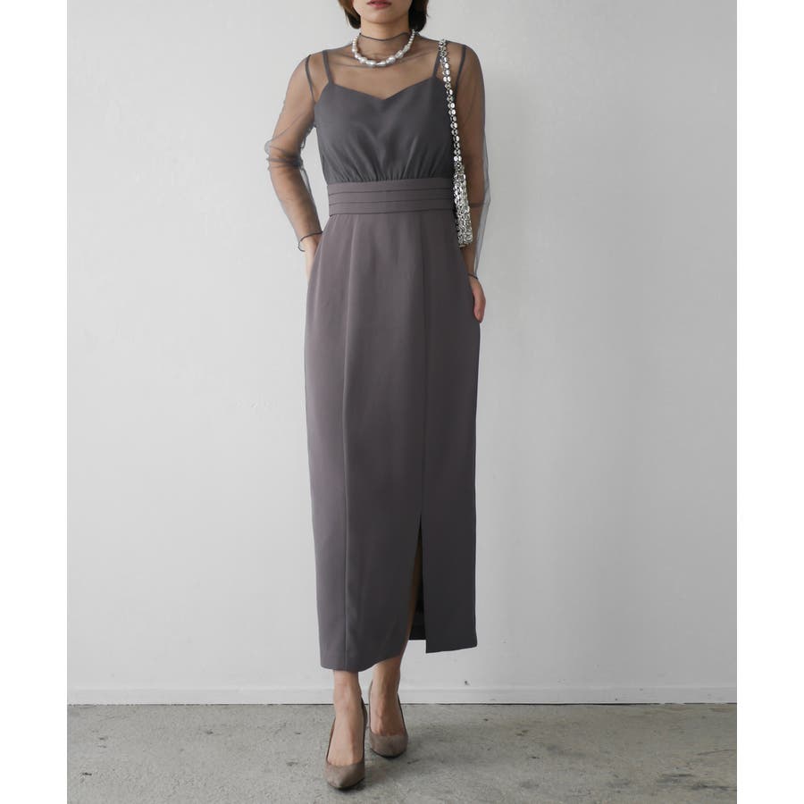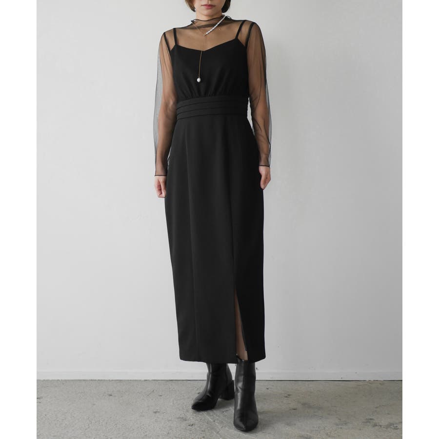 全体的にきれいめな印象を出しつつ、インナーワンピースのシアー袖がグッとエレガントに見せてくれる1枚です。