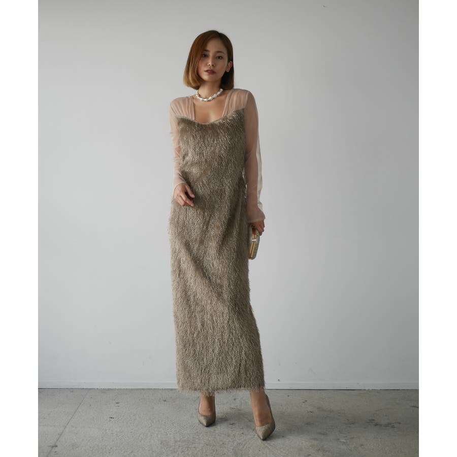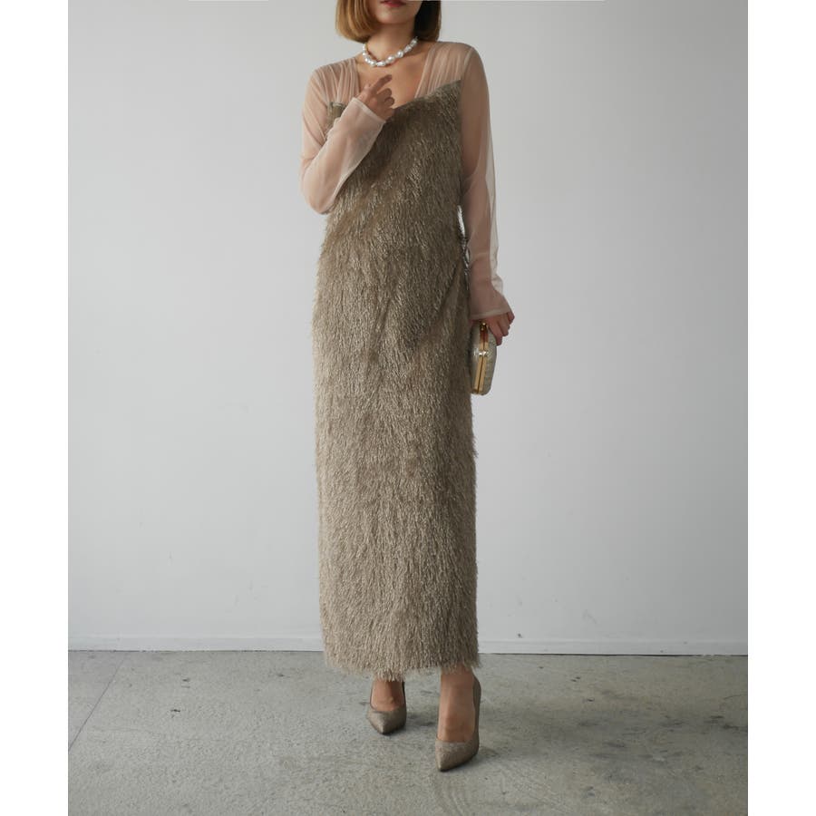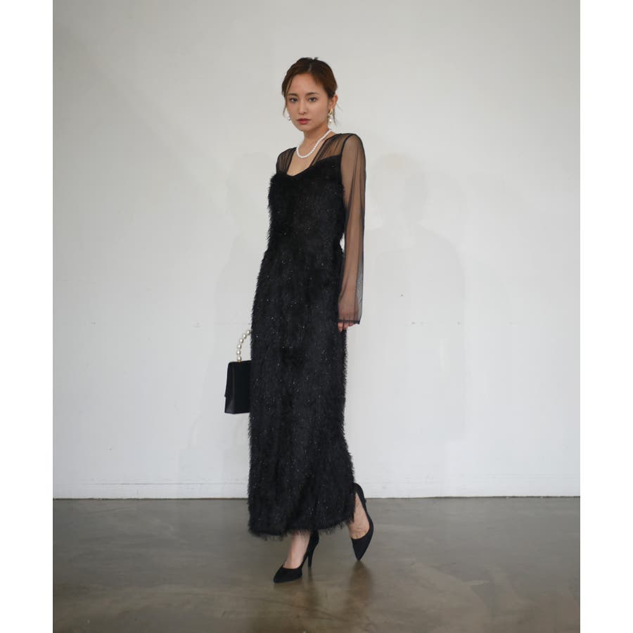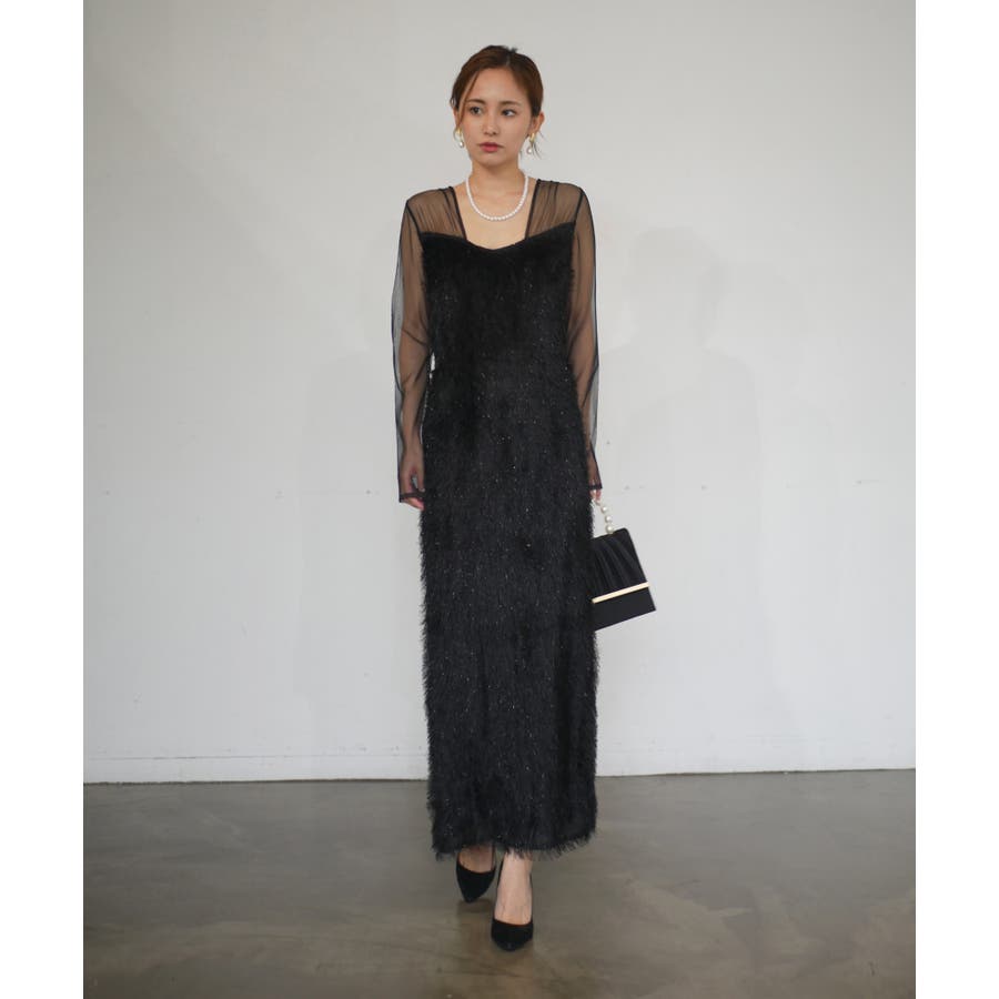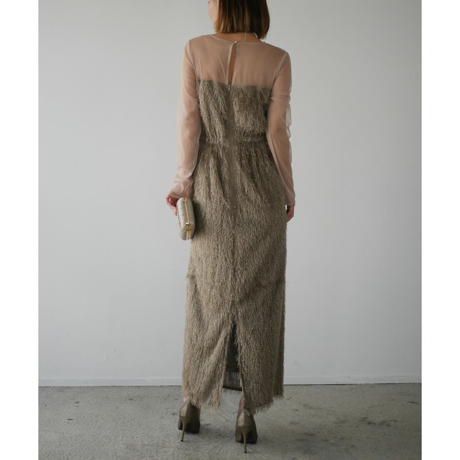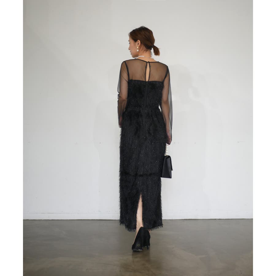 高級感のあるラメフリンジに、透け素材をドッキングした上品な印象のワンピース。