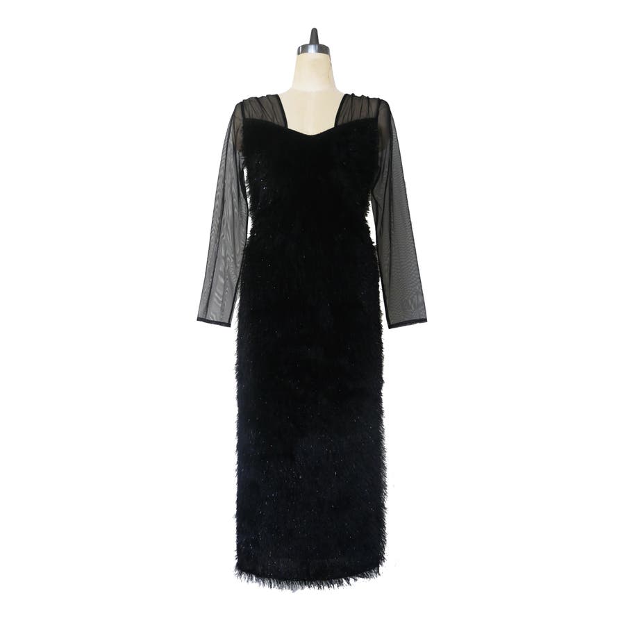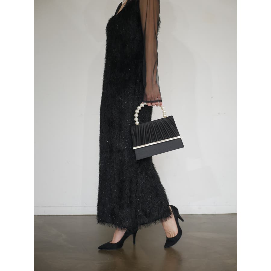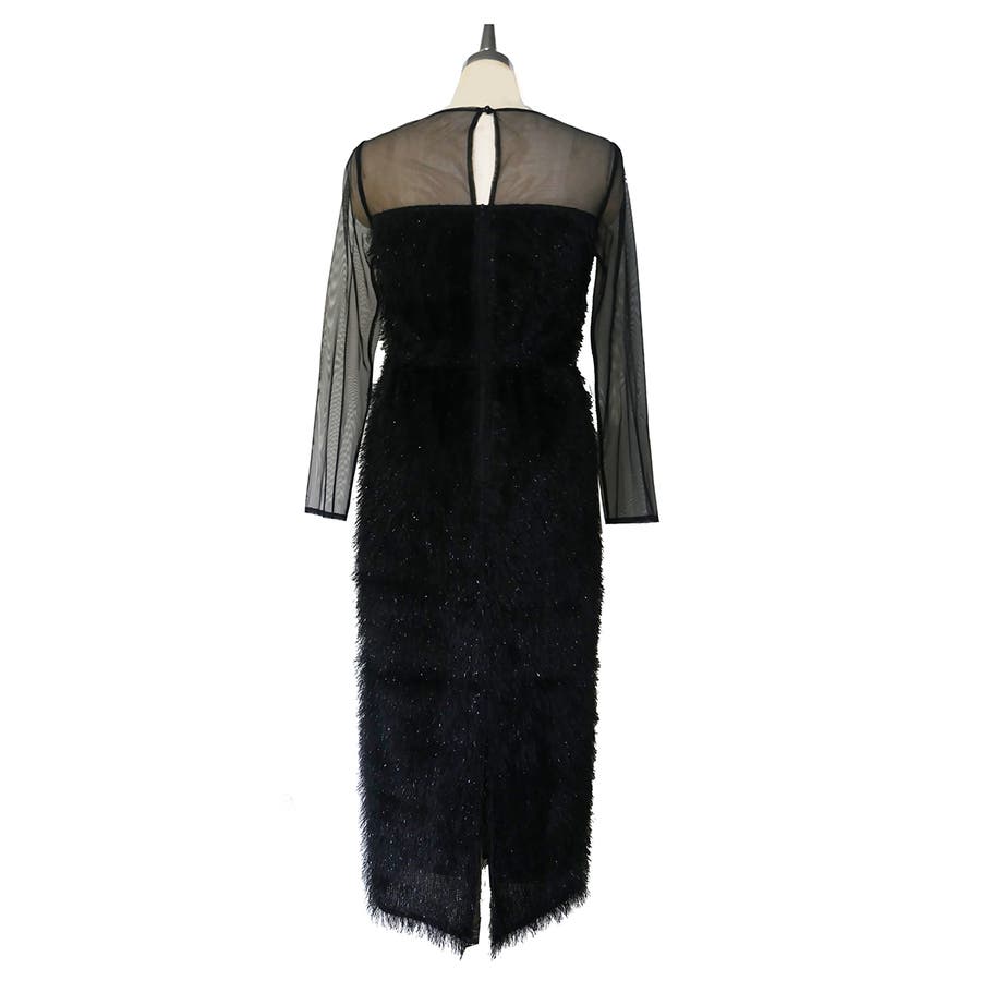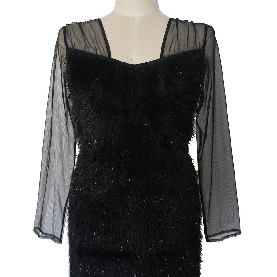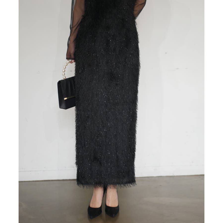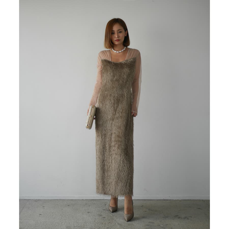 高級感のあるラメフリンジに、透け素材をドッキングした上品な印象のワンピース。