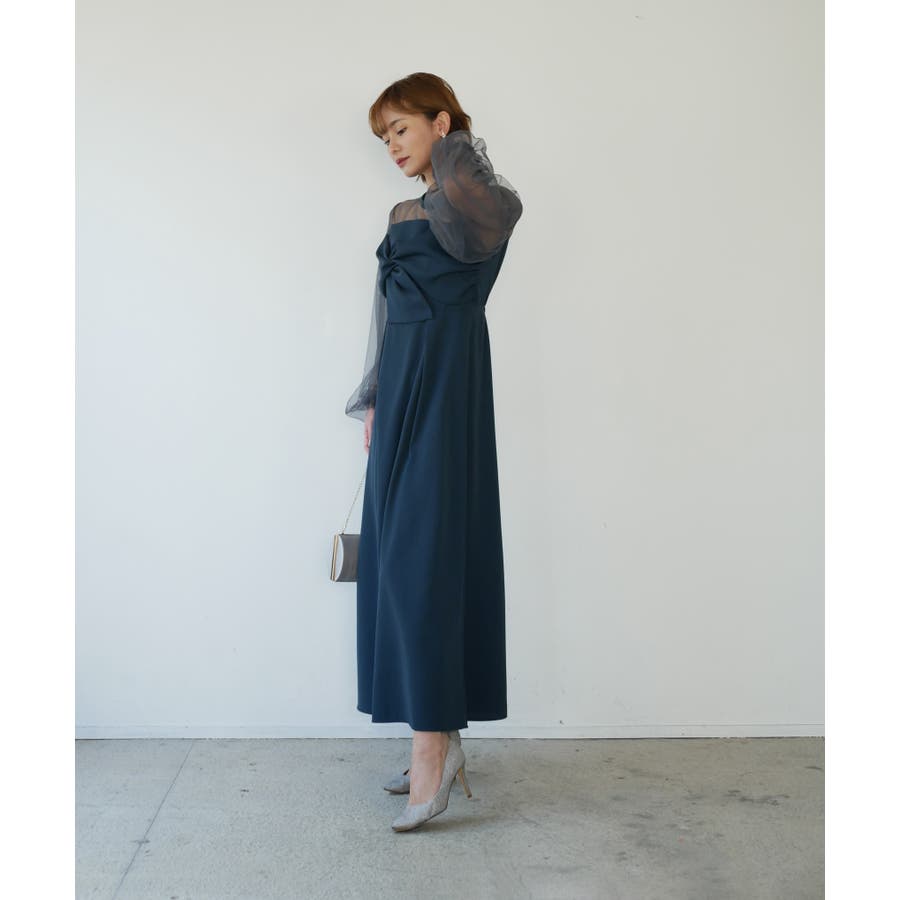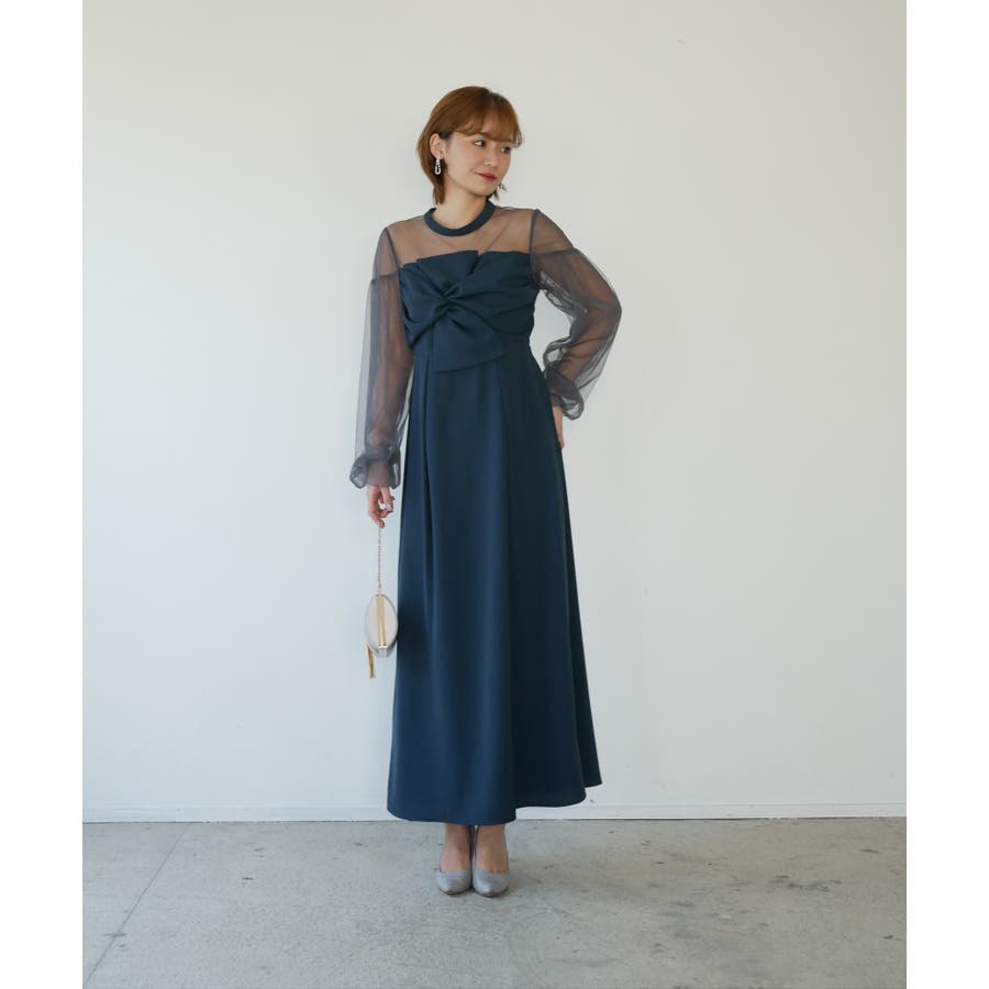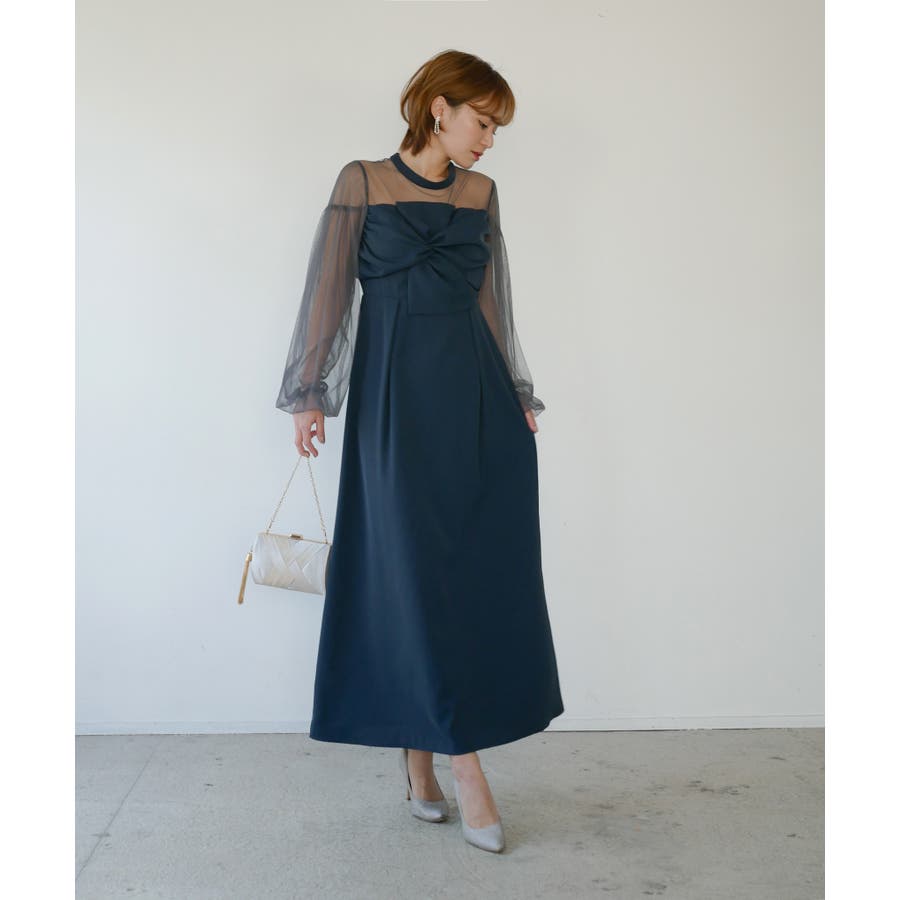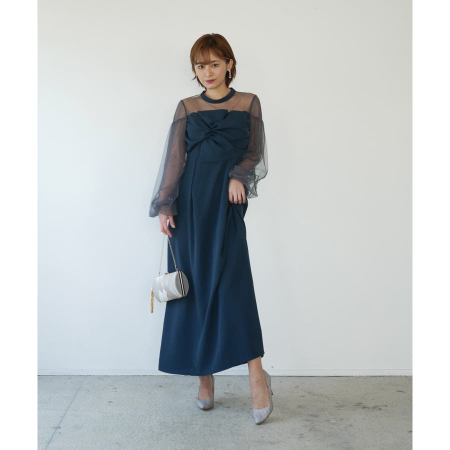 シンプルな袖シアードレスは胸元のツイストリボンデザインでアクセントをプラス。