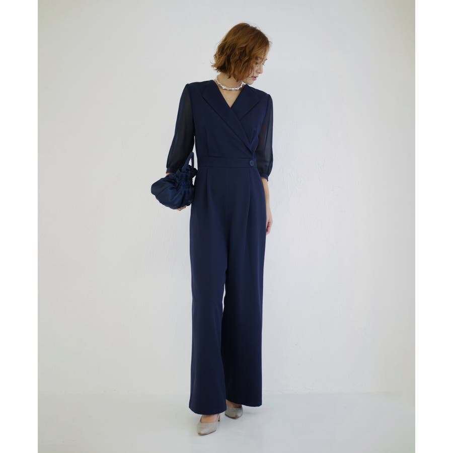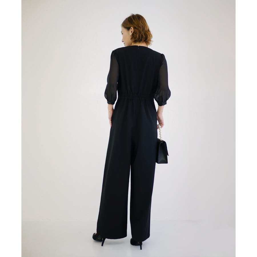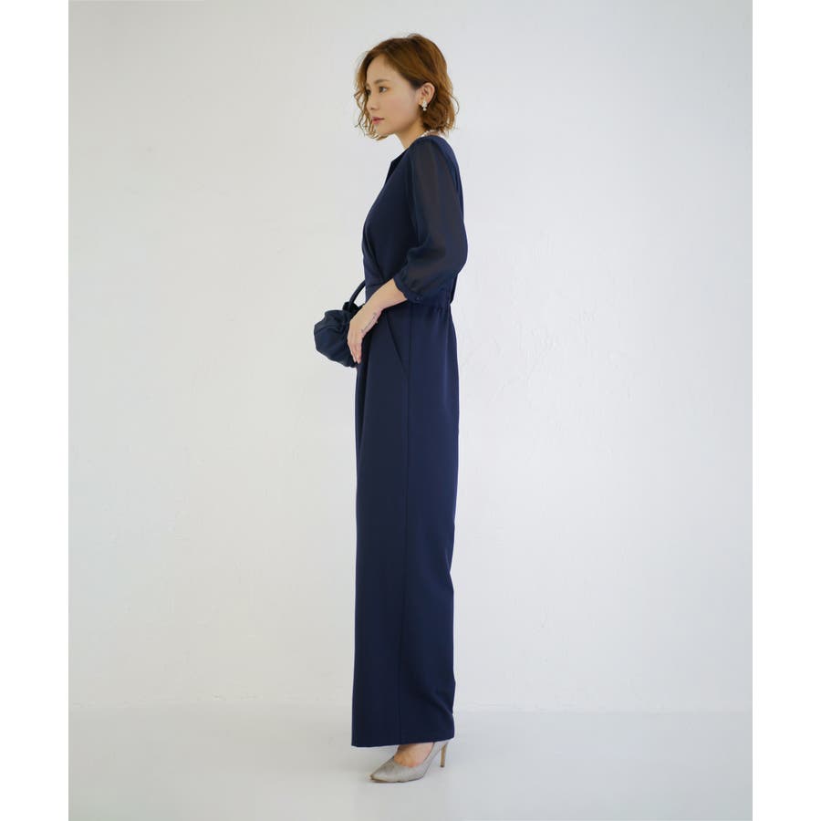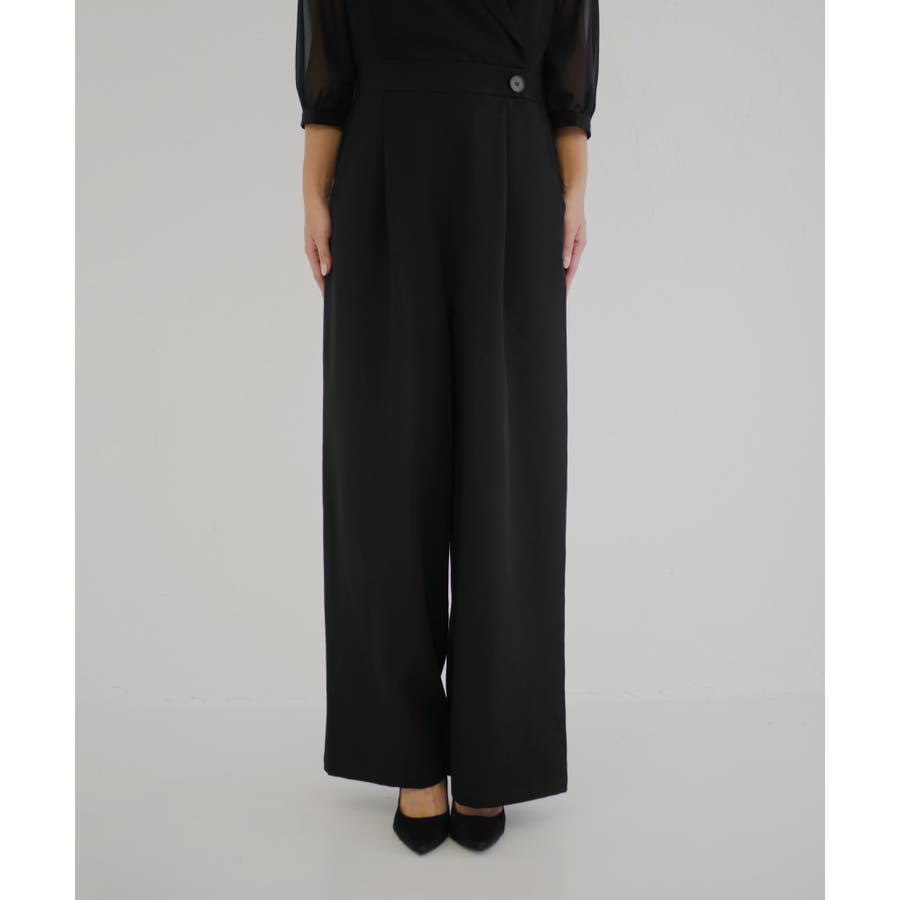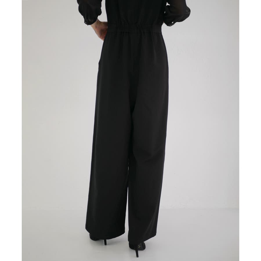 一見ゆったりしたシルエットに見えますが、ウエスト位置を高めに設定し引き締めることでオールインワンでもスタイルアップした見栄えに。