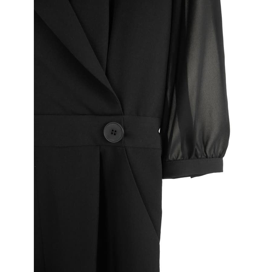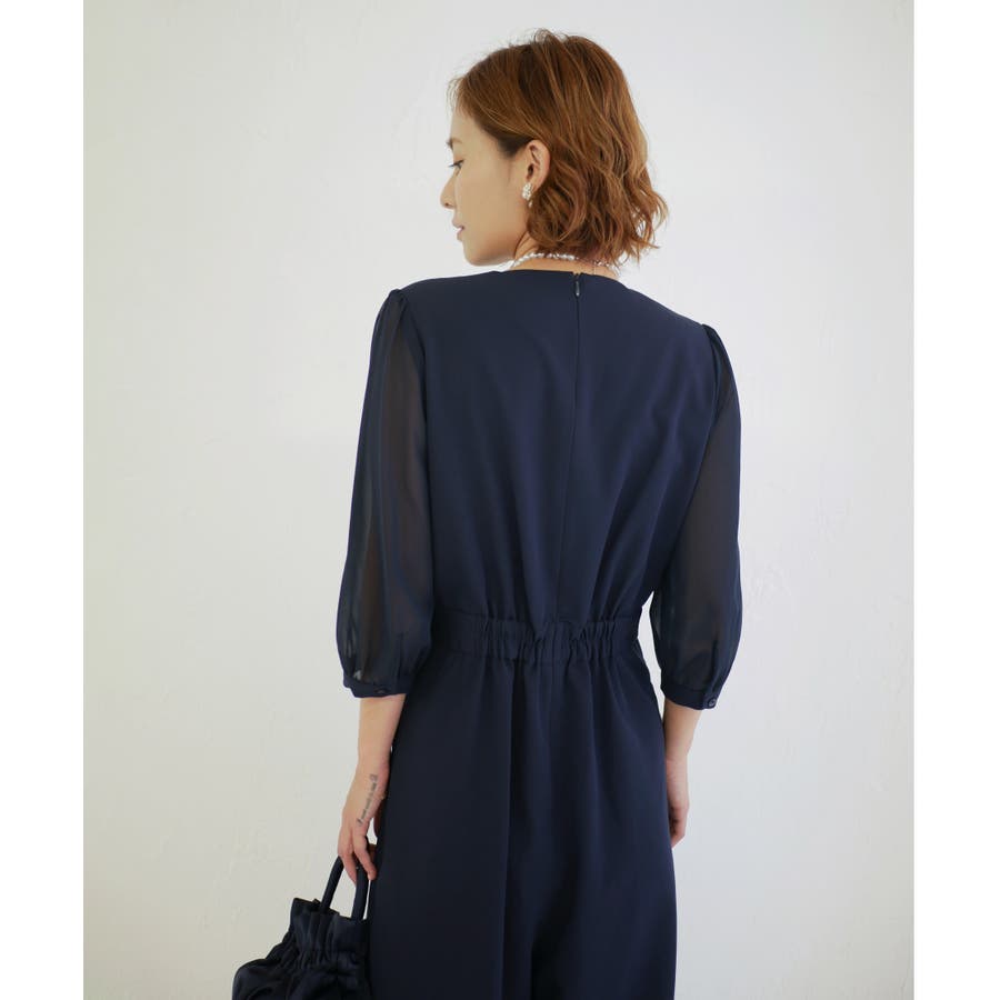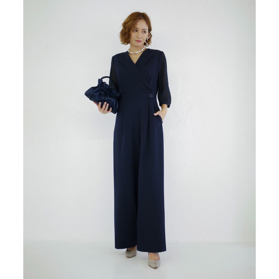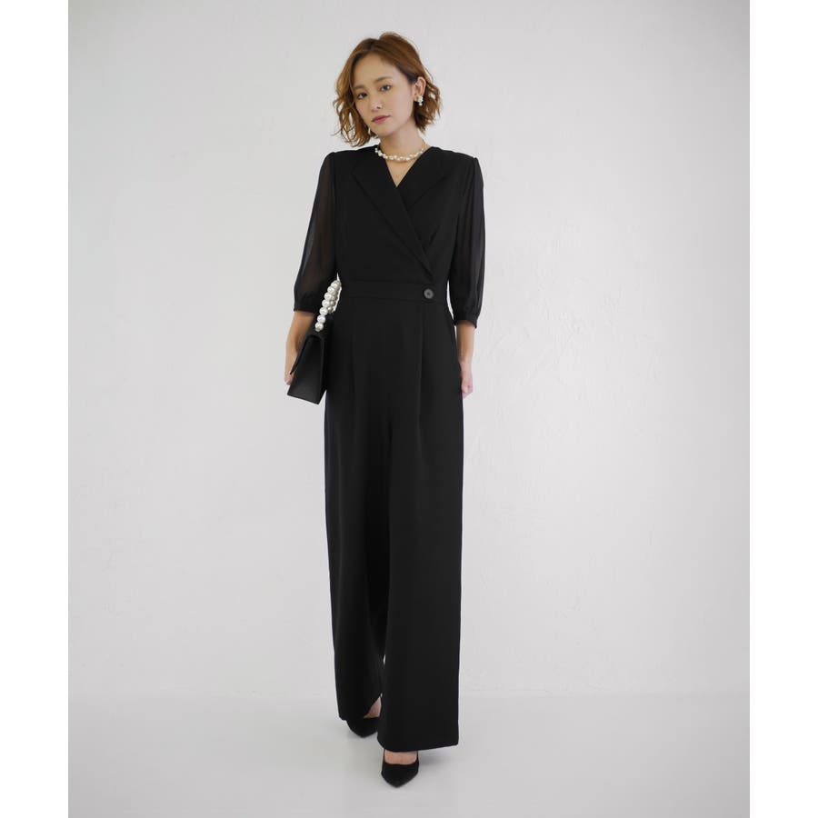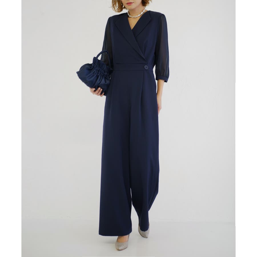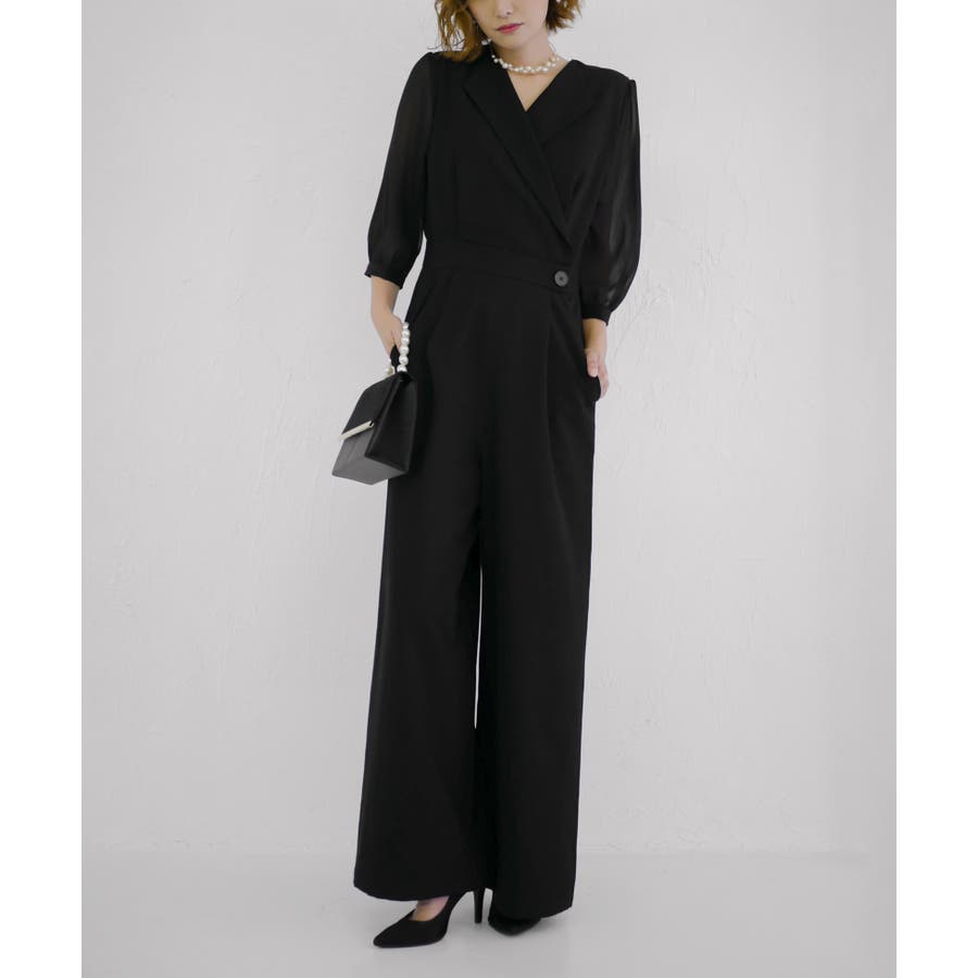 一見ゆったりしたシルエットに見えますが、ウエスト位置を高めに設定し引き締めることでオールインワンでもスタイルアップした見栄えに。