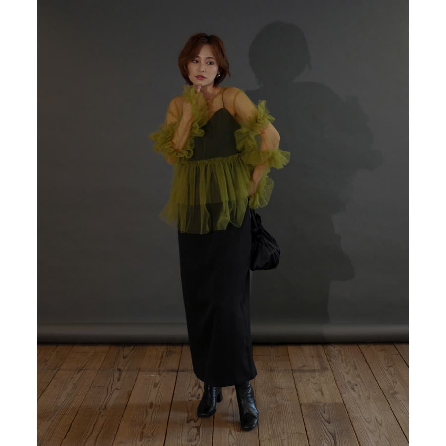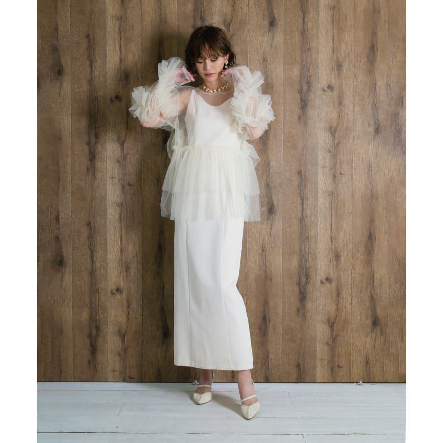 a2412001 frill tule top とレイヤードして結婚式などのオケージョンシーンでご着用いただくのもおすすめ。